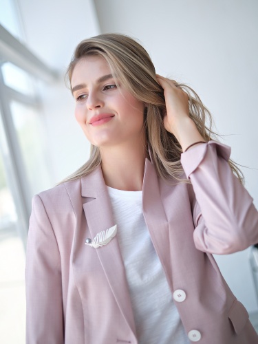 Изящная брошь в виде перышка с контрастным искусственным жемчугом. Добавит образу женственность и невесомость.