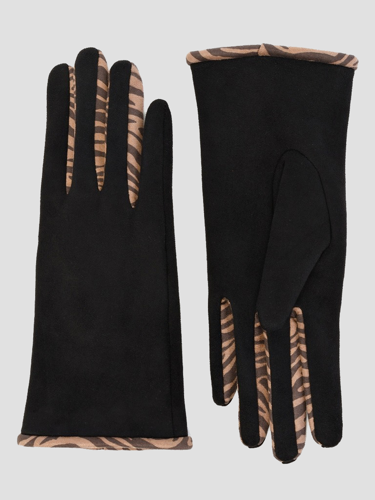 Модель выполнена с тонкой и теплой подкладкой из флиса. Отделка - контрастные вставки между пальцами и по краю манжеты с анималистичным принтом. Длина манжеты от нижней точки большого пальца до края перчатки - 6 см. Длина пальцев - средняя.