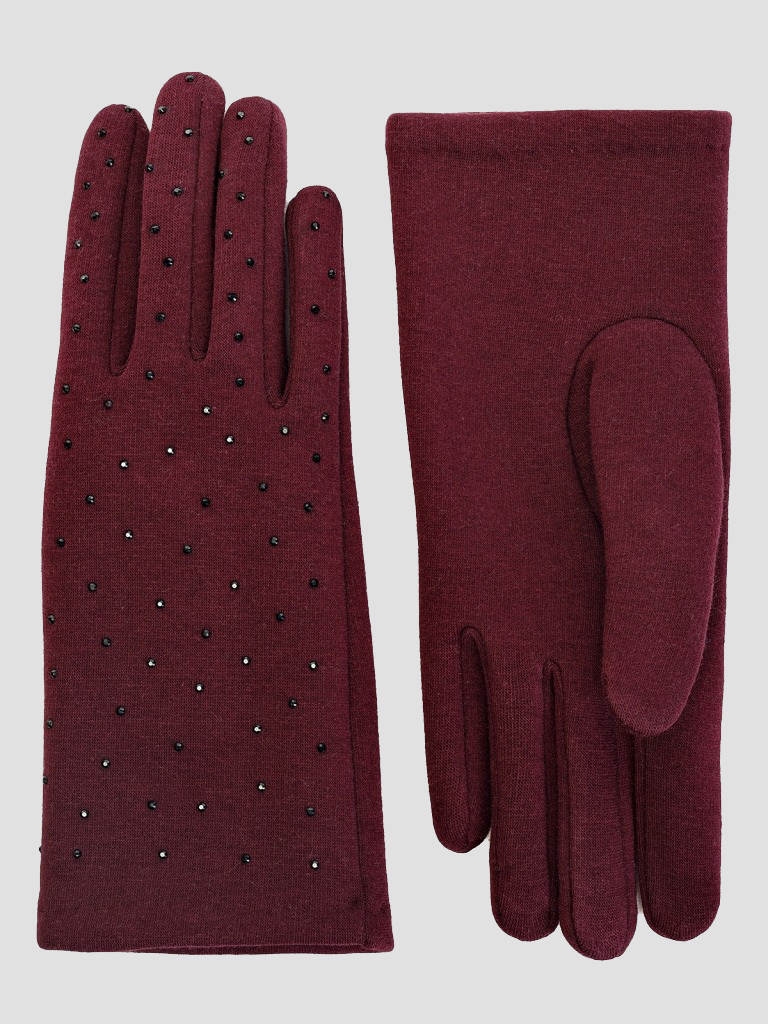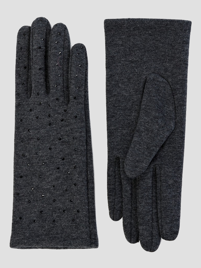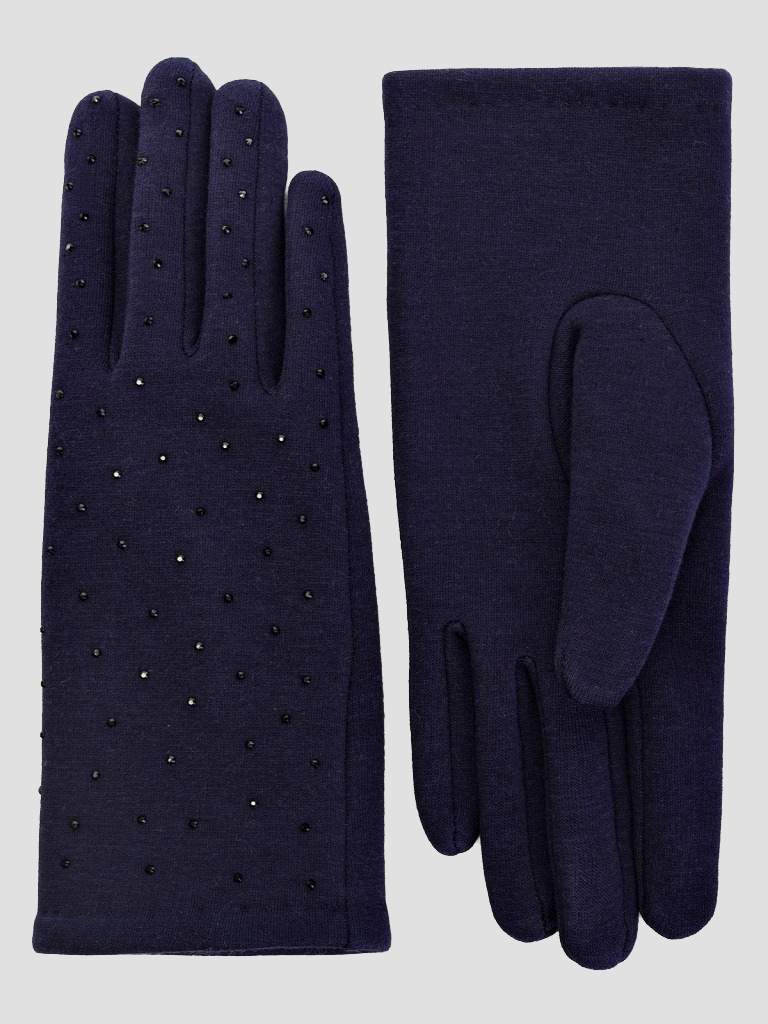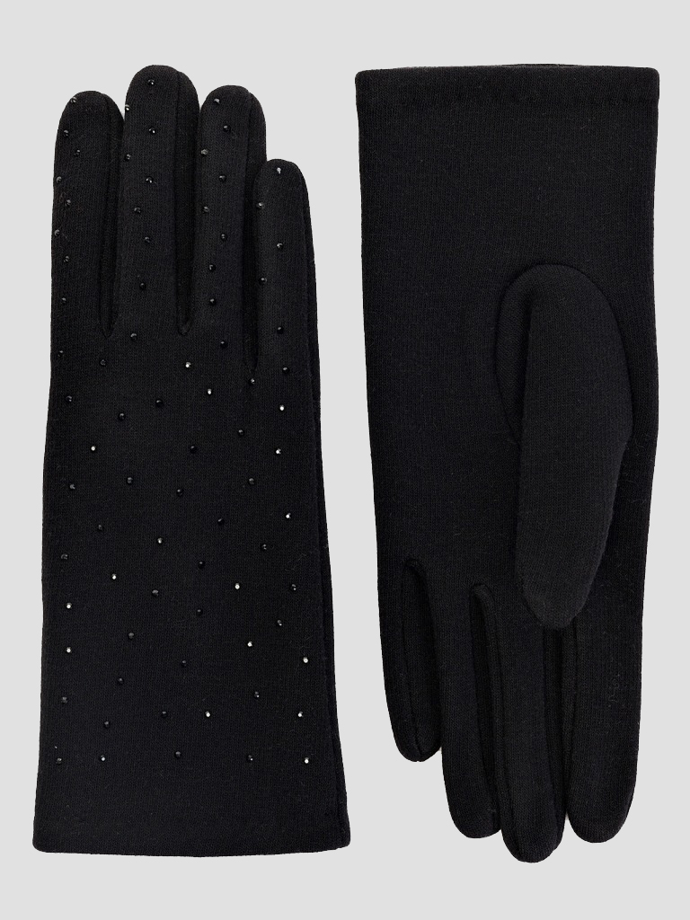 Модель выполнена с тонкой и теплой подкладкой из флиса. Отделка - лицевая сторона украшена россыпью страз черного цвета. Длина манжеты от нижней точки большого пальца до края перчатки - 6 см. Длина пальцев - средняя.
