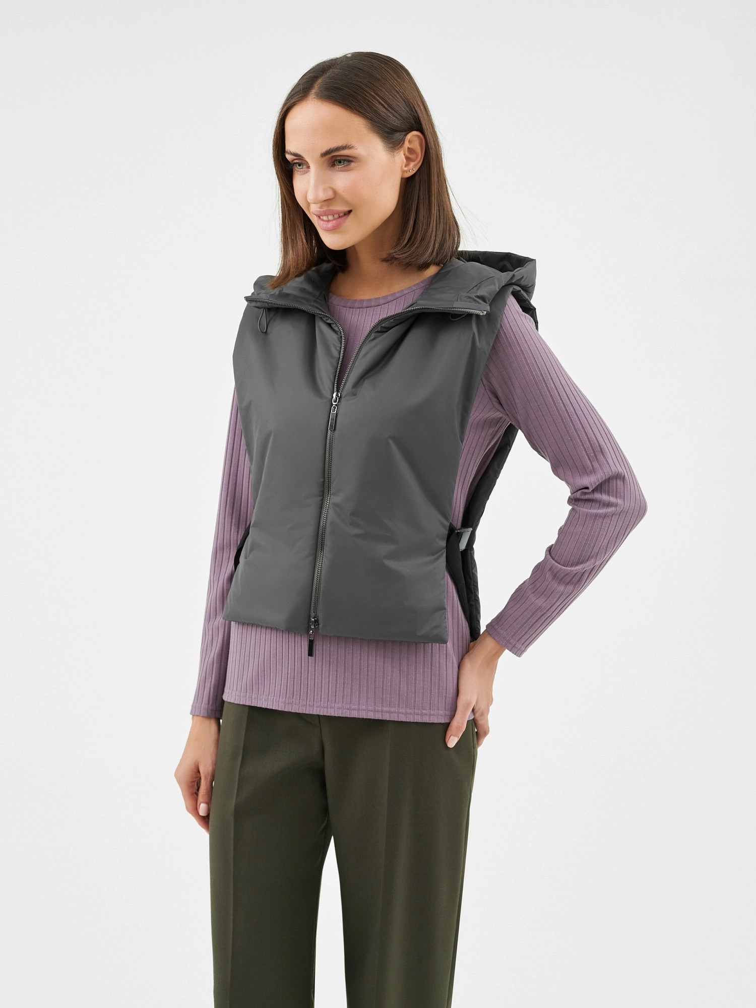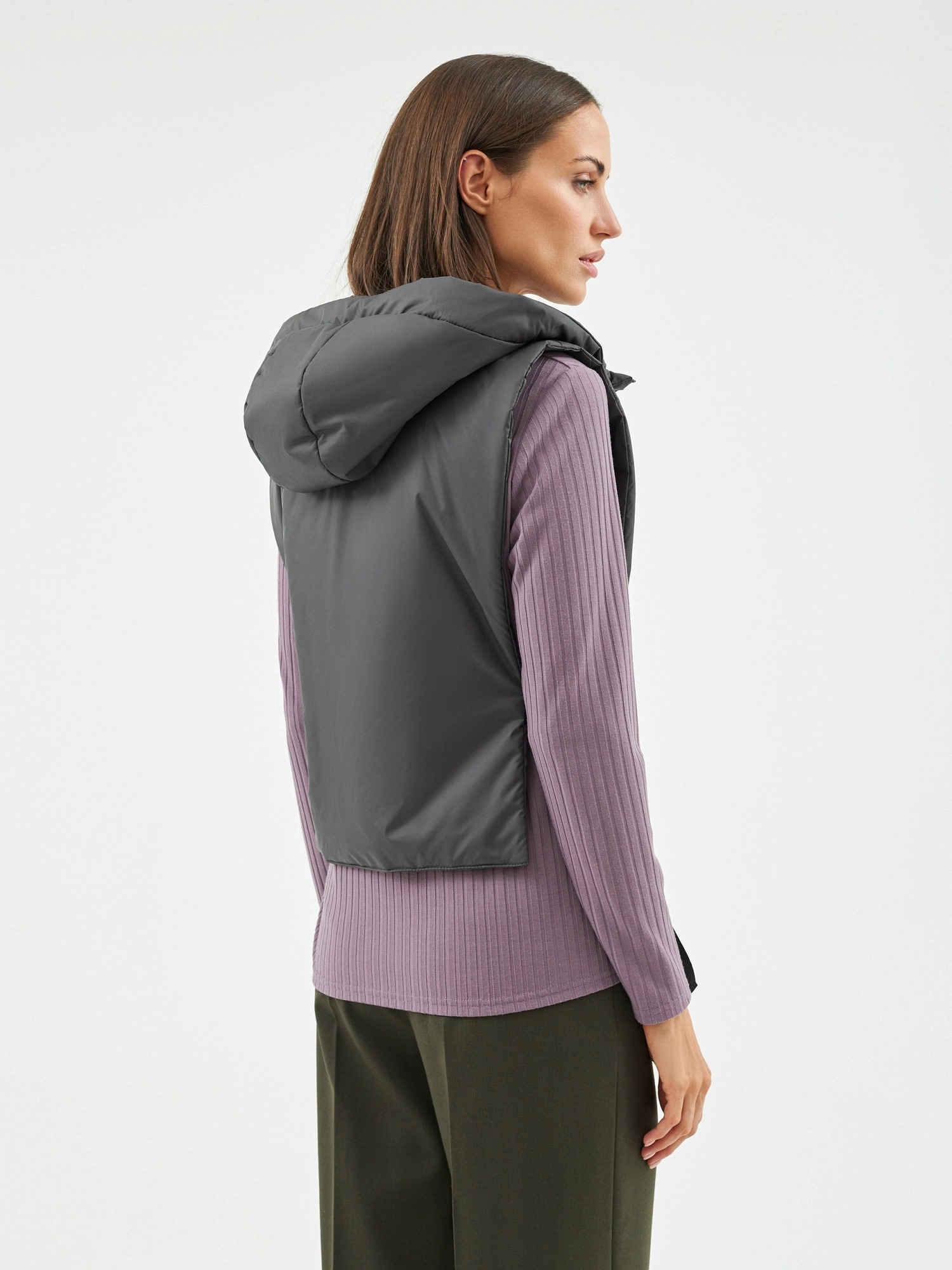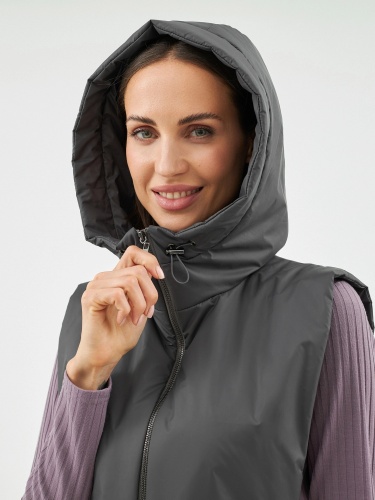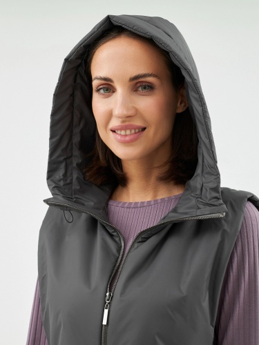 Съемный капюшон с длинной манишкой из технологичной плащевой ткани с водонепроницаемым покрытием в универсальном тёмно-сером цвете. Капюшон на молнии, имеет резинку и два фиксатора для регулирования объема капюшона. Такой капюшон может с легкостью дополнить не только лук с пальто, но и утеплить различные спортивные образы. Манишка капюшона длиная, что может заменить полноценный жилет, а на талии располагаются застежки-фастексы, которые надежно фиксирует изделие. Капюшон очень теплый, внутрь встроены непродуваемая мембрана и утеплитель для защиты от ветра и дождя.