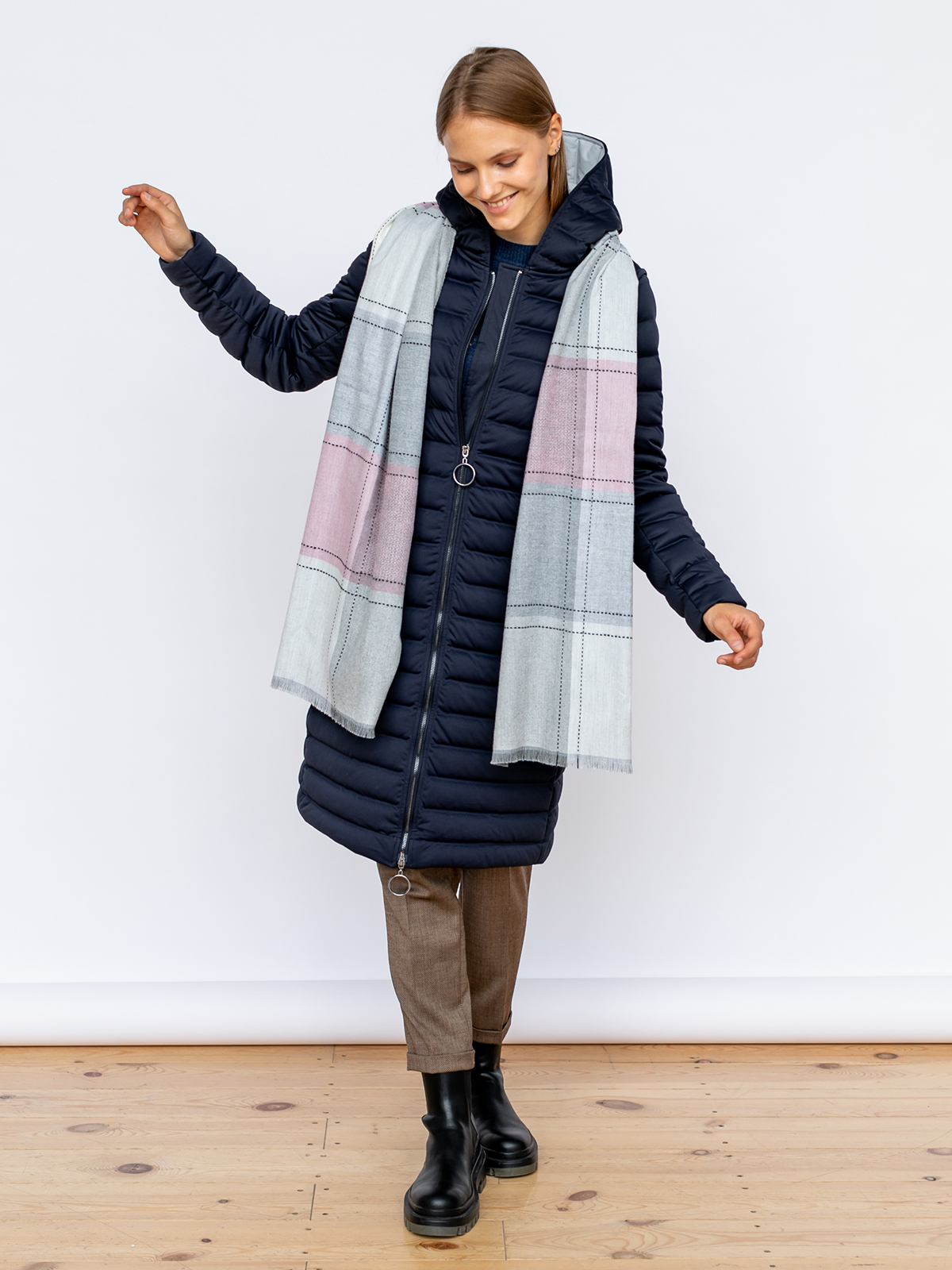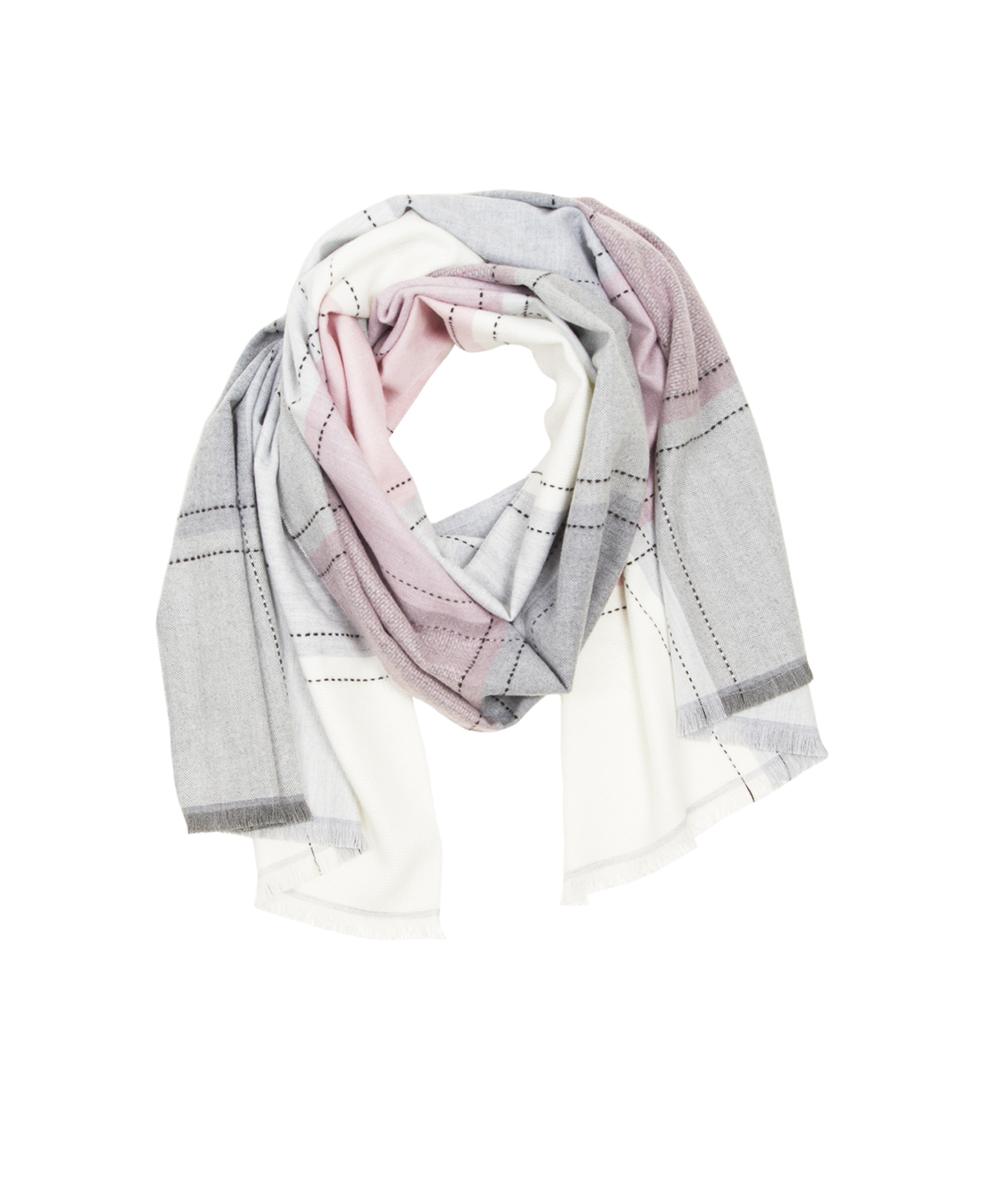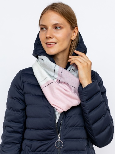 Теплый шарф из приятной на ощупь ткани. Орнамент в крупную клетку белого, серого и розового цветов. Декор - вышивка нитью. Шарф является незаменимой вещью в холодное время года.