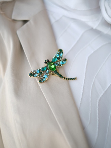 Ажурная брошь в форме стрекозы, украшенная вставками горного хрусталя, станет интересным и ярким акцентом в вашем образе.