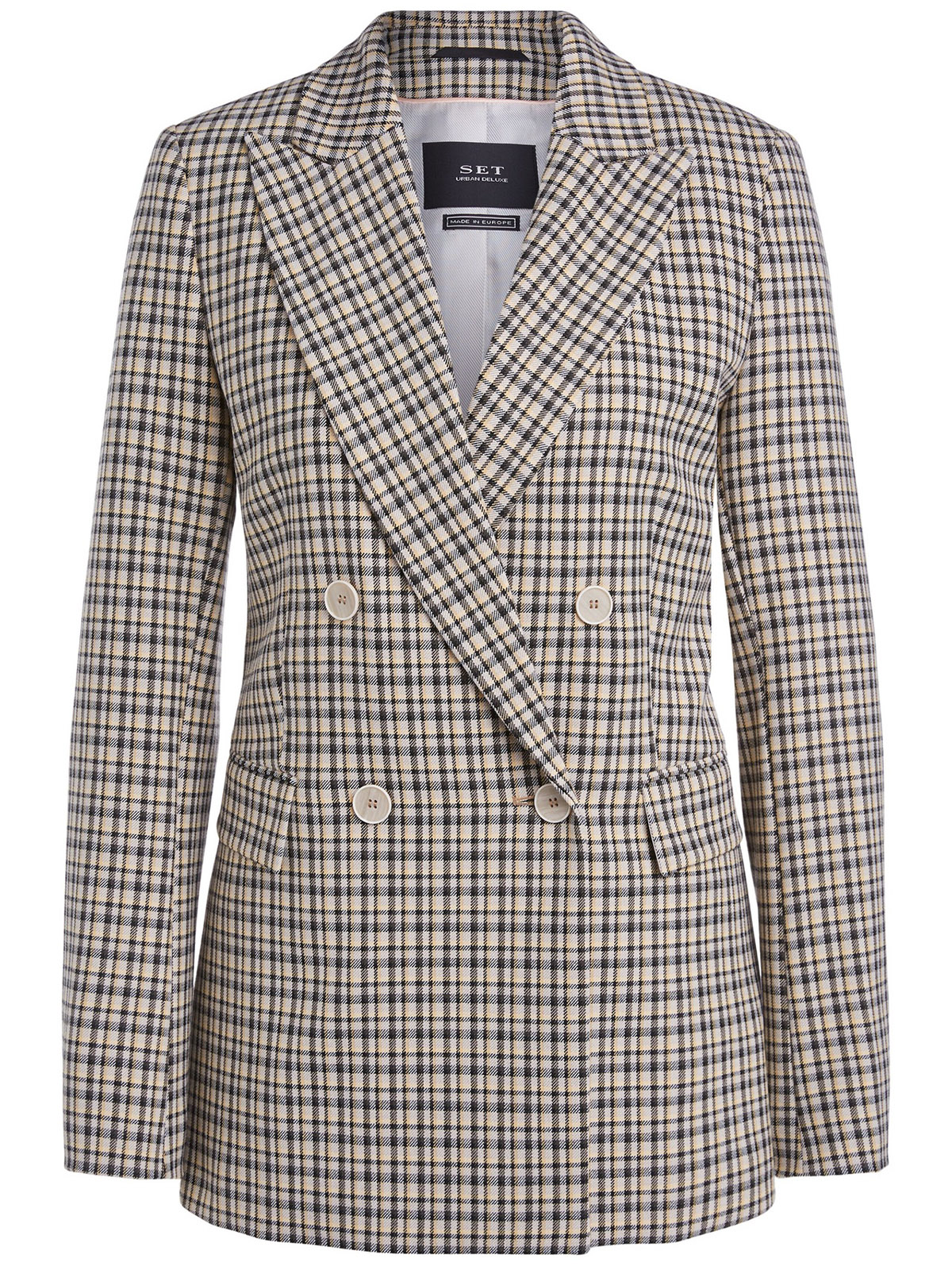 Клетчатый жакет прямого кроя. Отложной воротник с лацканами, застежка на пуговицы. Втачной рукав полной длины. Боковые карманы с клапаном.