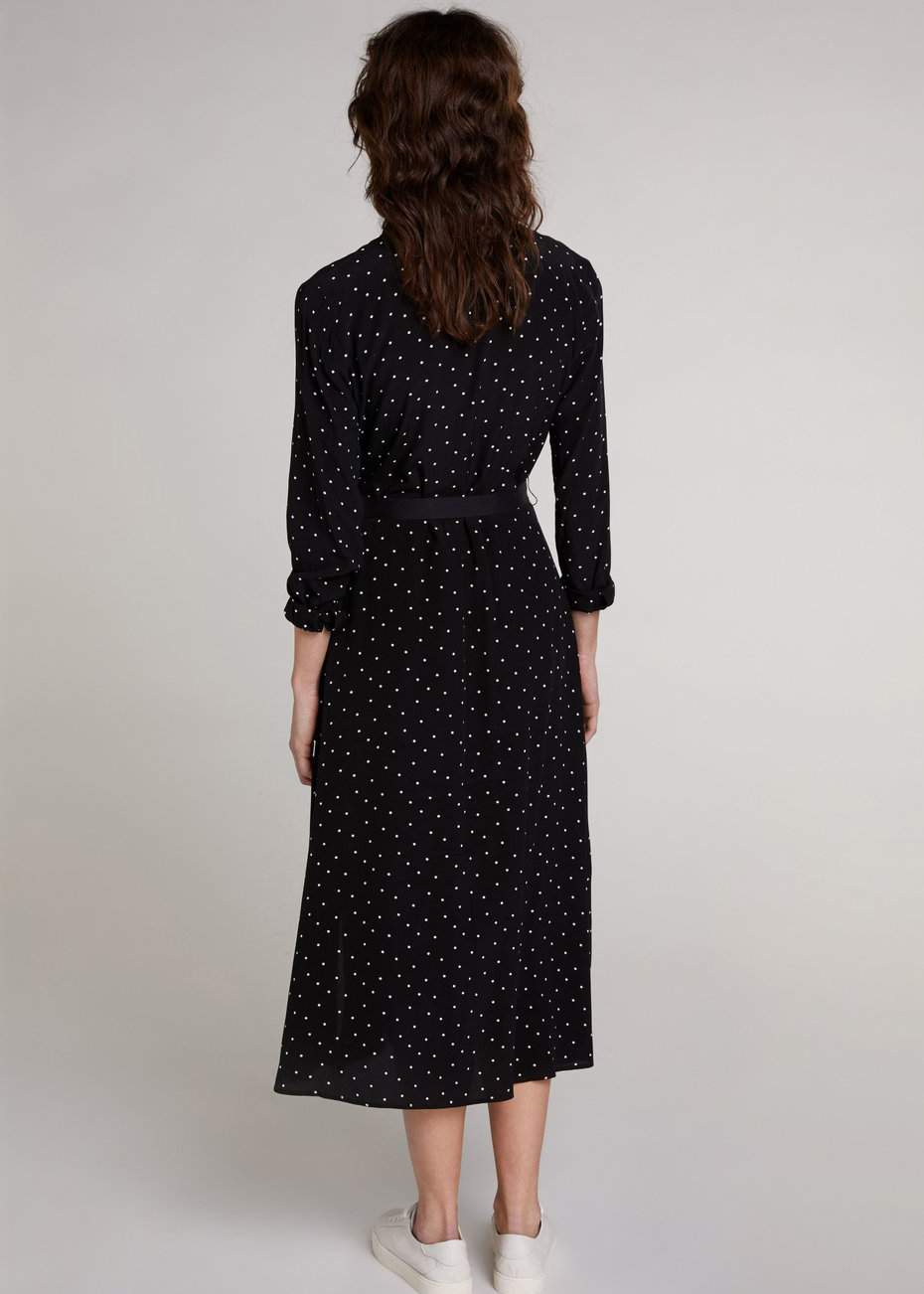 Платье длины макси в мелкий горох. Отложной рубашечный воротник, планка с пуговицами. Втачной рукав полной длины с манжетой. В комплекте идет черный тканевый пояс.