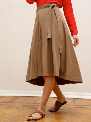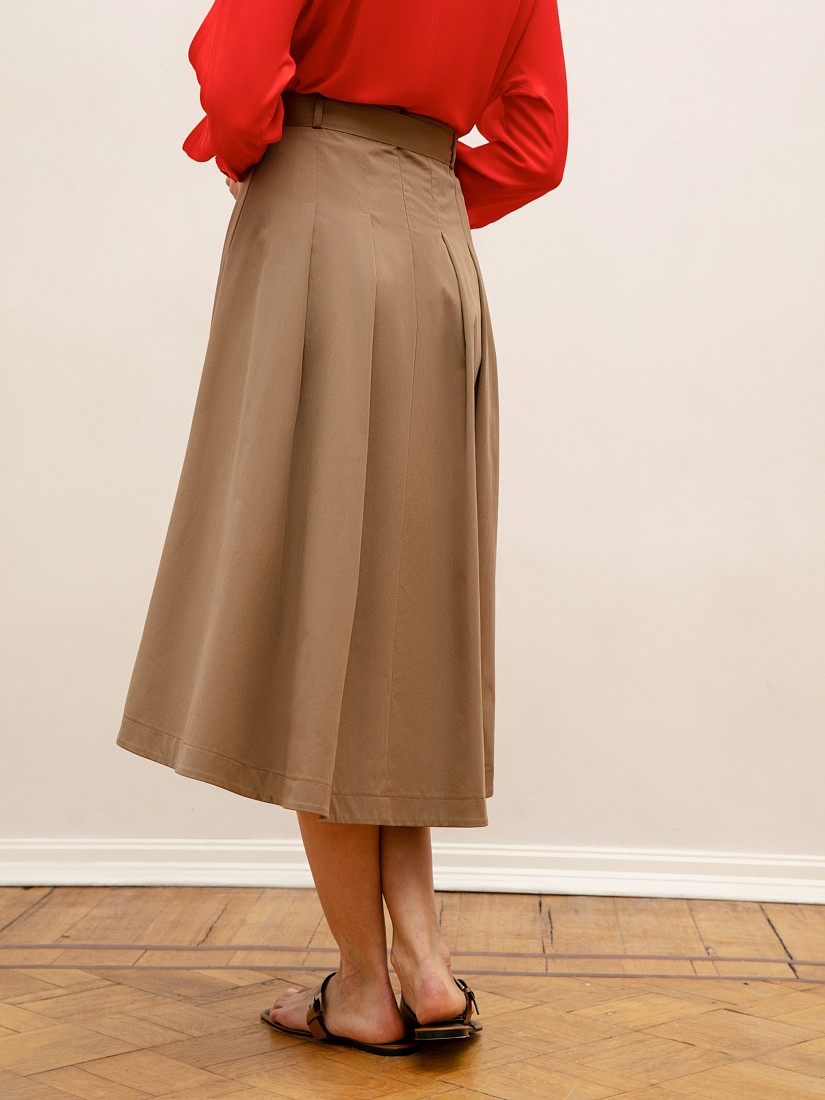 Однотонная расклешенная юбка длины миди. На талии заложены глубокие складки, сзади юбка удлинена. В комплекте идет тканевый пояс из основного материала изделия.