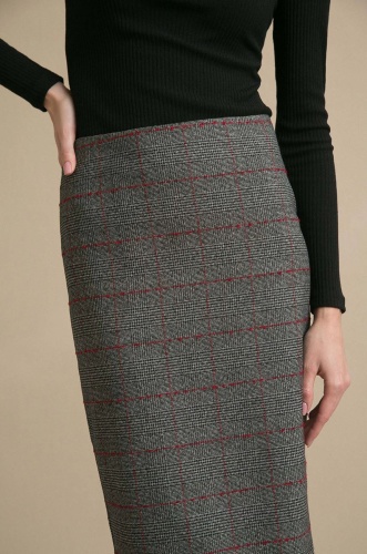 Серая юбка в клетку. Модель прямого кроя, выполнена без пояса, застегивается сзади на молнию в серединном шве. Лаконичная, простая модель в духе минимализма. Подойдет для повседневной жизни и деловых встреч.