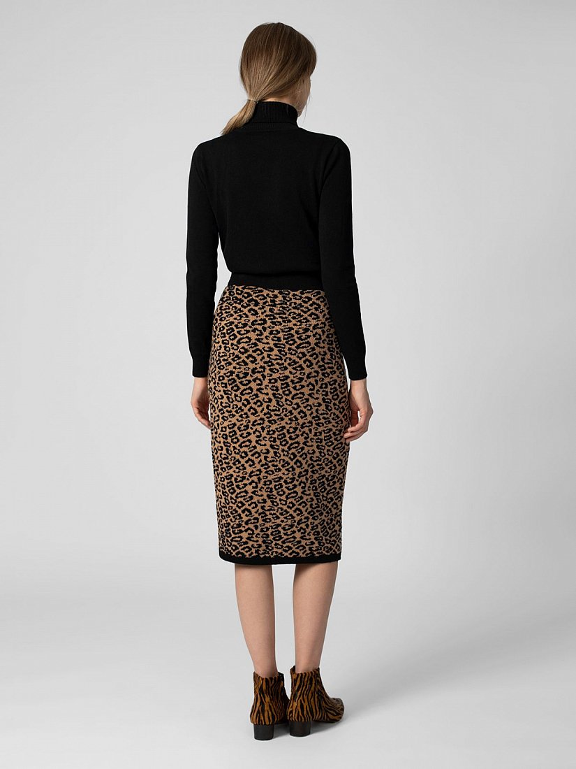 Юбка прямого силуэта на поясе из вязанного трикотажного жаккарда с леопардовым рисунком. Без застежки.