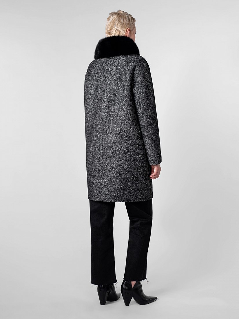 Пальто прямого силуэта "кокон" из чёрно-белой варёной шерсти. Длина выше колена. Рукава-кимоно, карманы-листочки, плосколежащий воротник-стойка, застёжка на пришивные кнопки. Съёмный меховой воротник из натурального песца. Пальто с ветрозащитной мембраной Raft Pro. Утеплитель DuPont Sorona из биопуха.