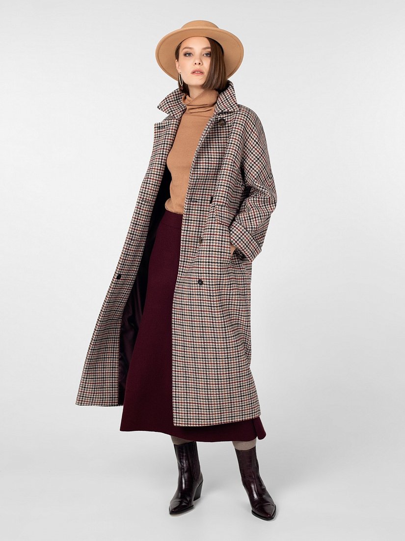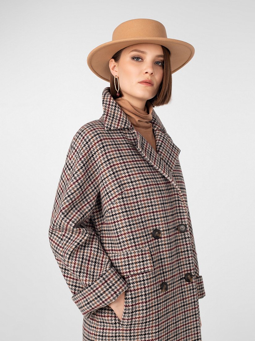 Двубортное пальто силуэта "длинный кокон" длиной до середины икры. Рукава-кимоно с отворотом по низу, застёжка на роговые пуговицы, английский воротник, карманы с декоративными клапанами, широкая отлетная кокетка на спинке, шлица в среднем шве. Произведено с ветрозащитной мембраной Raft Pro. Изготовлено из шерстяной ткани с рисунком "пье-де-пуль".