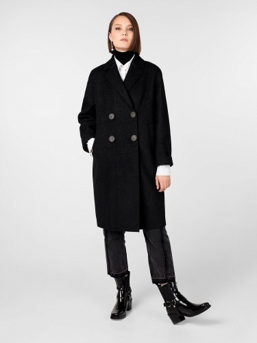 Двубортное пальто силуэта "кокон" длиной до колена. Рукава-кимоно с отворотами по низу, застёжка на крупные роговые пуговицы, английский воротник, карманы-листочки. Выполнено с открытыми срезами и декорировано отделочными строчками. Произведено с ветрозащитной мембраной Raft Pro. Изготовлено из варёной шерсти чёрного цвета.