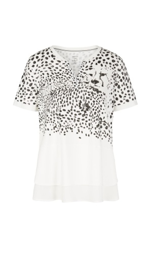 Футболка с трендовым звериным принтом. Прямой крой, фигурный вырез горловины, короткие втачные рукава, волан по низу изделия. Приятный к телу материал из хлопковой смеси.