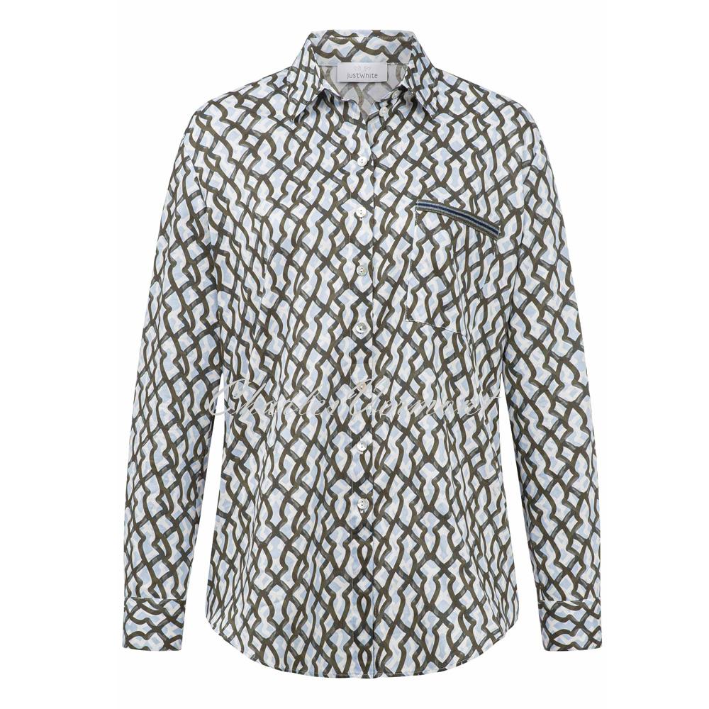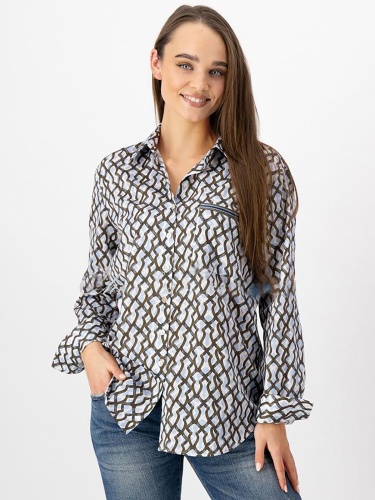 Блузка с оригинальным геометрическим узором по всей поверхности изделия. Прямой силуэт подходит для разных типов фигур, выгодно подчеркивая достоинства. Отложной рубашечный воротник, длинный втачной рукав с манжетами. Застежка на пуговицы в тон блузки. Накладной карман на груди.
