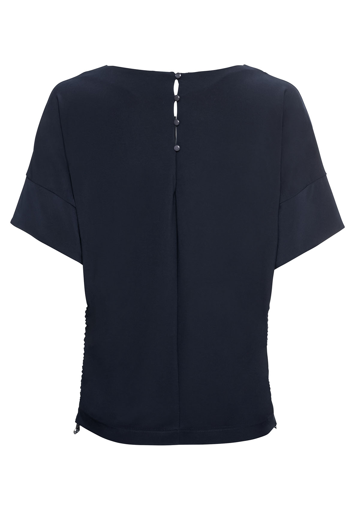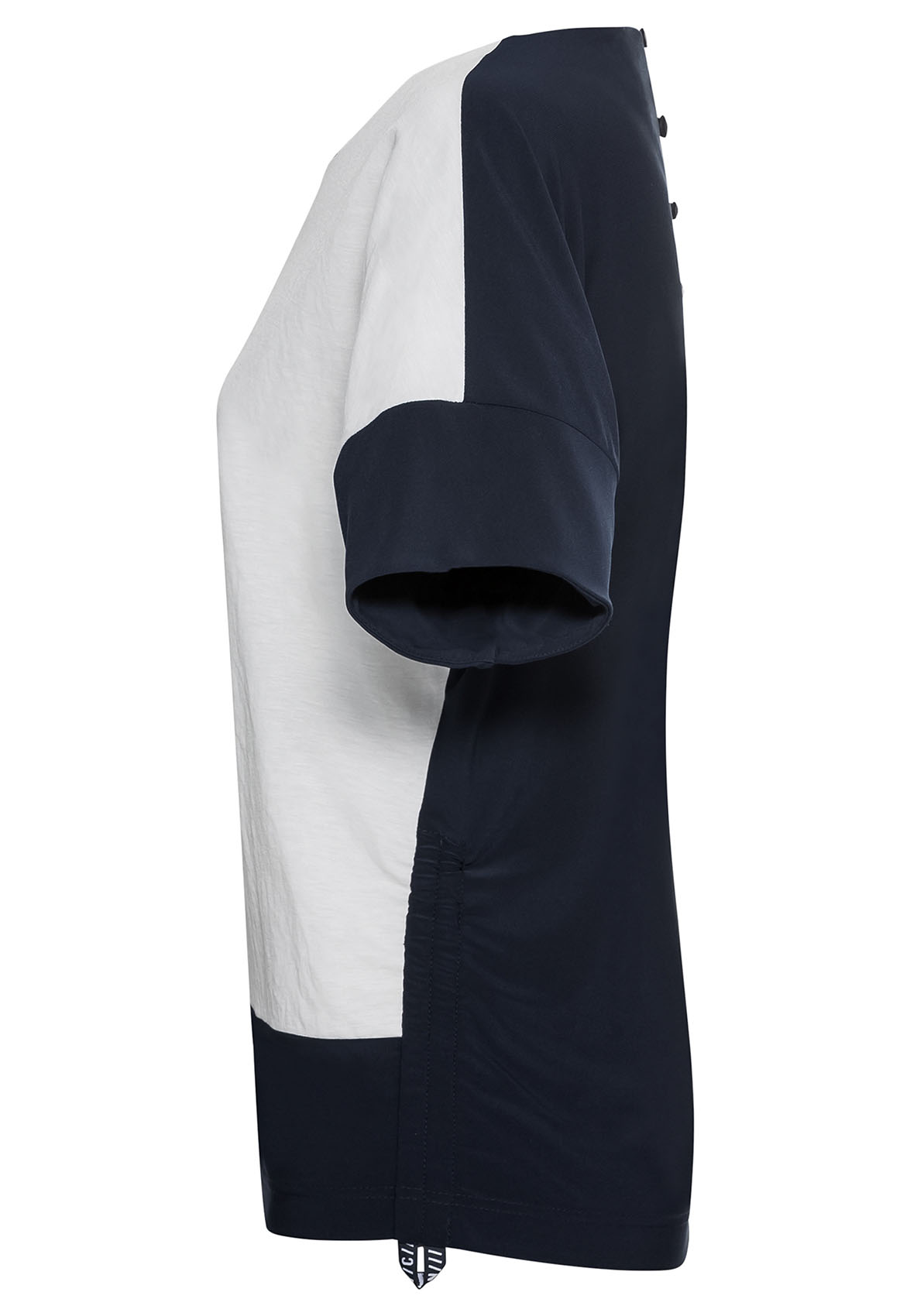 Стильная блуза Julie подходит для любого случая. Блуза обращает на себя внимание благодаря эффекту колор-блок. Длина бока регулируется кулиской. Спинка блузы выполнена из удобного однотонного трикотажа. Качественная эластичная ткань обеспечивает оптимальный комфорт. Короткий рукав с опущенным плечом, круглый вырез горловины и пуговичная планка на спинке стильно завершают образ. • в стиле колор-блок • высококачественная эластичная ткань • кулиски с лентой BIANCA по бокам изделия • круглый вырез, рукав со спущенным плечом, пуговичная планка на спинке • длина около 64 см