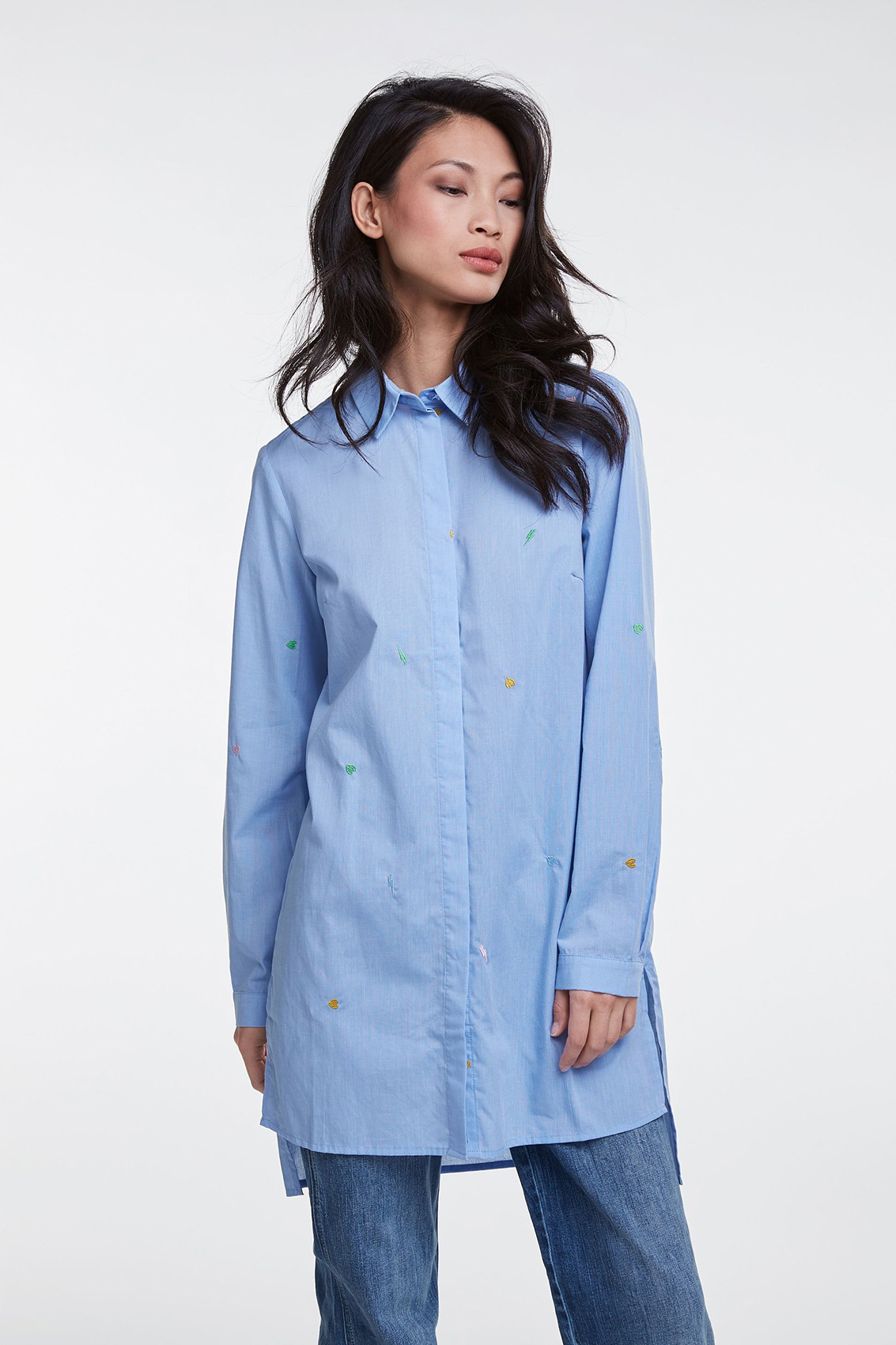 Удлиненная блуза - изюминка коллекции! Прямой покрой, отложной воротничок, застежка на пуговицах, длинные рукава. Удлиненная спинка изделия, разрезы по бокам. Ткань с вышитыми элементами. Эта блуза в стиле кэжуал предполагает огромное множество модных интерпретаций.