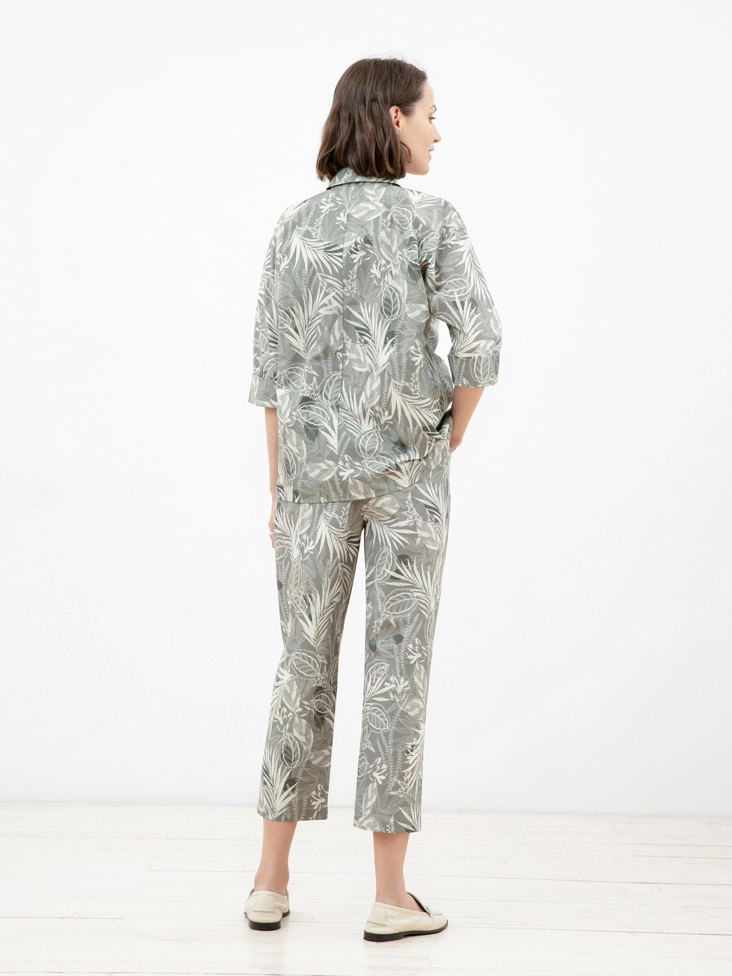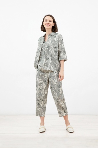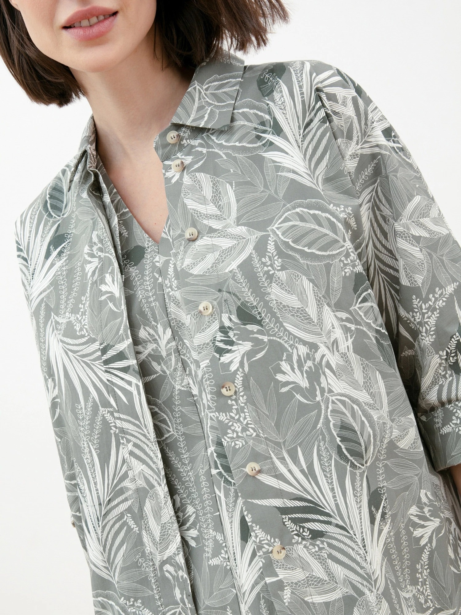 Блуза прямого ситуэта из хлопковой ткани в растительный принт. Воротник отложной, рукав-кимоно, низ рукава обработан притачной манжетой. Застежка потайная на пуговицы.