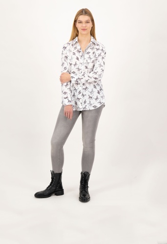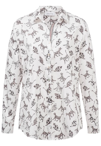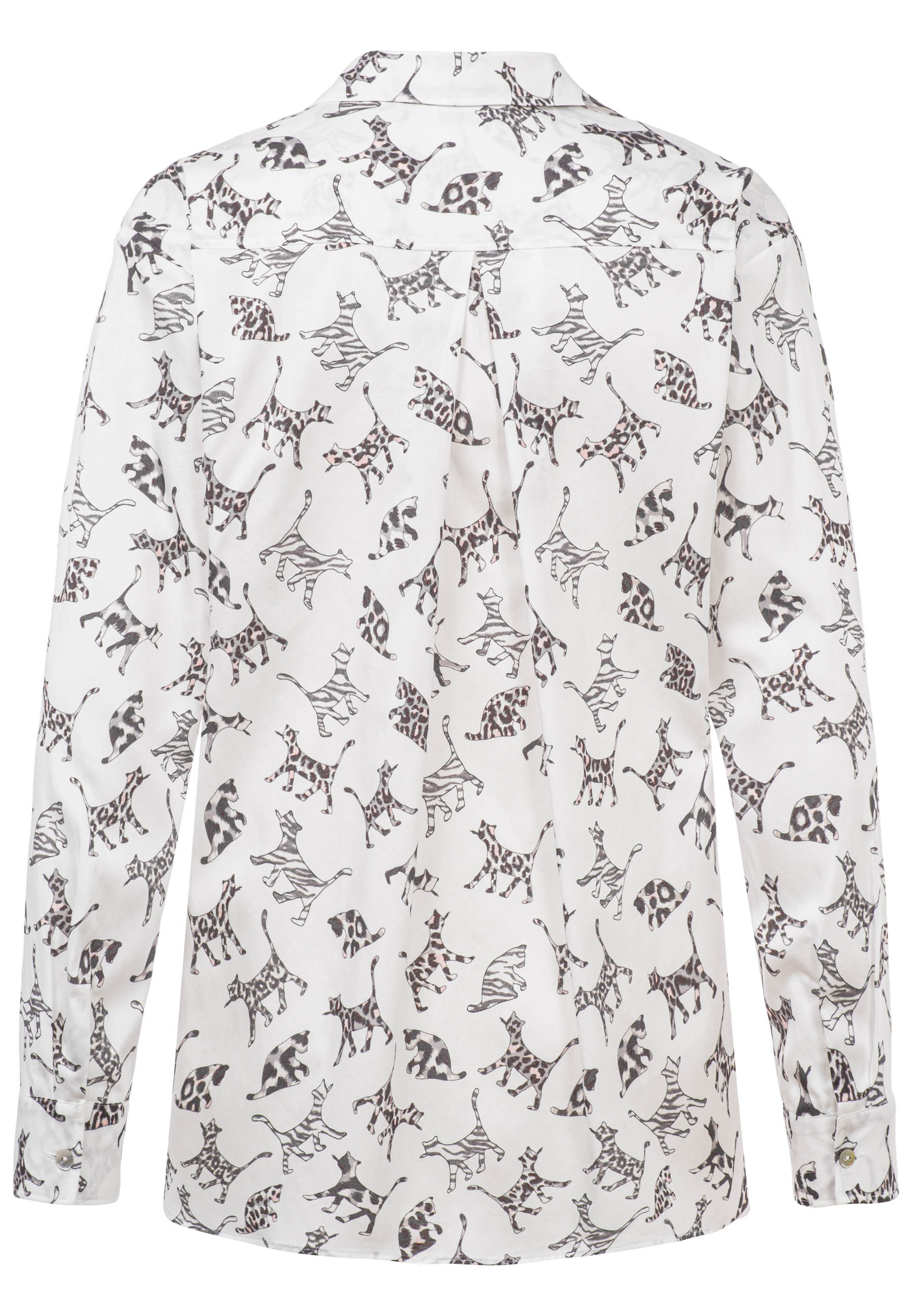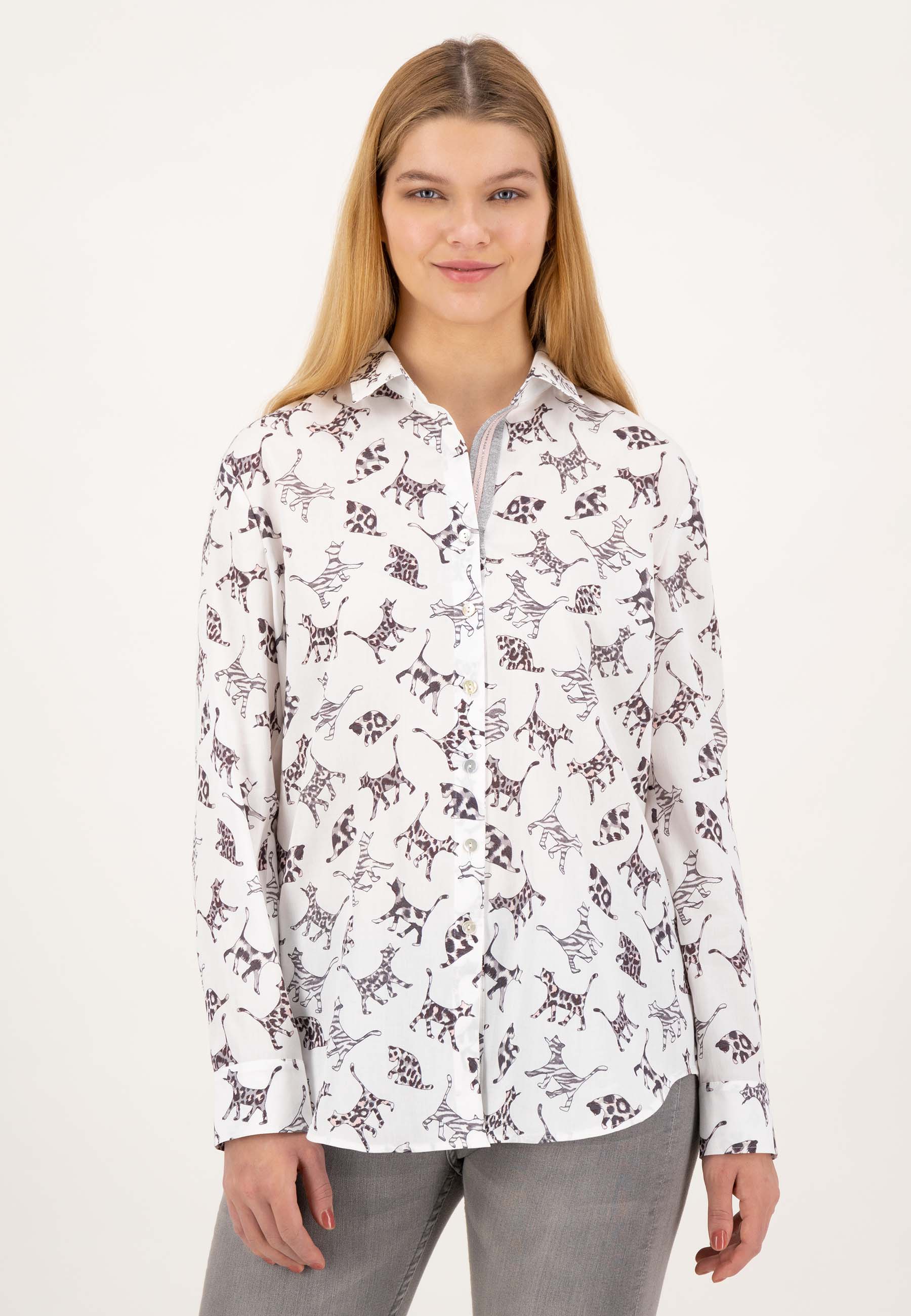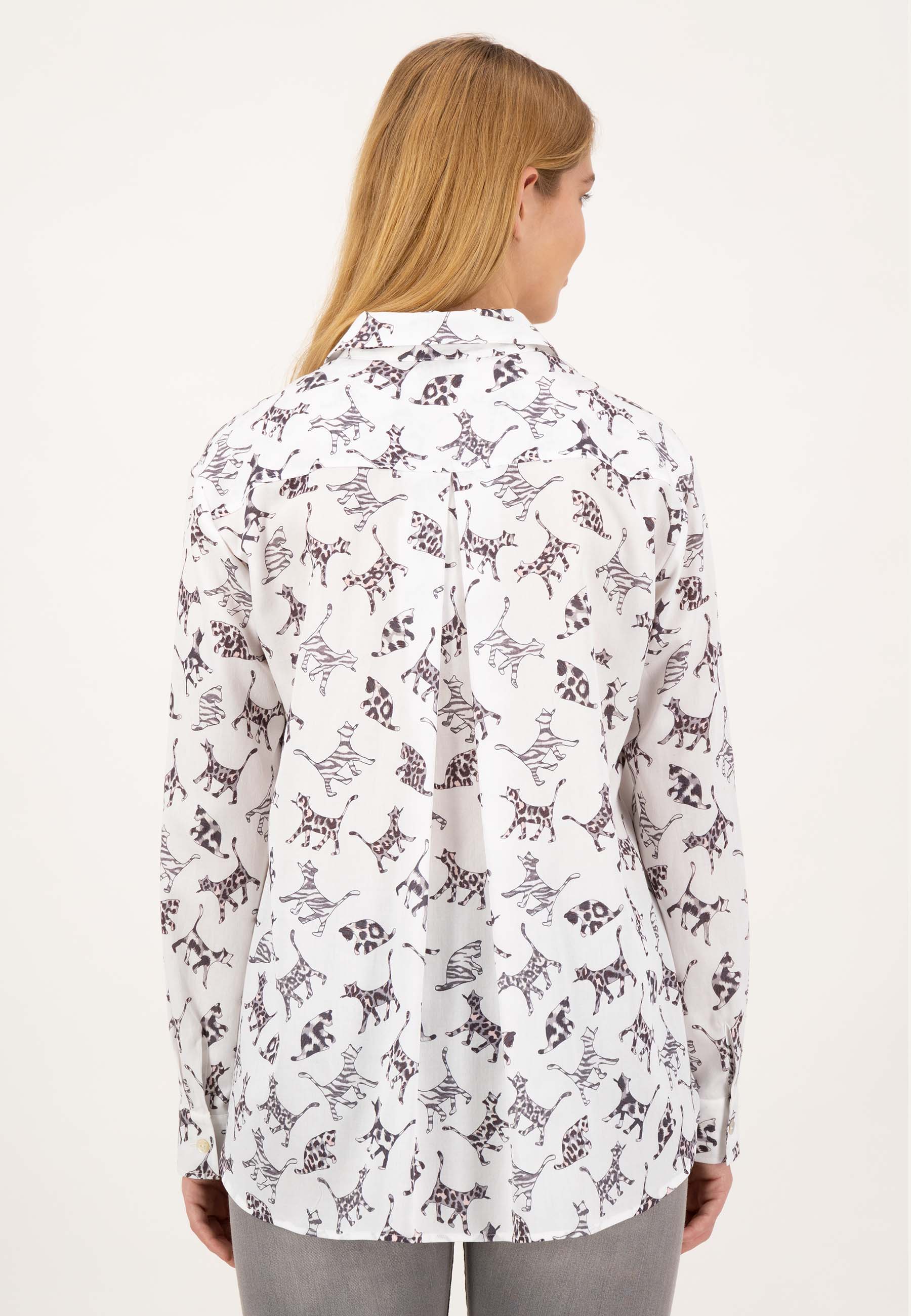 На сайте указаны российские размеры. Современная белая блуза с рубашечным воротником и принтом по всей поверхности. Классическая посадка с закругленным краем, манжетами рукавов и воротником рубашки. Блузка с длинными рукавами легко струится благодаря складкам на спине. Еще одной изюминкой блузки является декорированная подкладка из люрекса с декоративной лентой розового цвета и нежными стразами. Модель ростом 177 см. Измерения для 44 размера: Окружность груди: 123 см Талия: 121 см Бедра: 130 см Длина по спинке: 72 см. Длина рукава: 60 см.