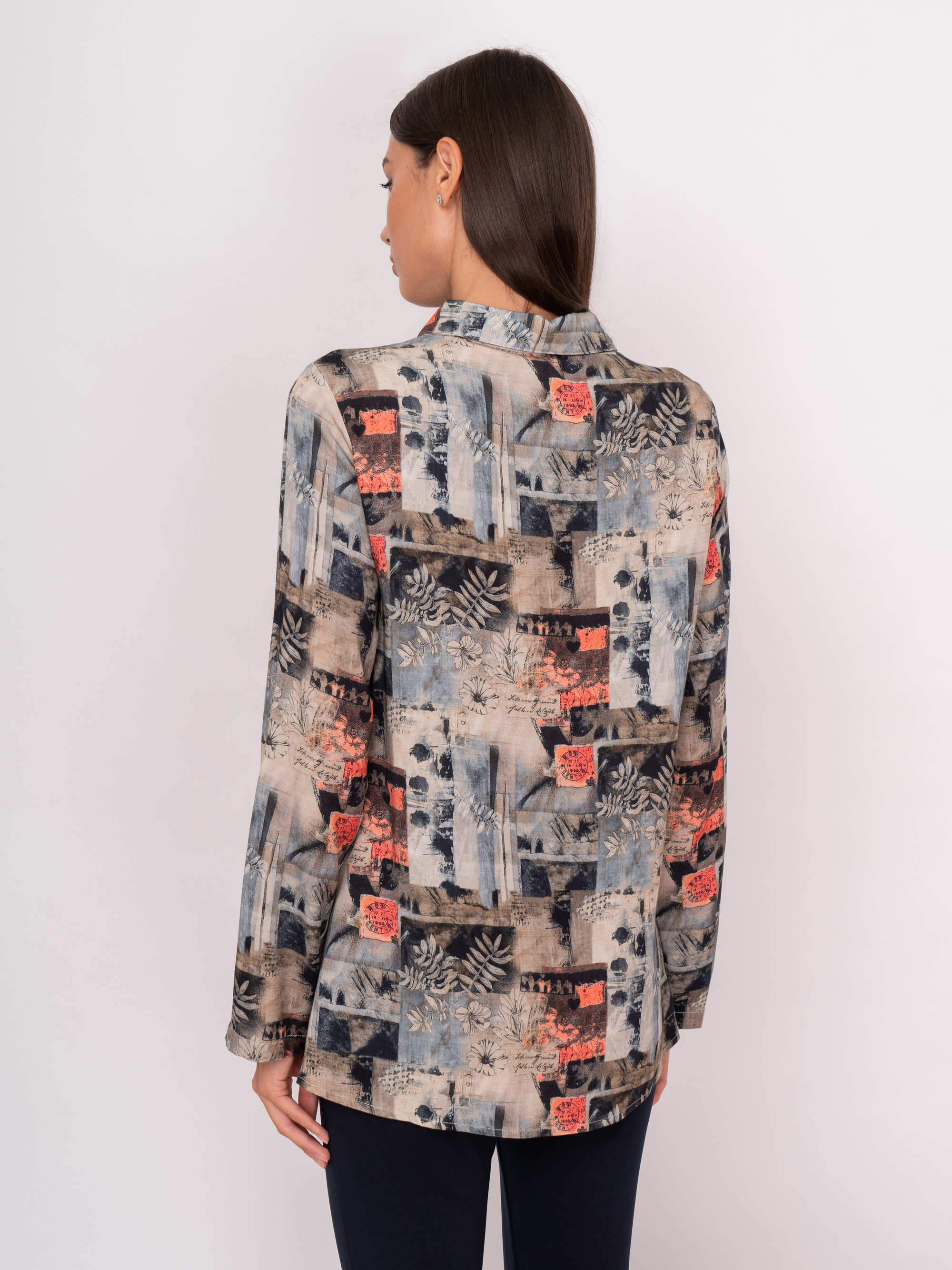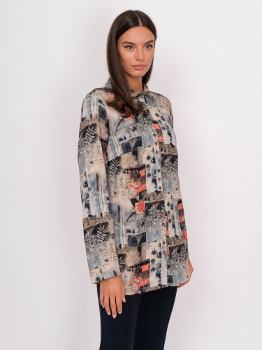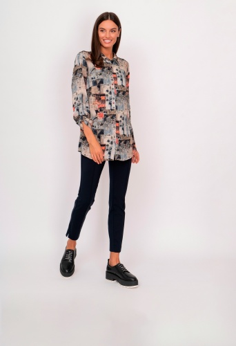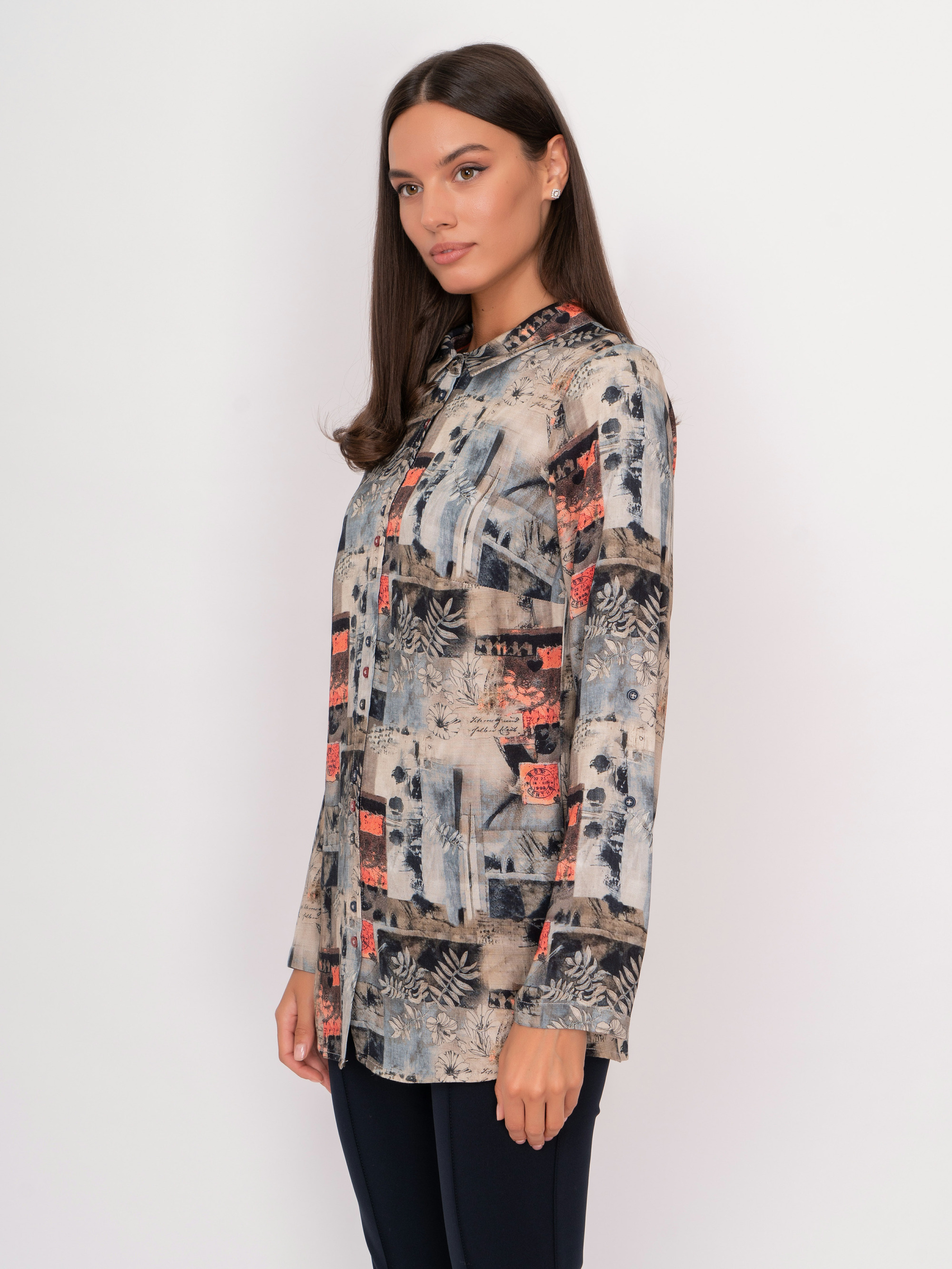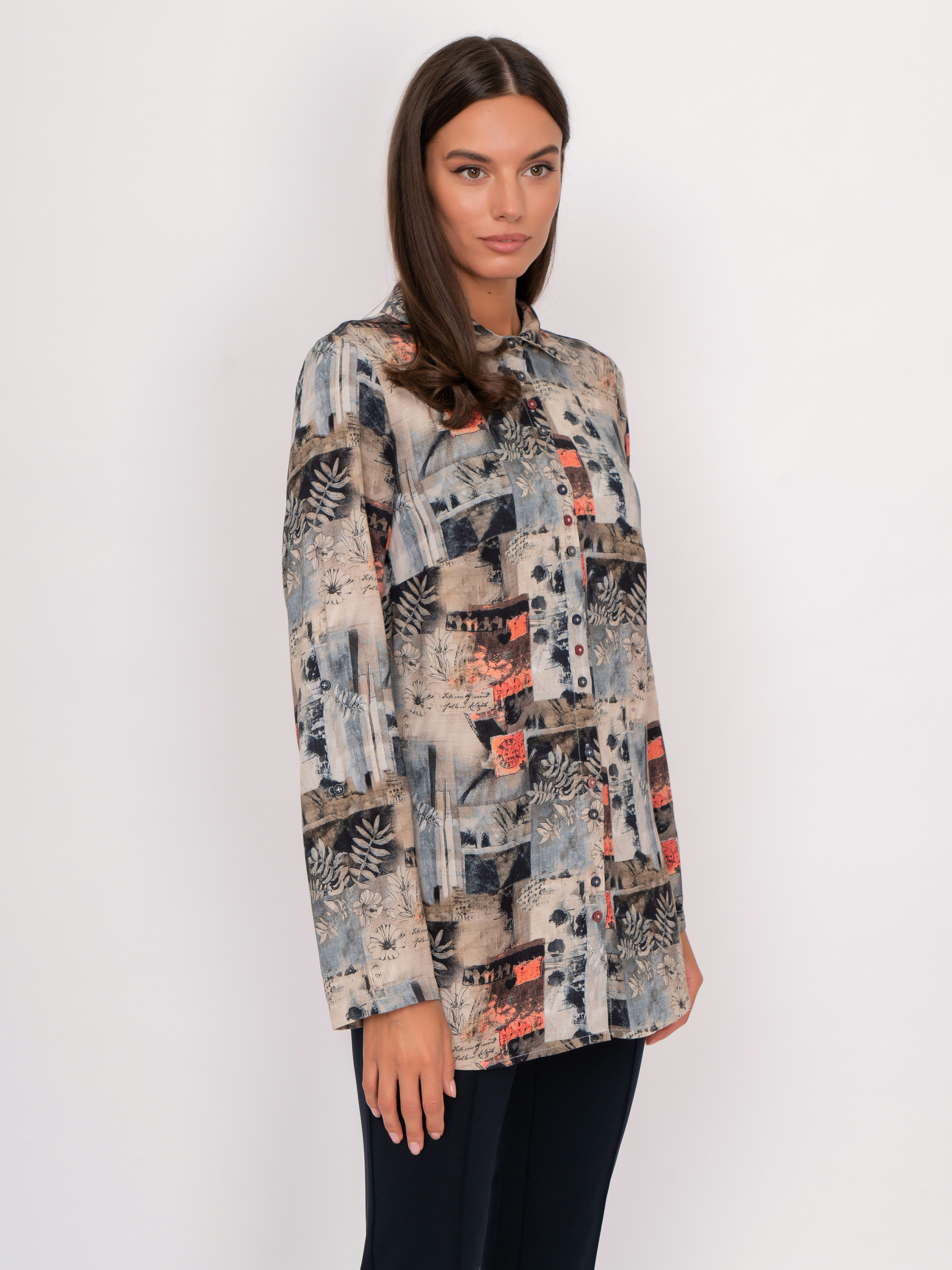 На сайте указаны российские размеры. Прямая бежево-синяя блузка на пуговицах из 100% вискозы с отложным воротником, с длинным рукавом, с розовыми вставками и цветочным рисунком. Длина по спинке: 73 см. Рост модели: 175 см.