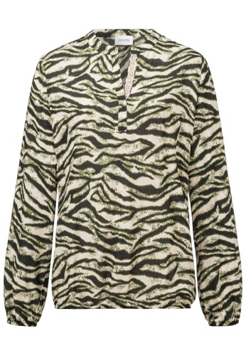 На сайте указаны российские размеры. Блузка с длинными рукавами из тонкой вискозы с анималистичным принтом. Животный образ никогда не выходит из моды. Благодаря каучуковым краям вискозная блуза всегда выглядит хорошо сидящей и спортивной. Короткая планка на пуговицах с изящно декорированной вставкой из люрекса и стразов делает эту блузку на пуговицах стильной и удобной в носке. Наша модель ростом 177 см. Измерения для 44 размера: Окружность груди: 104 см Талия: 104 см Бедра: 113 см Длина спинки: 65 см Длина рукава: 62 см