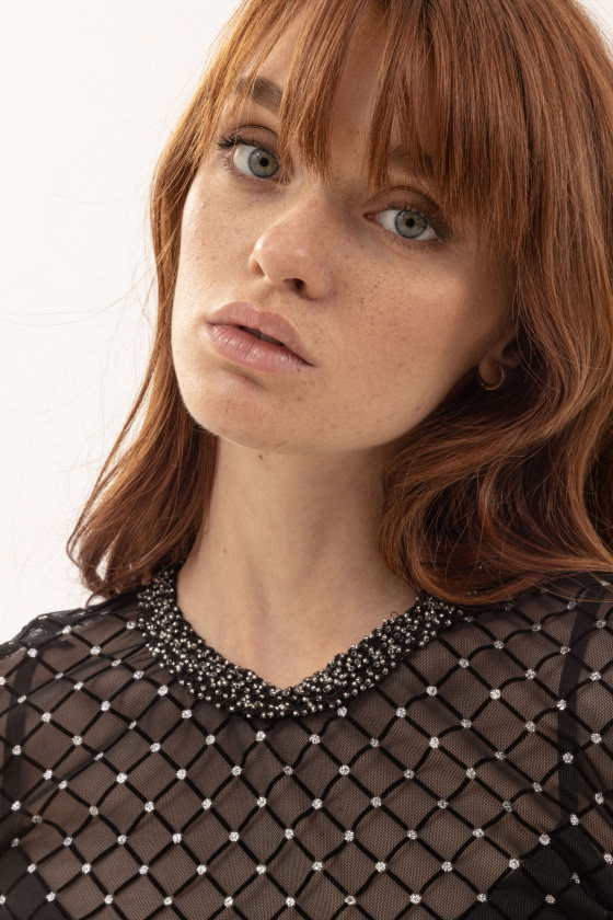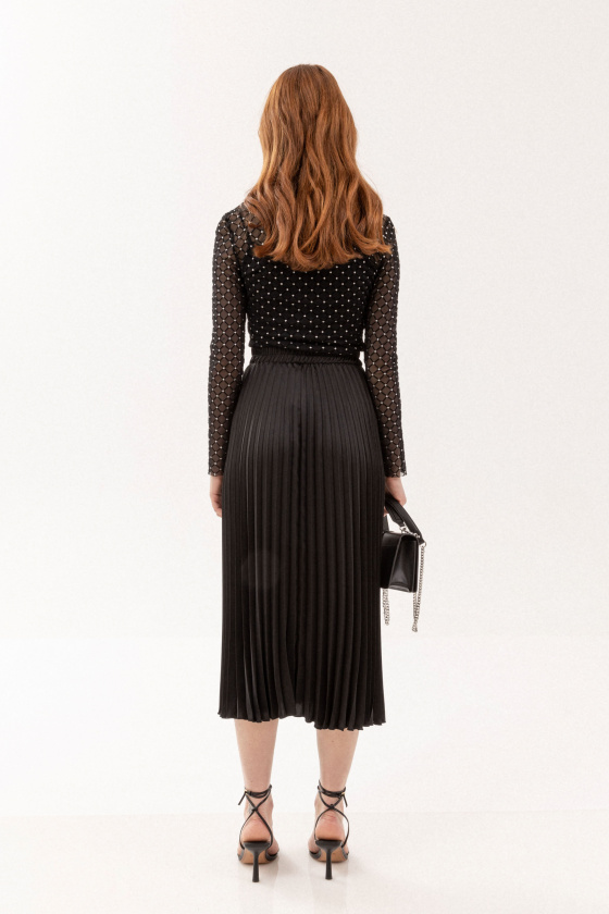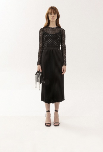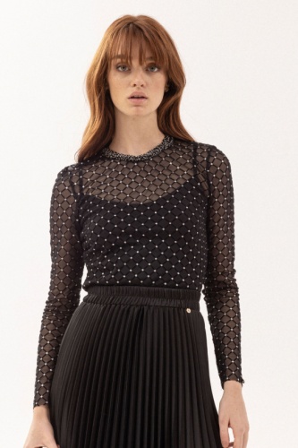 На сайте указаны российские размеры. Украшенный топ из тюля с длинными рукавами. Круглый воротник. Блуза с подкладкой. Фактурный тюль в горошек.