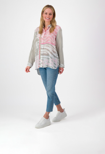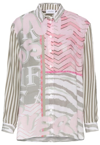 На сайте указаны российские размеры. Элегантная и в то же время повседневная блуза с рубашечным воротником и модным сплошным принтом станет базовым элементом вашего следующего любимого образа. Наш любимый рисунок сезона с сочетанием надписей, полосок и зебры особенно хорошо смотрится на мягкой вискозе высокого качества. Длина по спинке: 76 см. Рост модели: 177 см.
