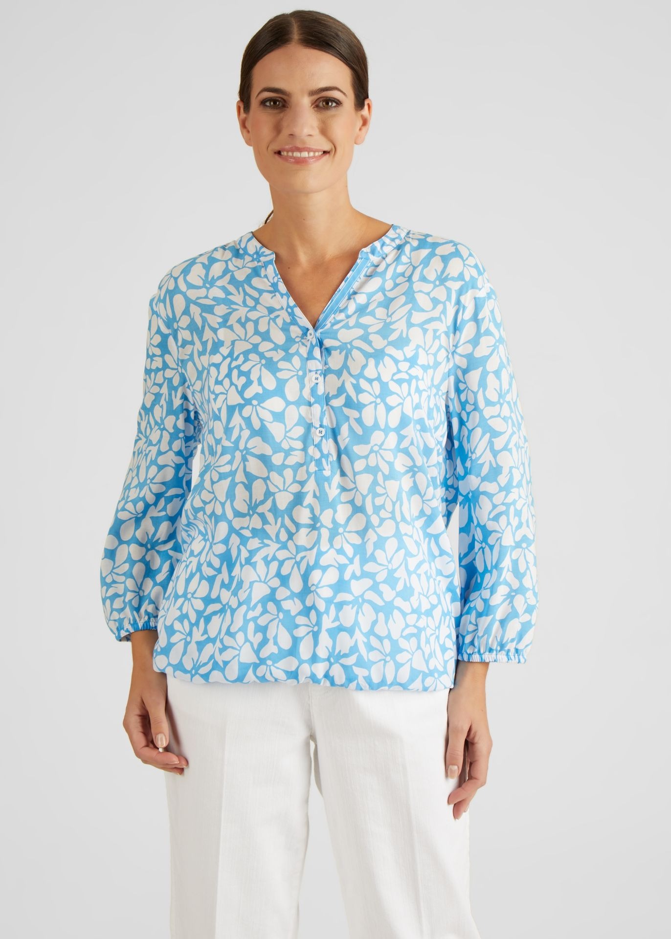 Блузка с абстрактным узором и небольшим воротником-стойкой — стильный предмет гардероба на все случаи жизни. V-образный вырез на пуговицах, эластичные манжеты и нижняя кромка обеспечивают удобную посадку и адаптируются к любой фигуре. Прямой крой предлагает современный дизайн, который идеально сочетается с джинсами, брюками или юбками. Изготовленная из 100% вискозы, блузка приятна на ощупь и приятна на ощупь. Длина рукава 3/4 идеальна для весны и лета. Эта блузка станет незаменимой вещью для каждой женщины, следящей за стилем, и прекрасным подарком для ваших близких.
