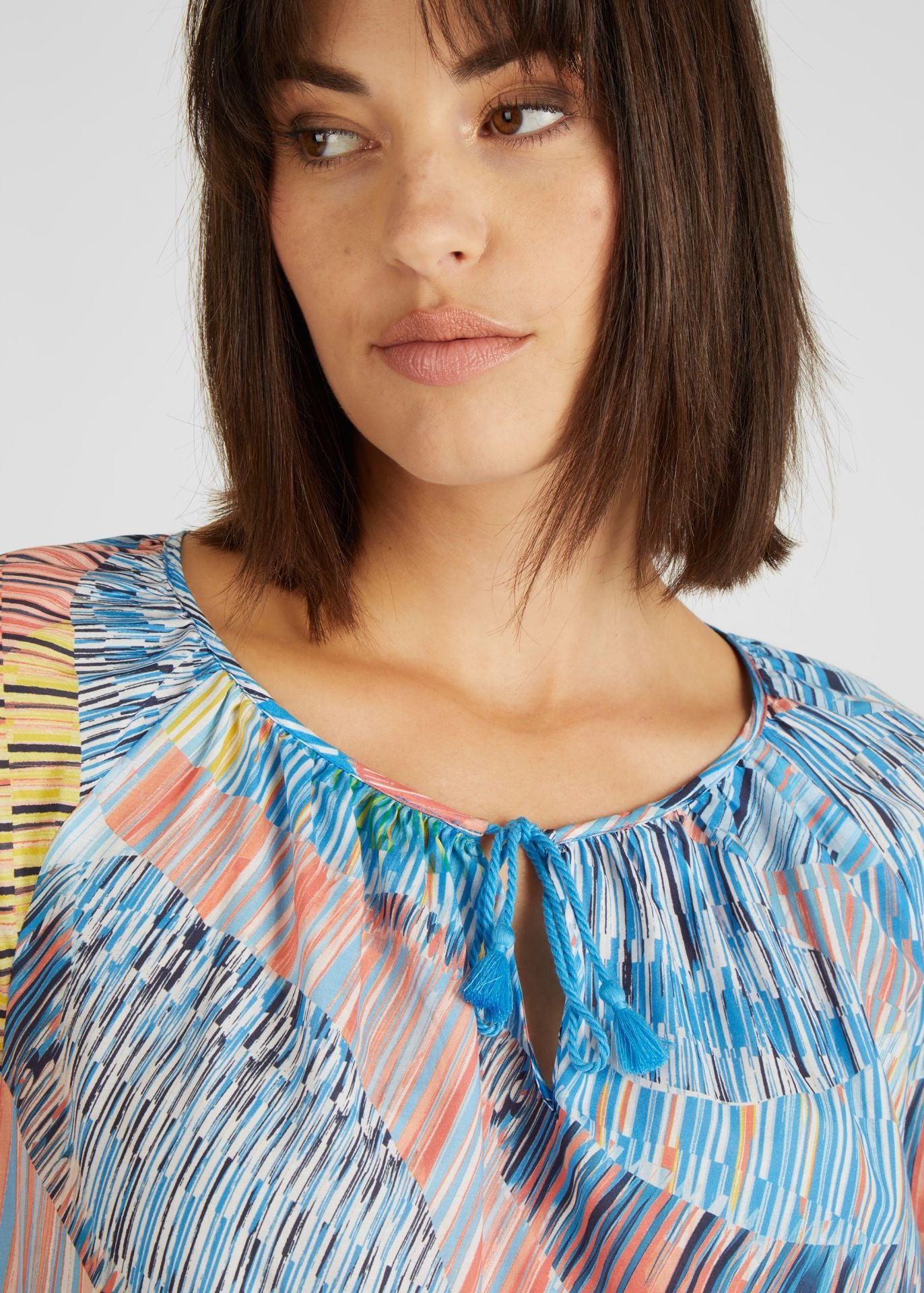 Блузка с короткими рукавами и абстрактным узоро. Небольшой V-образный вырез можно уменьшить до небольшого модного разреза с помощью ленточек на воротнике. Широкая форма придает непринужденный вид, а струящаяся ткань приятна на ощупь. Носите блузку небрежно с джинсами или брюками.