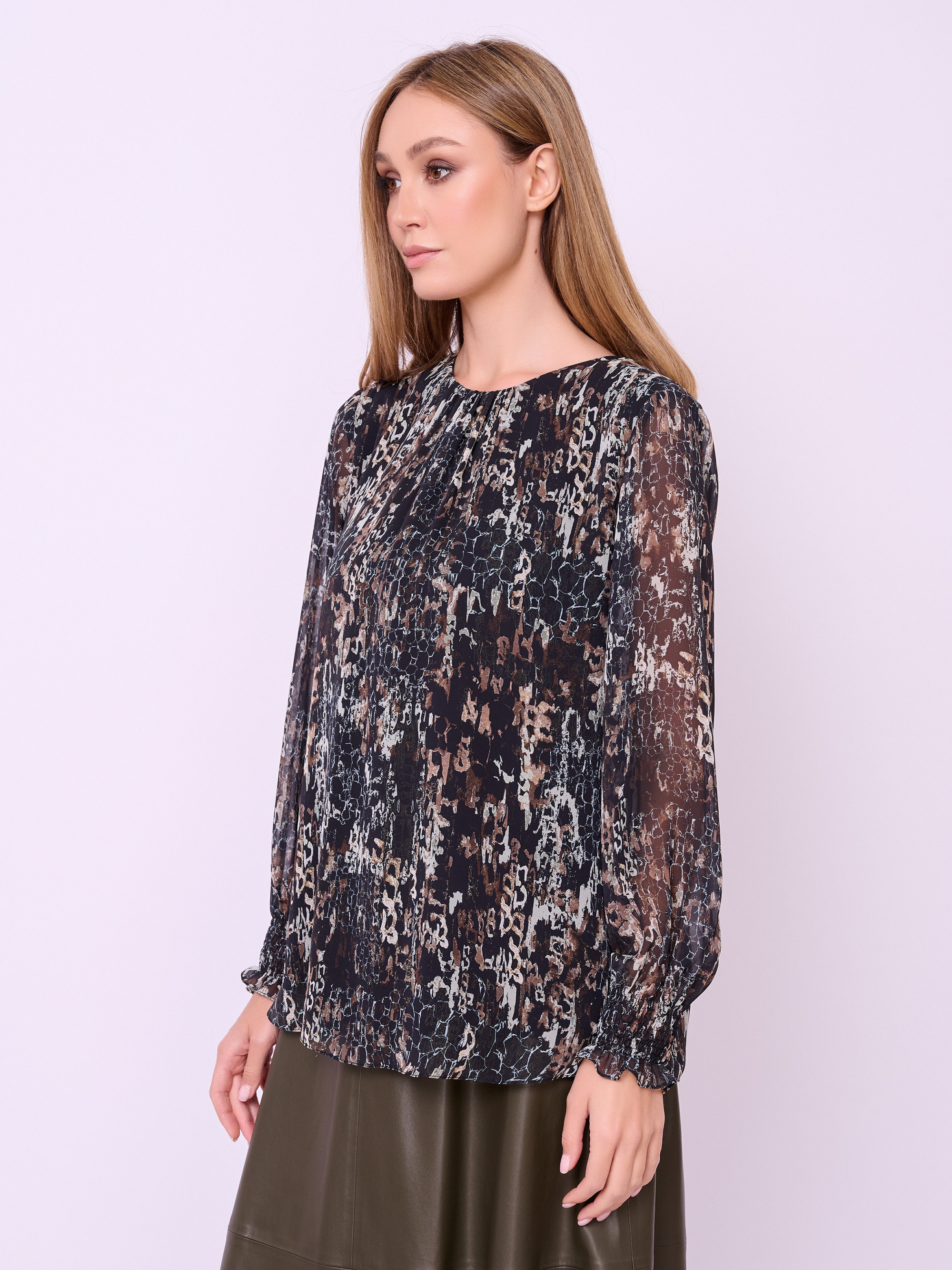 Блуза из шифона с абстрактным рисунком свободного покроя с округлой горловиной, длинными рукавами на резинке. Длина по спинке: 66 см.
