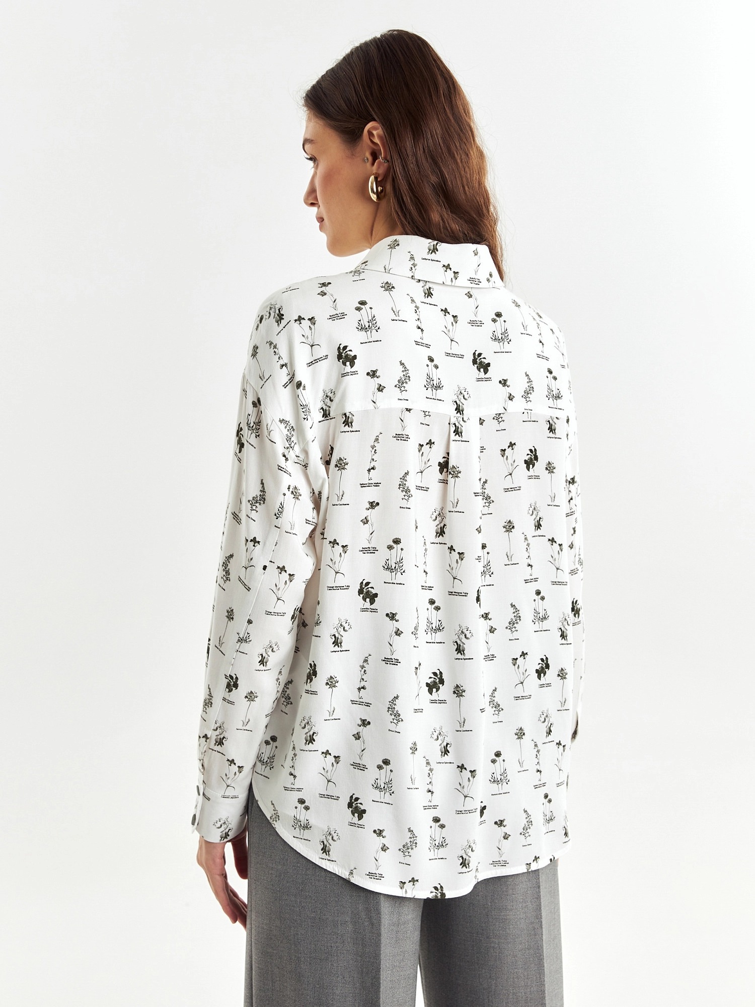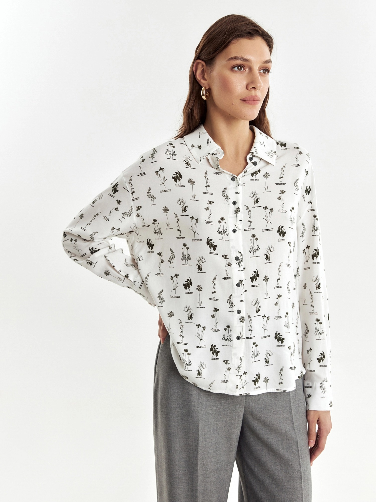 Свободная блуза из вискозной ткани с цветочным принтом. Блуза со спущенным плечом и манжетами. На спинке кокетка с бантовой складкой. Низ блузы округлый, спинка длиннее полочки.