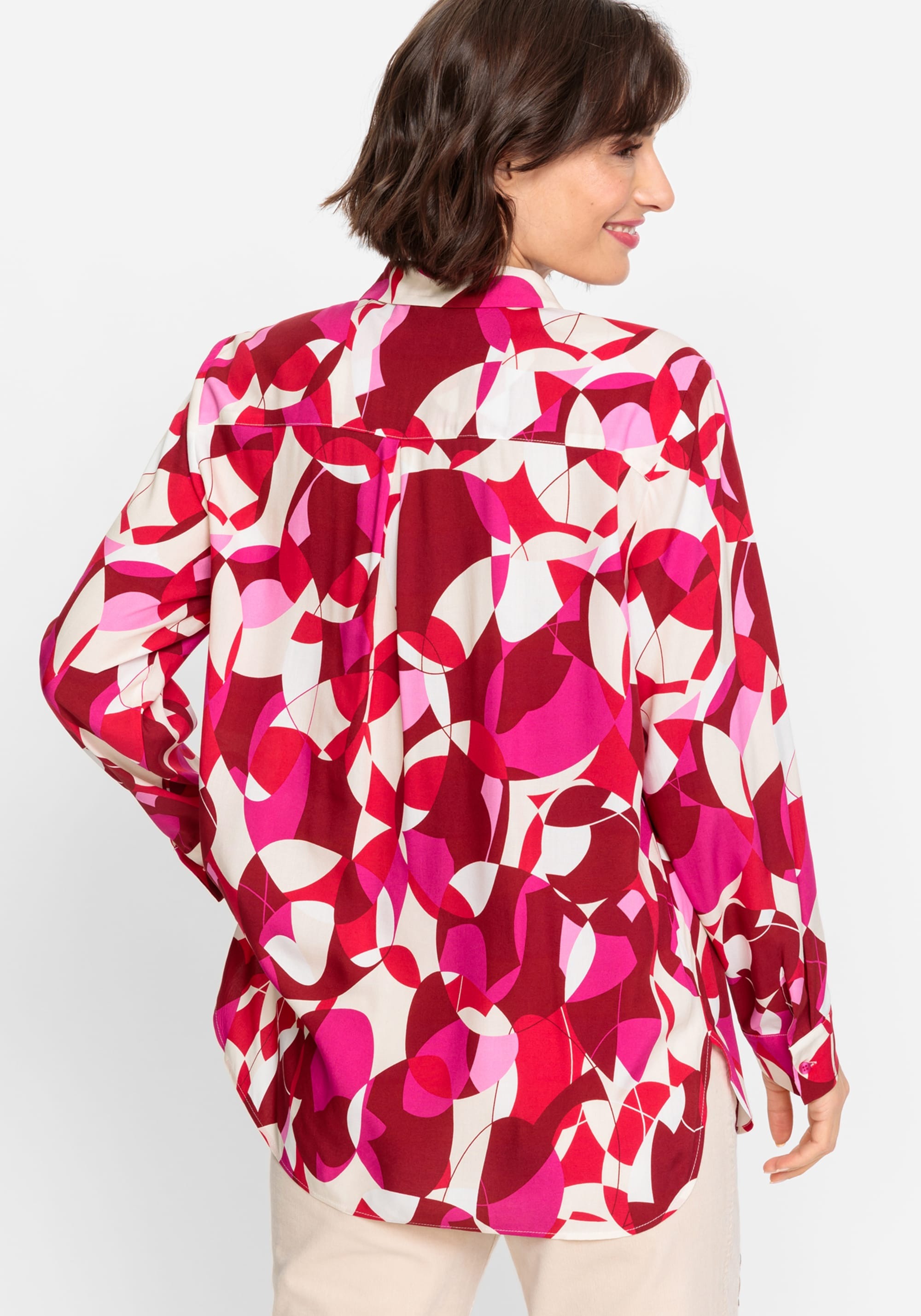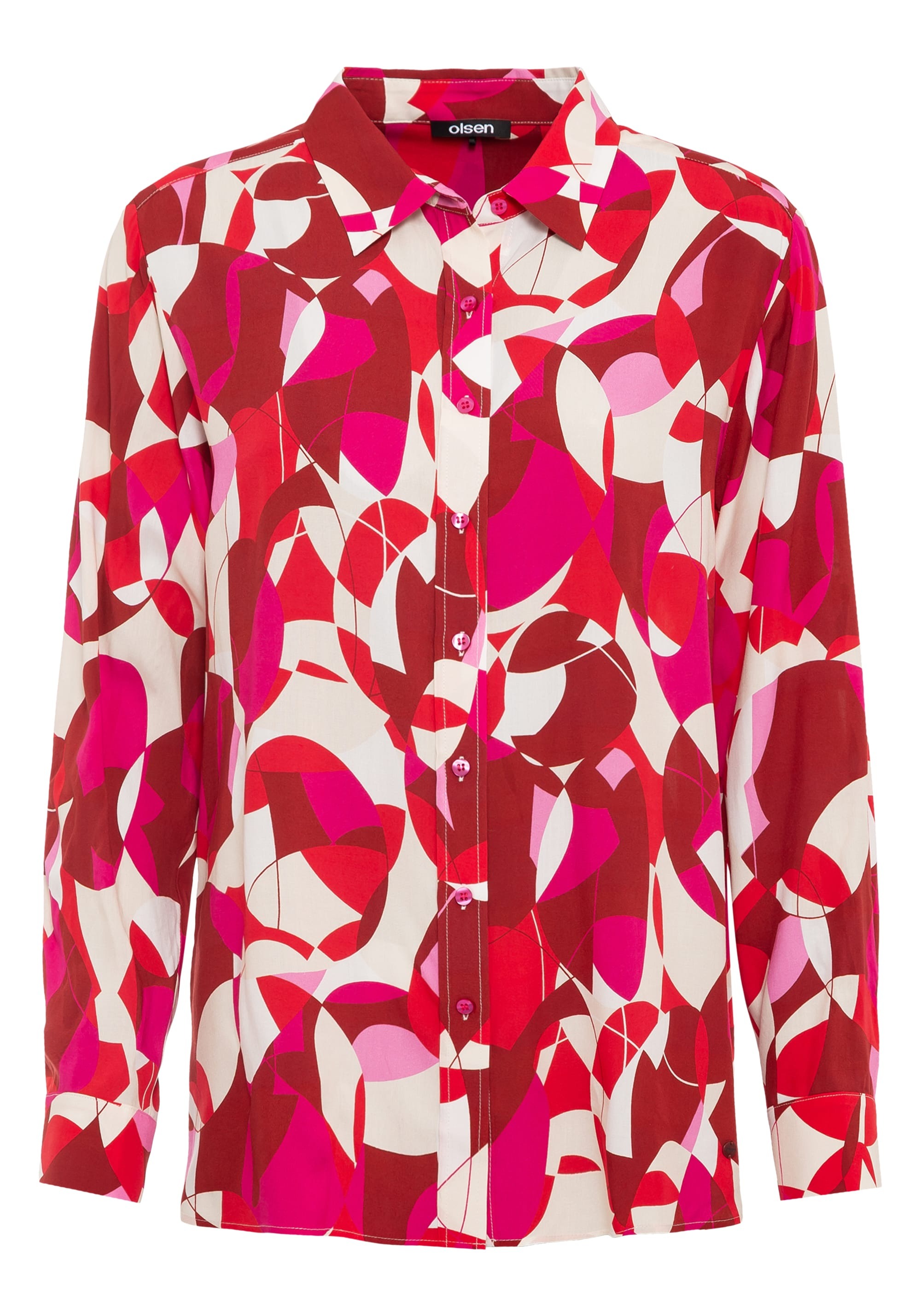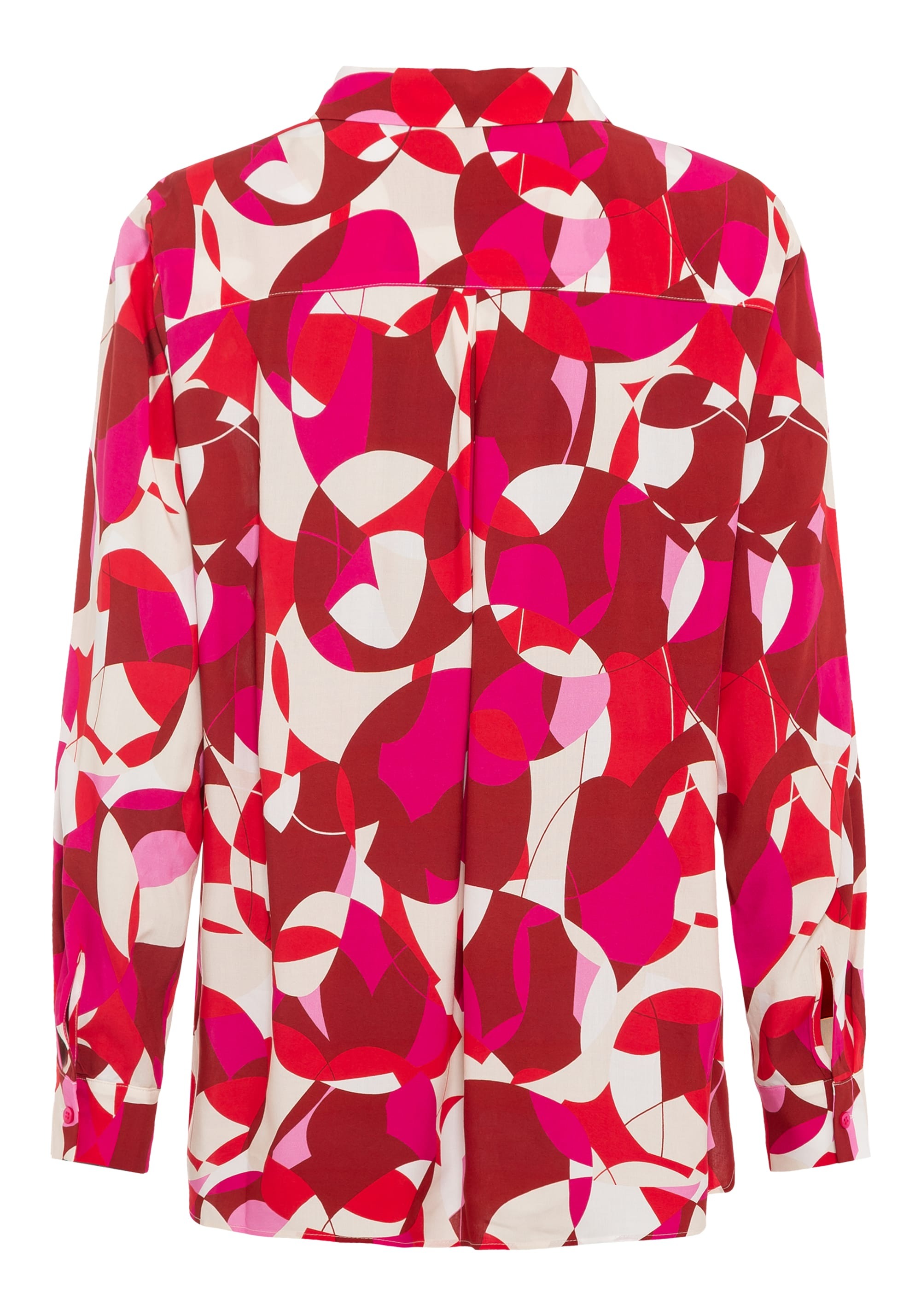 Классическая рубашка с воротником. Украшаена сплошным геометрическим узором в ярких тонах, напоминающий о 70-х годах. Эта легкая рубашка с струящейся драпировкой имеет планку на пуговицах спереди и рукава с манжетами.