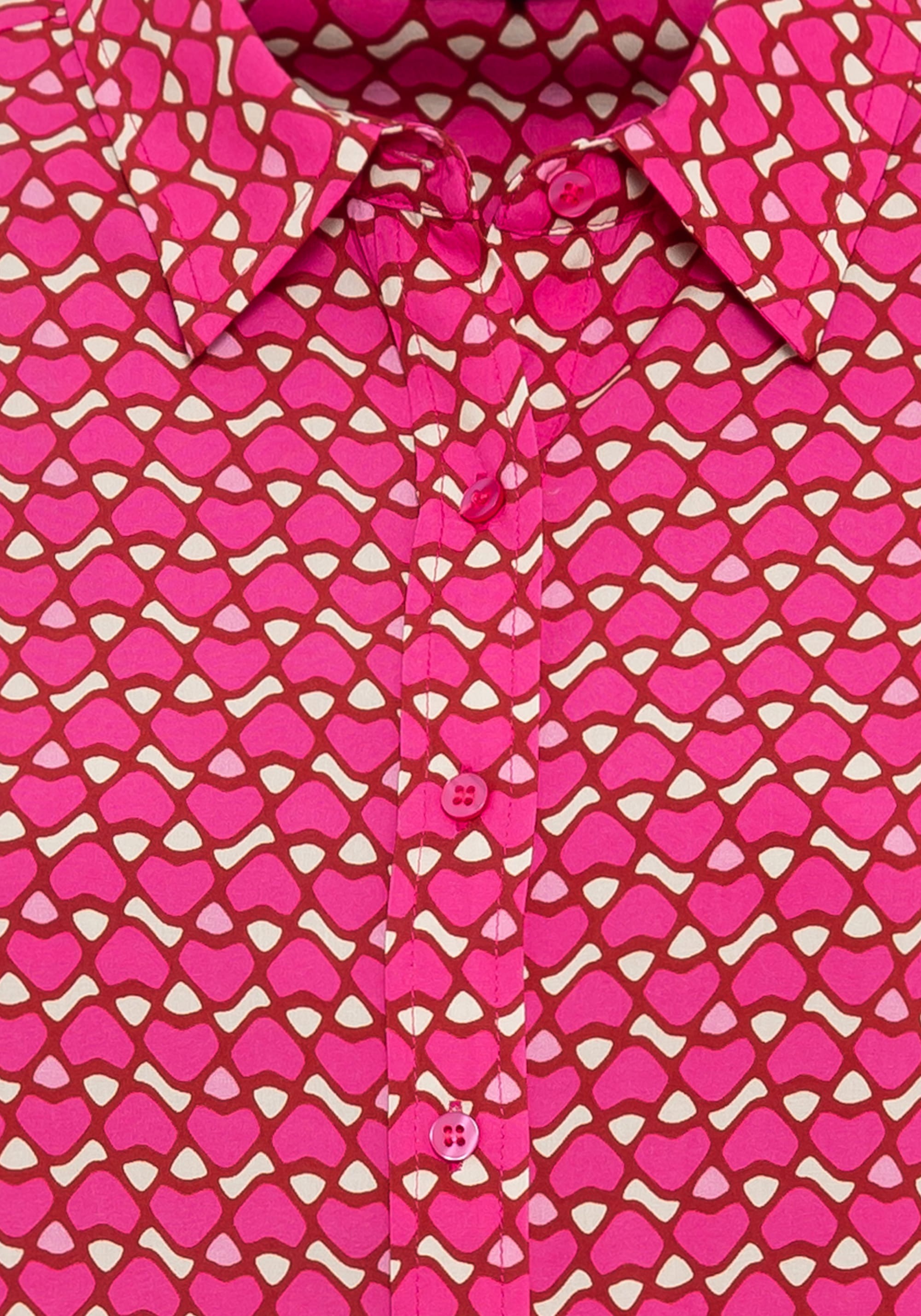 Яркая рубашка с очаровательным узором в виде сердечек по всей поверхности. В нем присутствуют все классические элементы рубашки: отложной воротник, планка на пуговицах спереди, рукава с манжетами и изящная складка посередине спины.