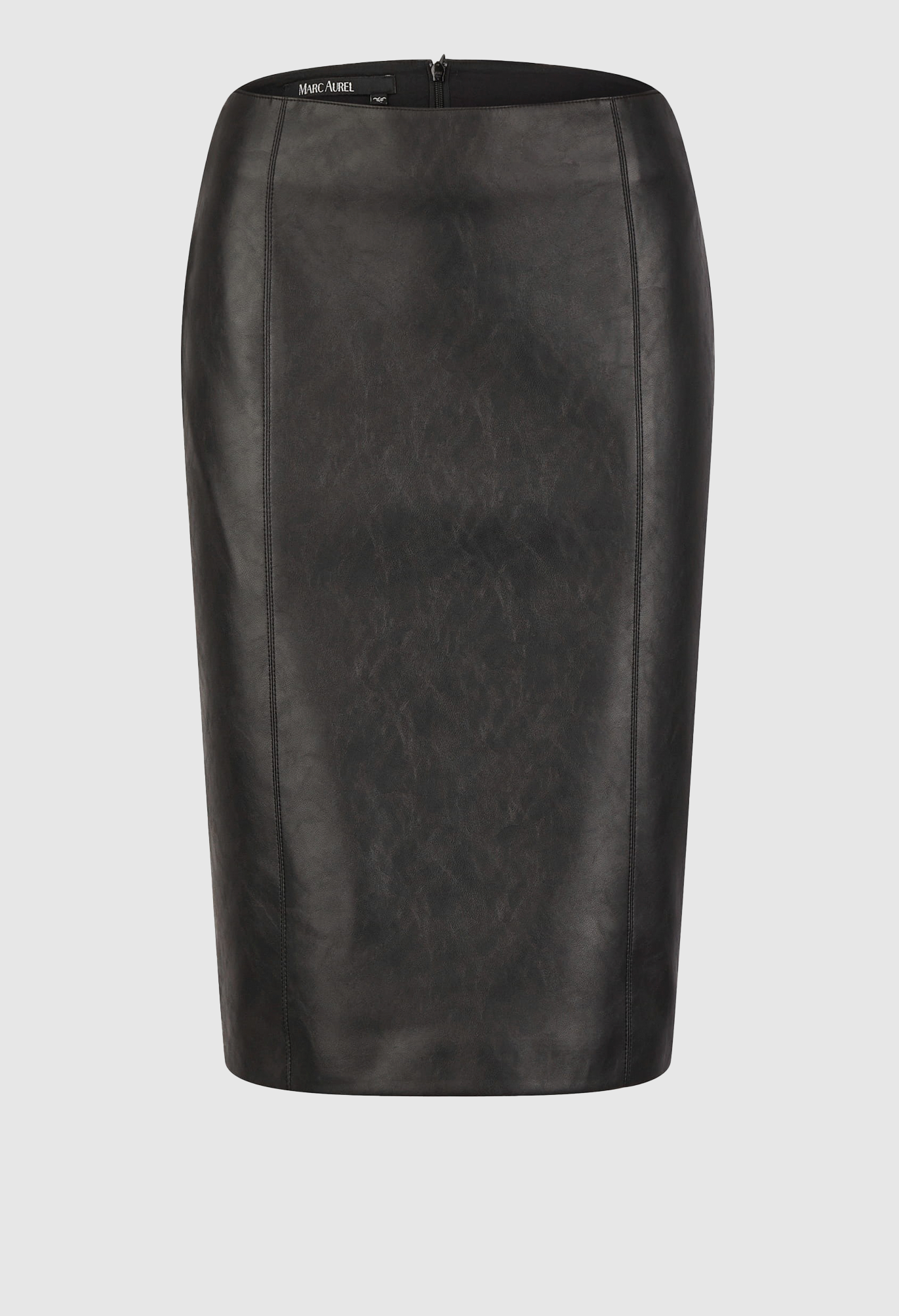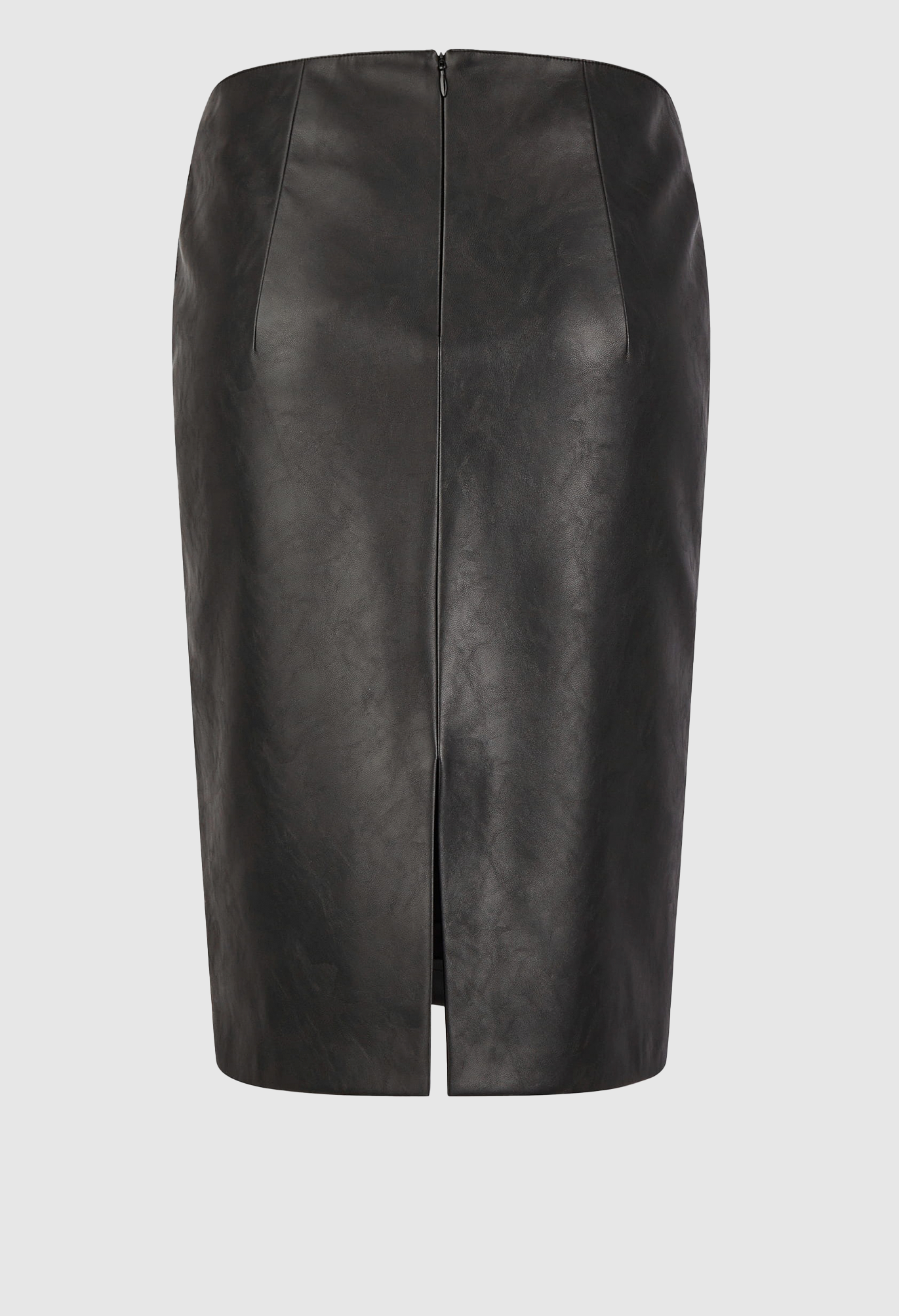 Стильная юбка из искусственной кожи наппа впечатляет завышенной талией и облегающим силуэтом. Эластичная ткань и разрез по центру спинки обеспечивают комфорт и свободу движений.