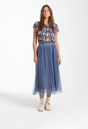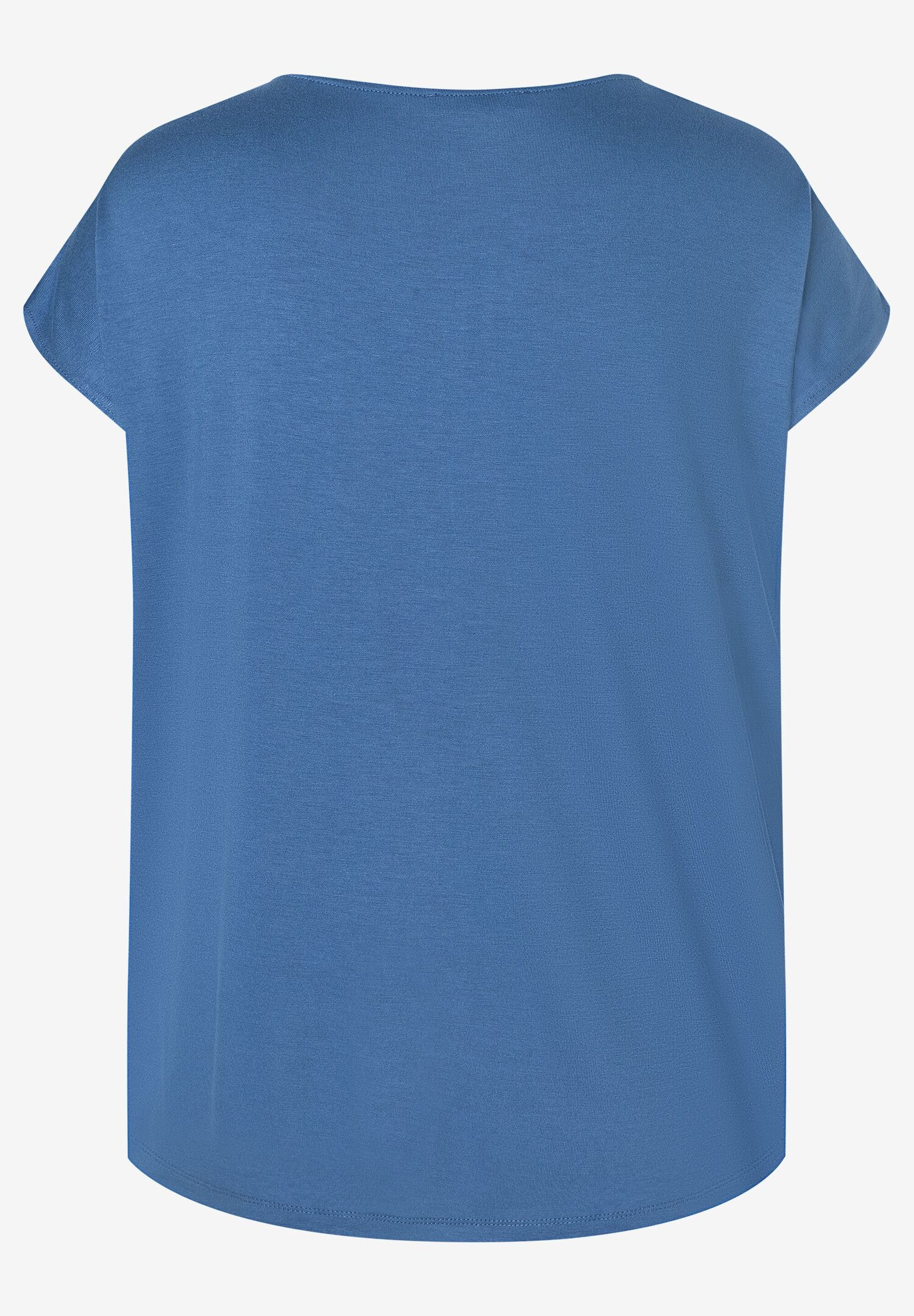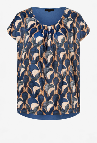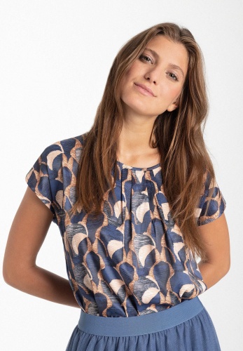 Свободная блузка-рубашка с современным графическим принтом и плиссированной деталью на вырезе. Прямая, свободная форма со спущенными плечами, круглый вырез горловины со складками спереди, сзади немного длиннее, чем спереди. Передняя часть из струящейся ткани. Спинка из мягкого вискозного трикотажа дымчато-синего цвета. Длина по размеру 42 - 64 см.