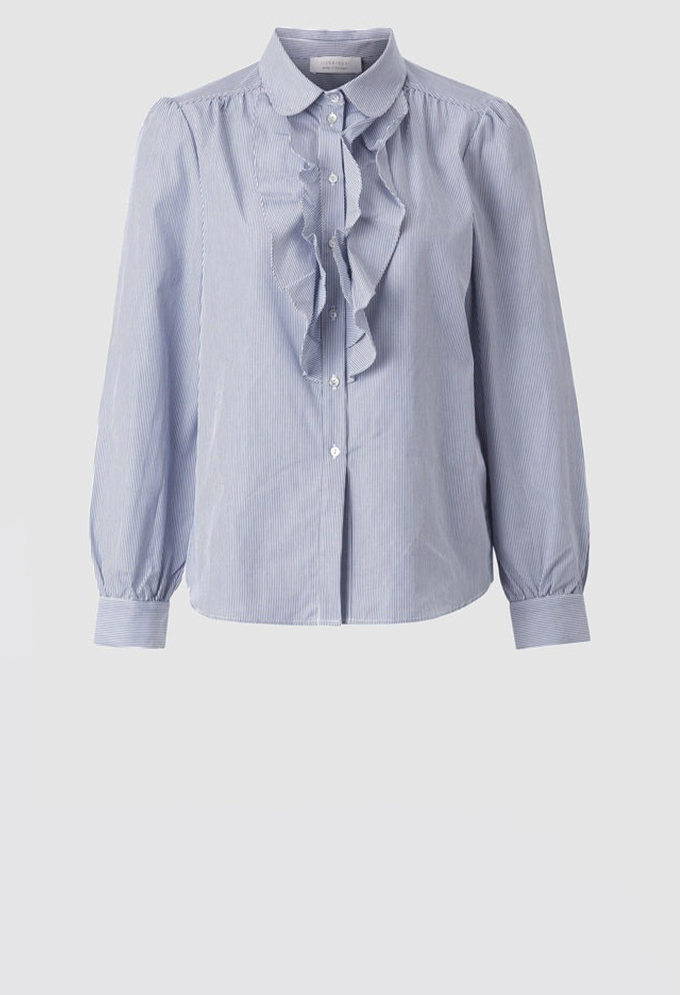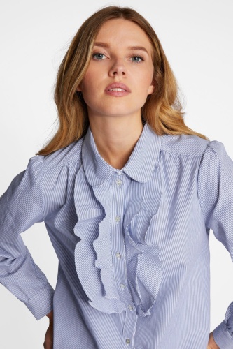 Блузка широкого кроя имеет воротник в стиле Питера Пэна и романтические рюши. Он изготовлен из тонкого органического хлопка. Длина для размера 42: 65 см. Окружность груди для размера 42: 90 см.
