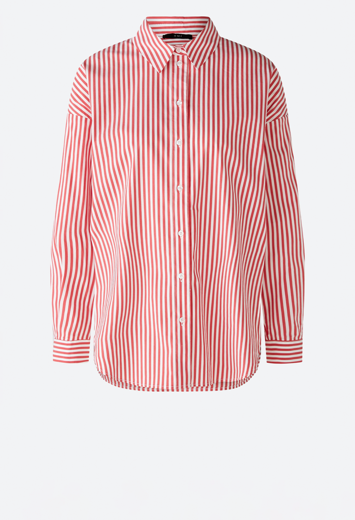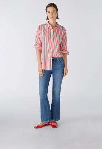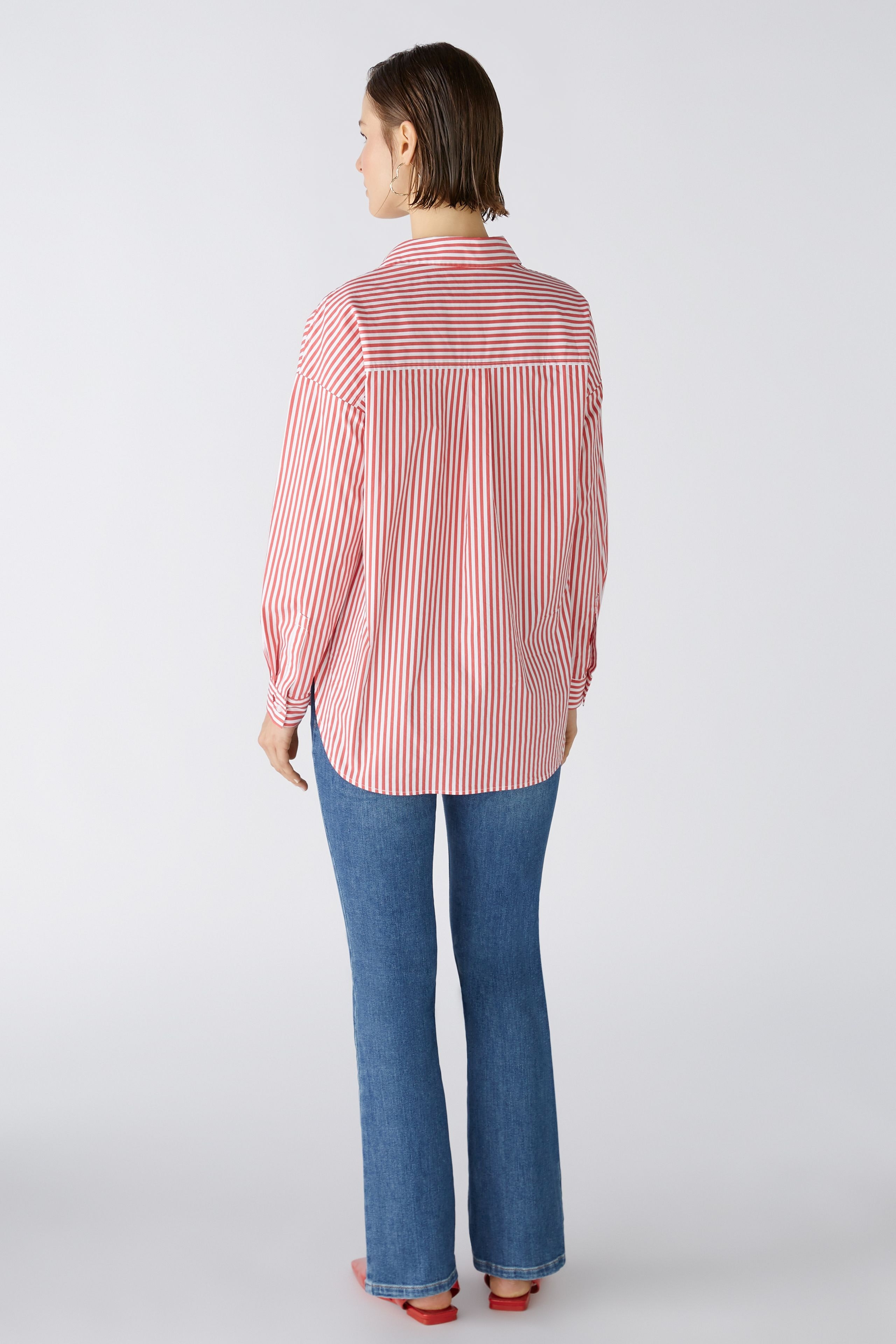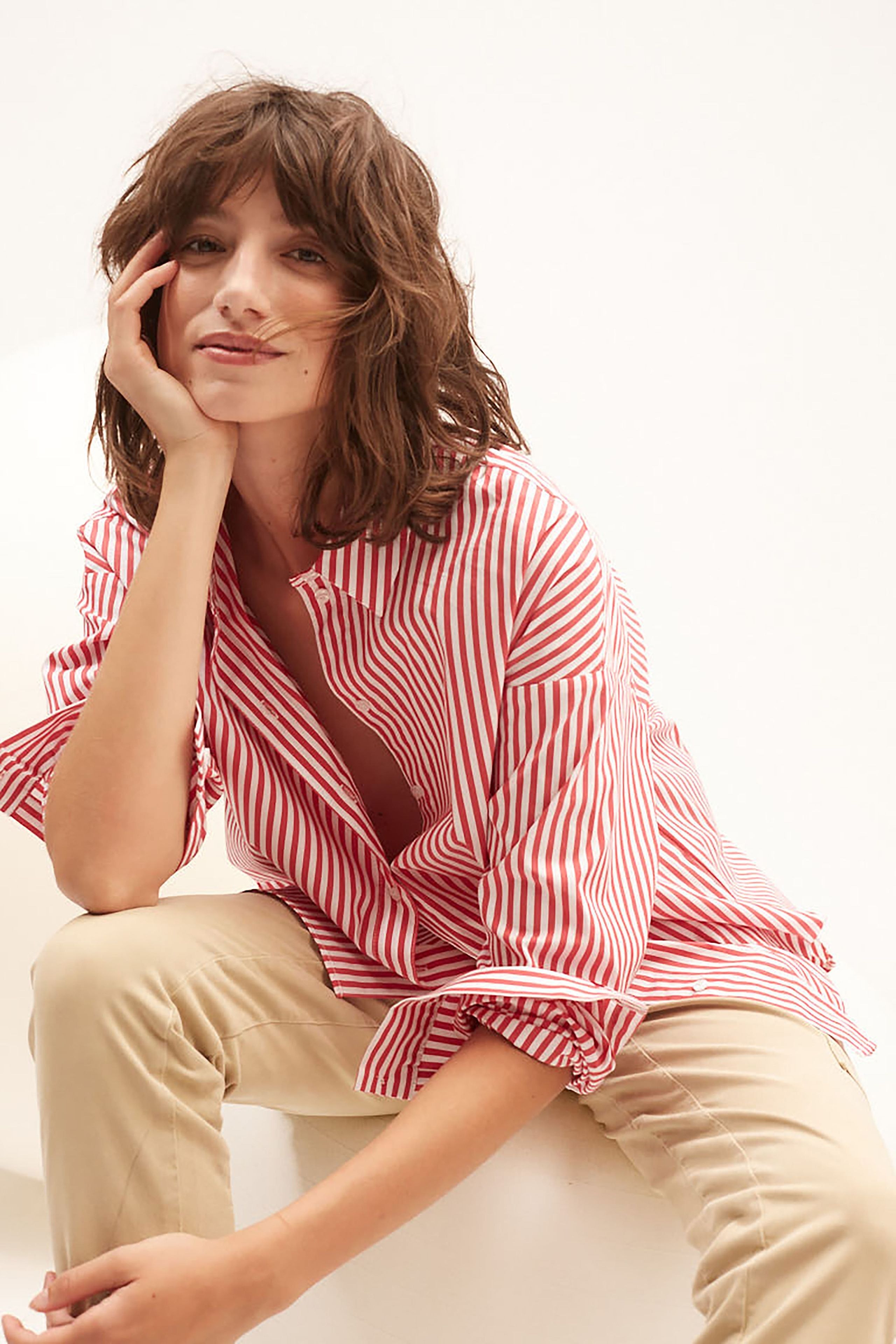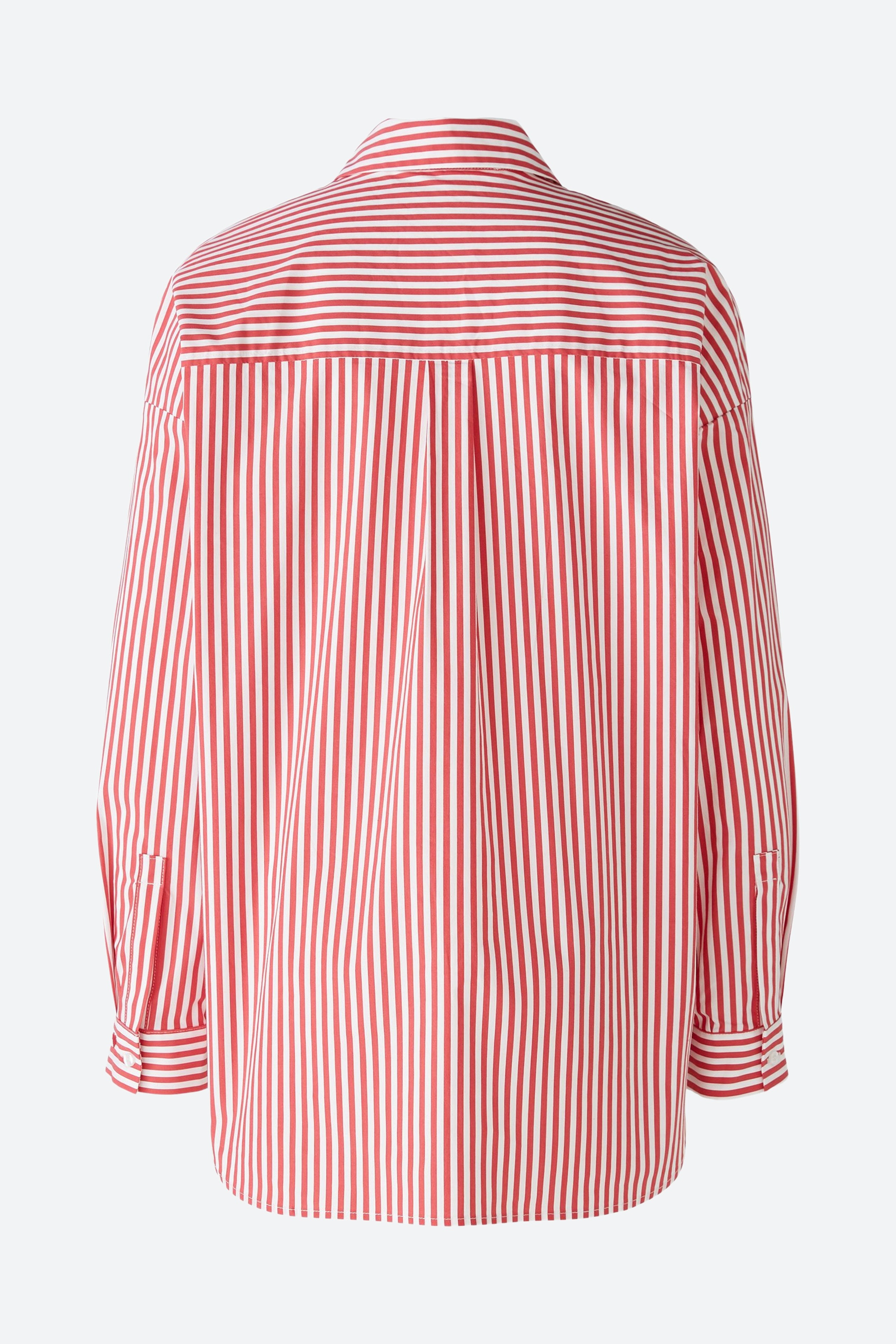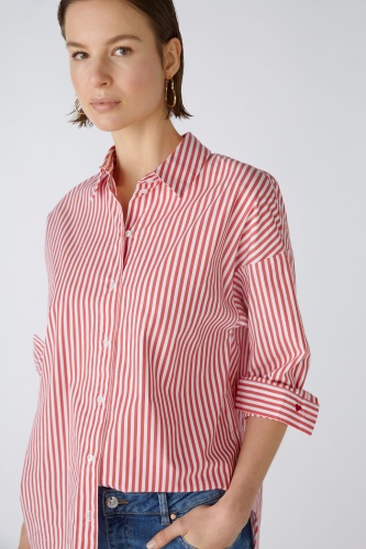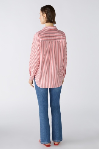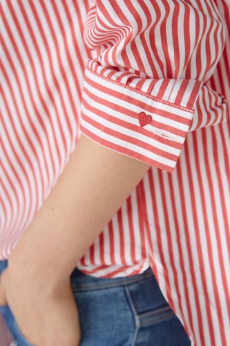 Современная по форме блузка-рубашка с объемом. Смесь хлопка с эластаном, полоски тканые. Модель оверсайз, очень длинная, удлиненная сзади. Классический воротник рубашки с планкой на пуговицах во всю длину. Заниженная линия плеча, длинные рукава с манжетами. Сзади имеется складка для дополнительной свободы движений. Любимая деталь: маленькое сердечко на манжете рукава. Длина для размера 42: 76 см.