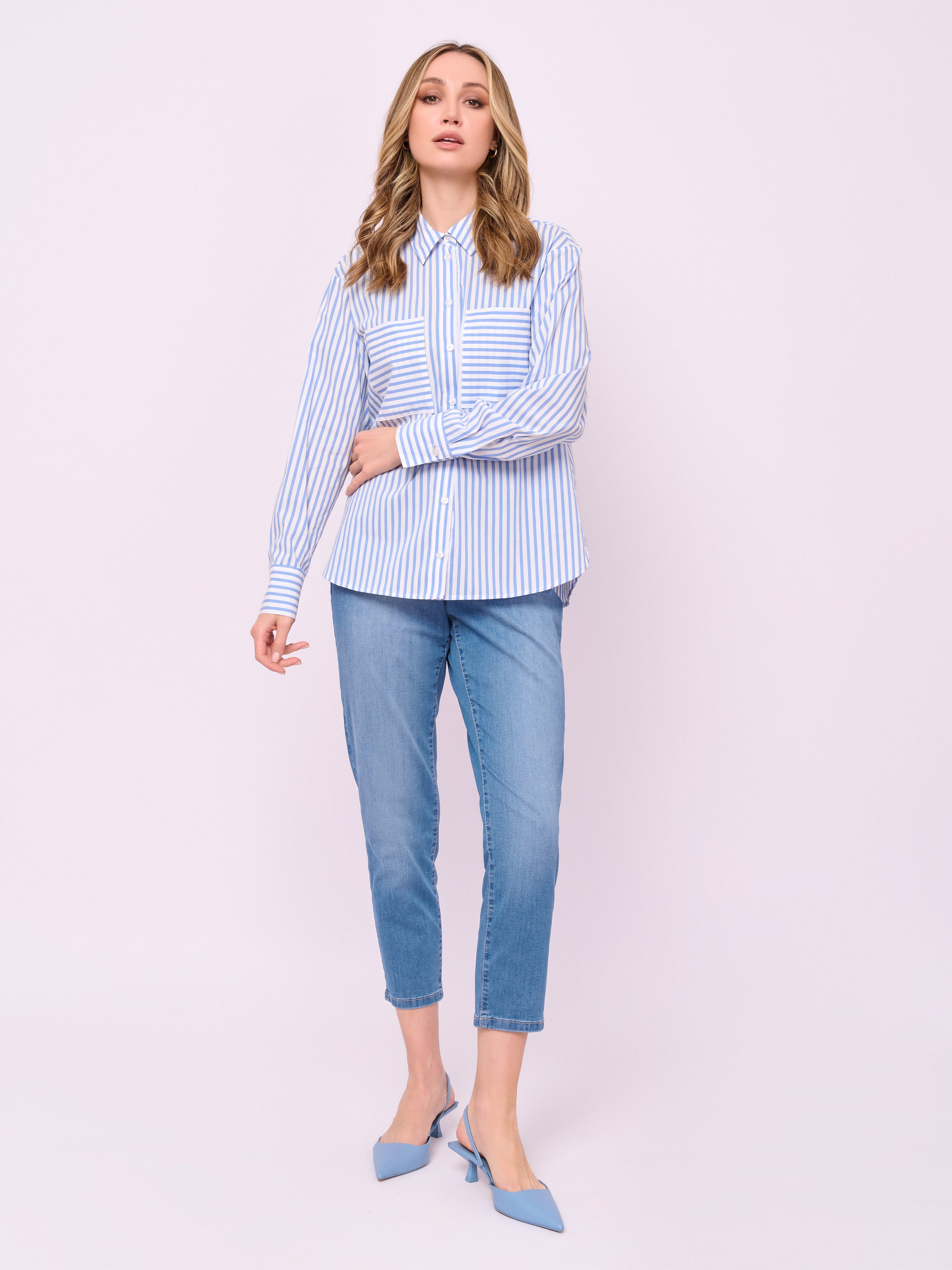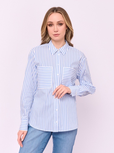 Детали: застежка пуговицы, вырез горловины отложной воротничок, рукава длинные, покрой рубашечный, рисунок полоска, боковые разрезы. Длина по спинке: 67 см.
