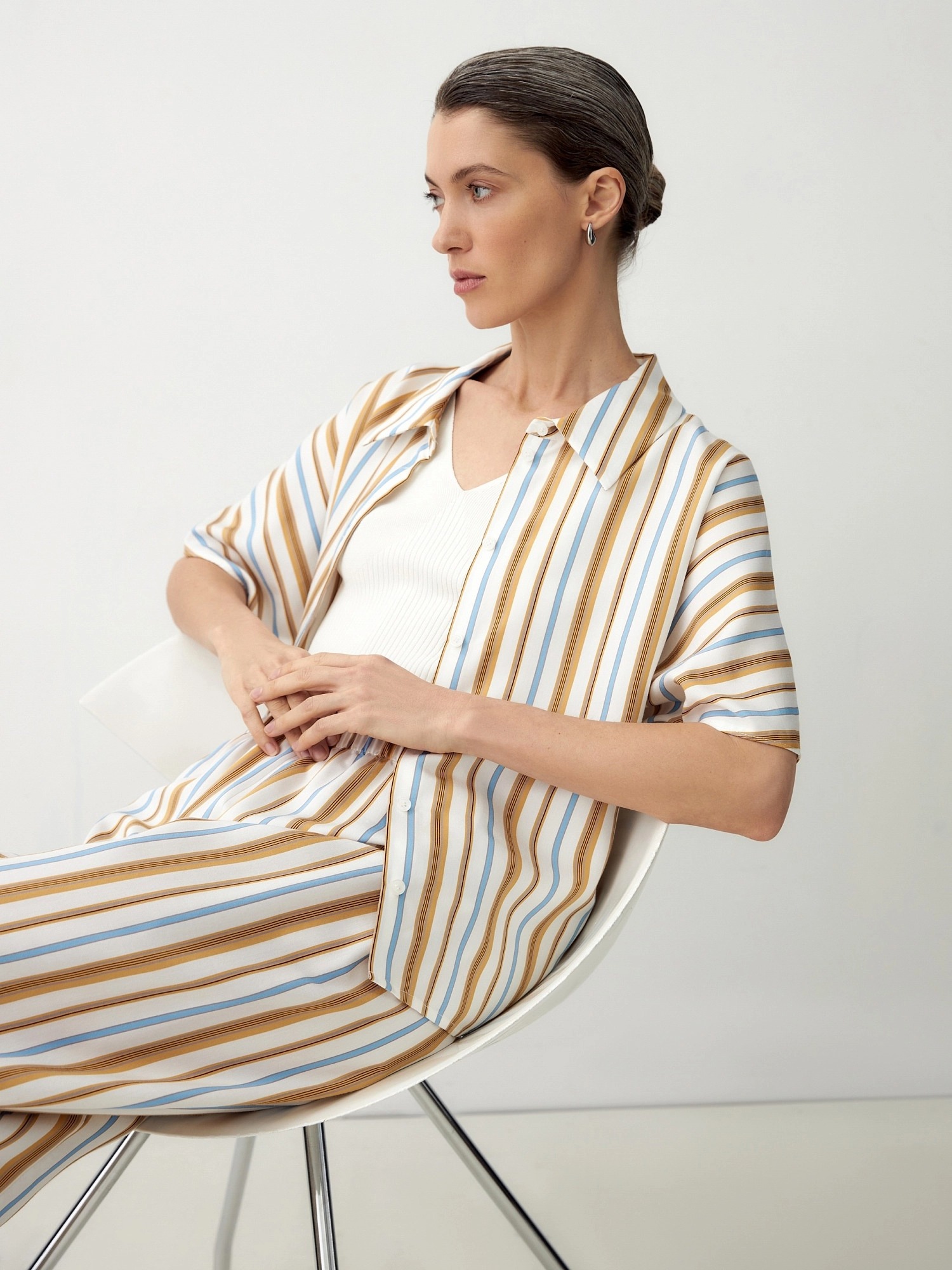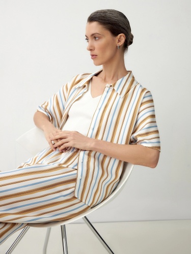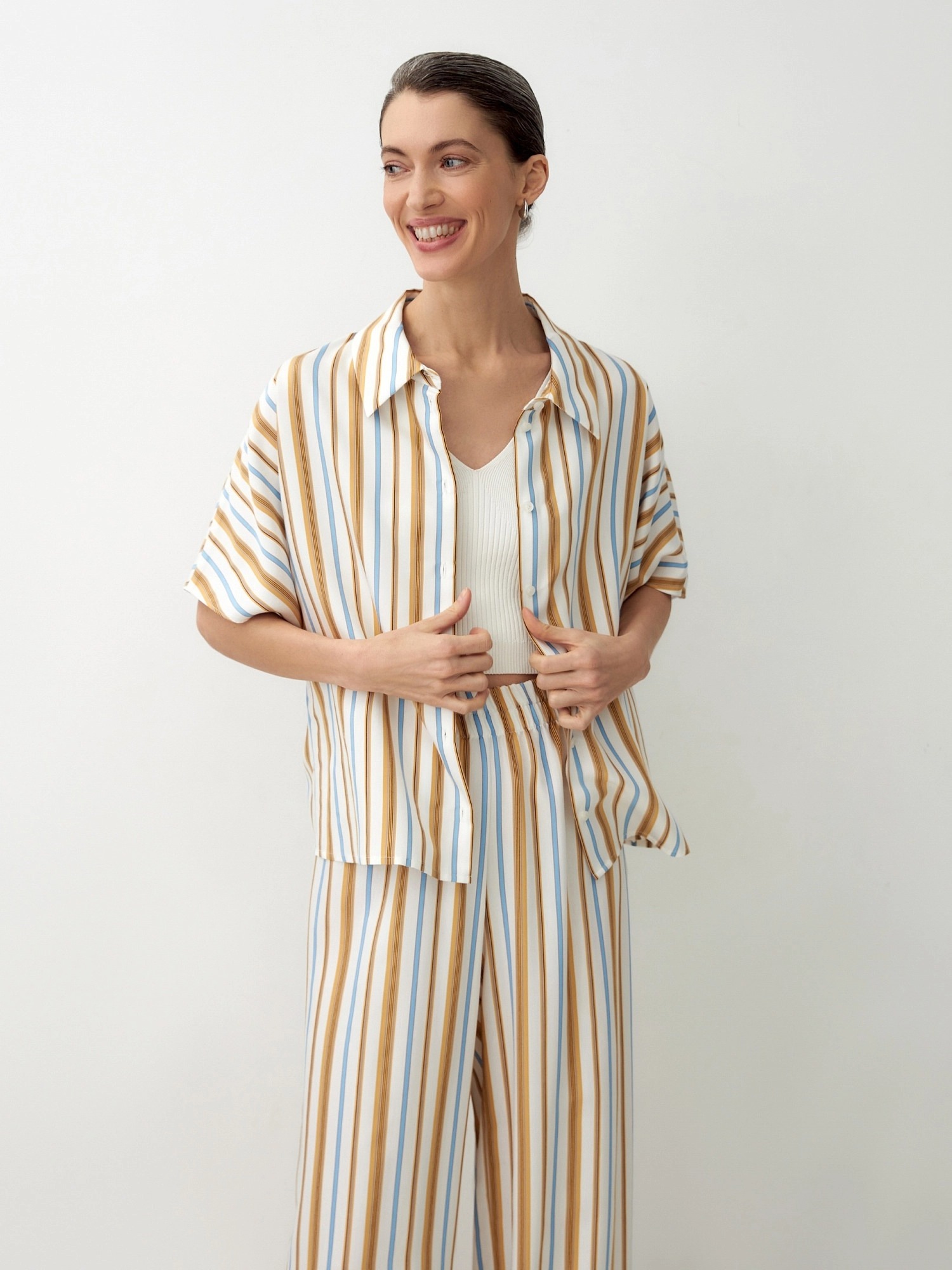Блуза из вискозной ткани прямого силуэта с укороченным рукавом кимоно, классическим отложным воротником и застежкой на пуговицы. По низу по бокам небольшие разрезы. Идеальная блуза для создания женственных и комфортных городских образов.