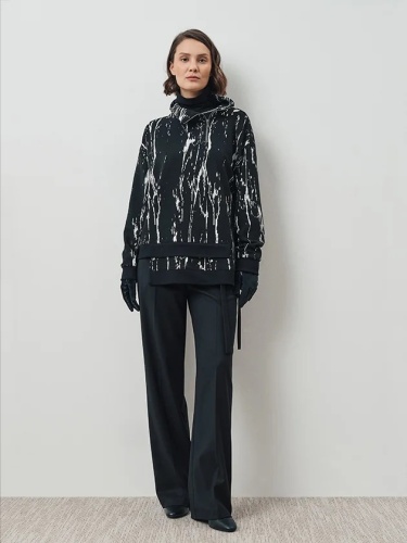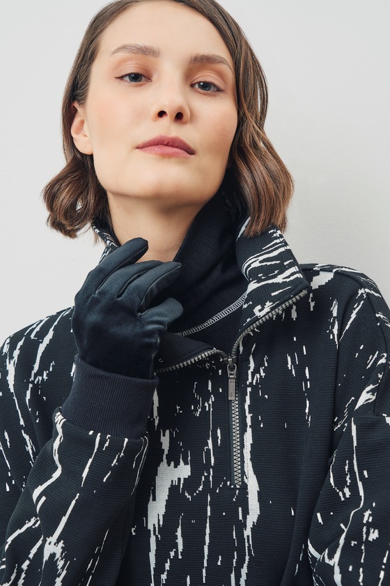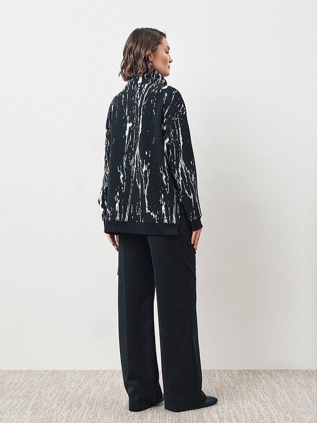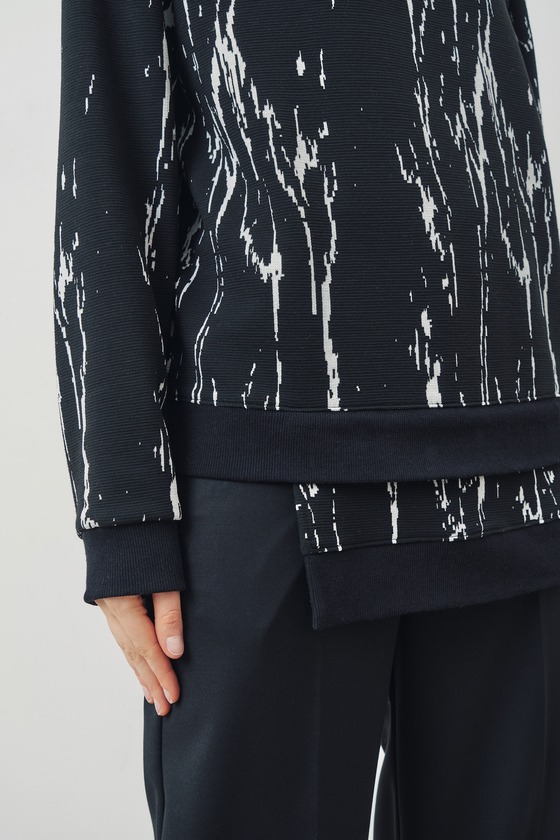 Яркая трикотажная блуза. Принт имитирует черный мрамор со светлыми прожилками. Ворот блузы имеет асимметричную застежку на молнию. Яркий структурный контраст подчеркивает также асимметричная отделка низа изделия.