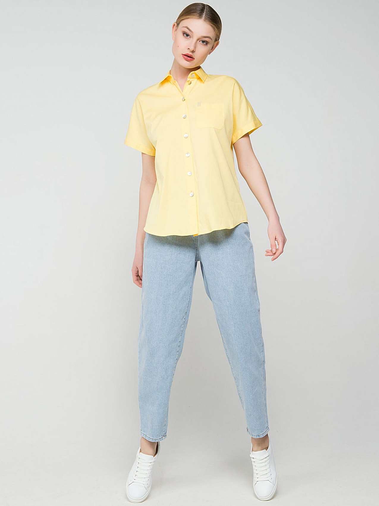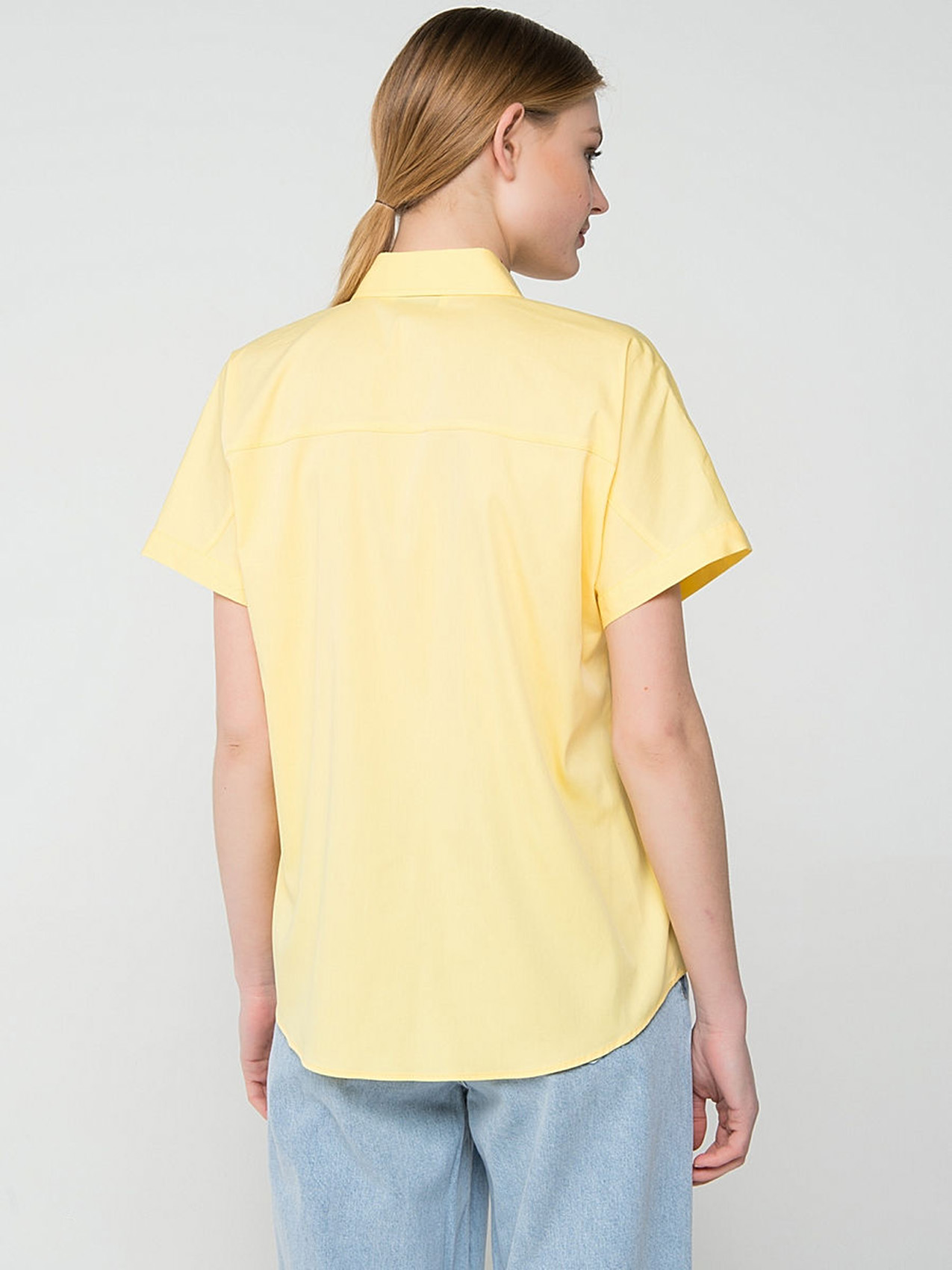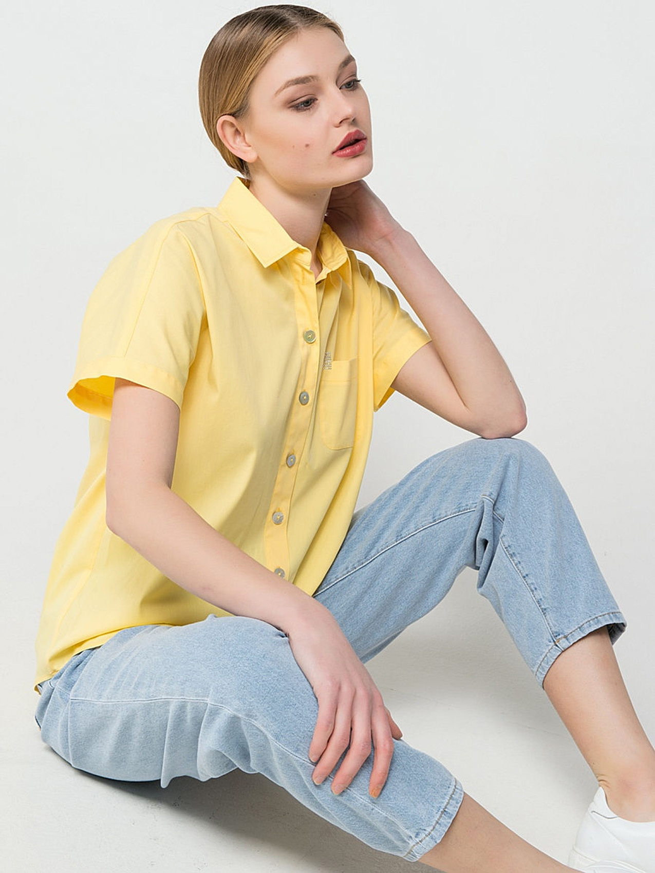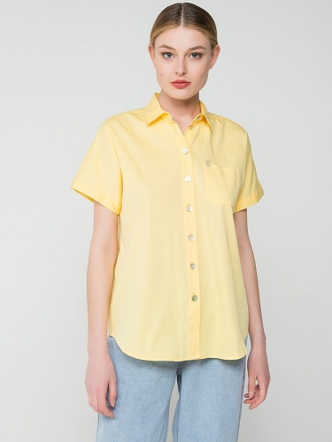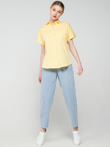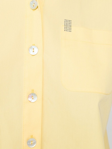 Легкая блузка в трендовом желтом цвете. Отложной воротничок, застежка на пуговицах, короткие рукава, закругленный нижний срез. Элегантная деталь - декорированный стразами кармашек на груди. Эта модель - отличный выбор для летнего делового образа.