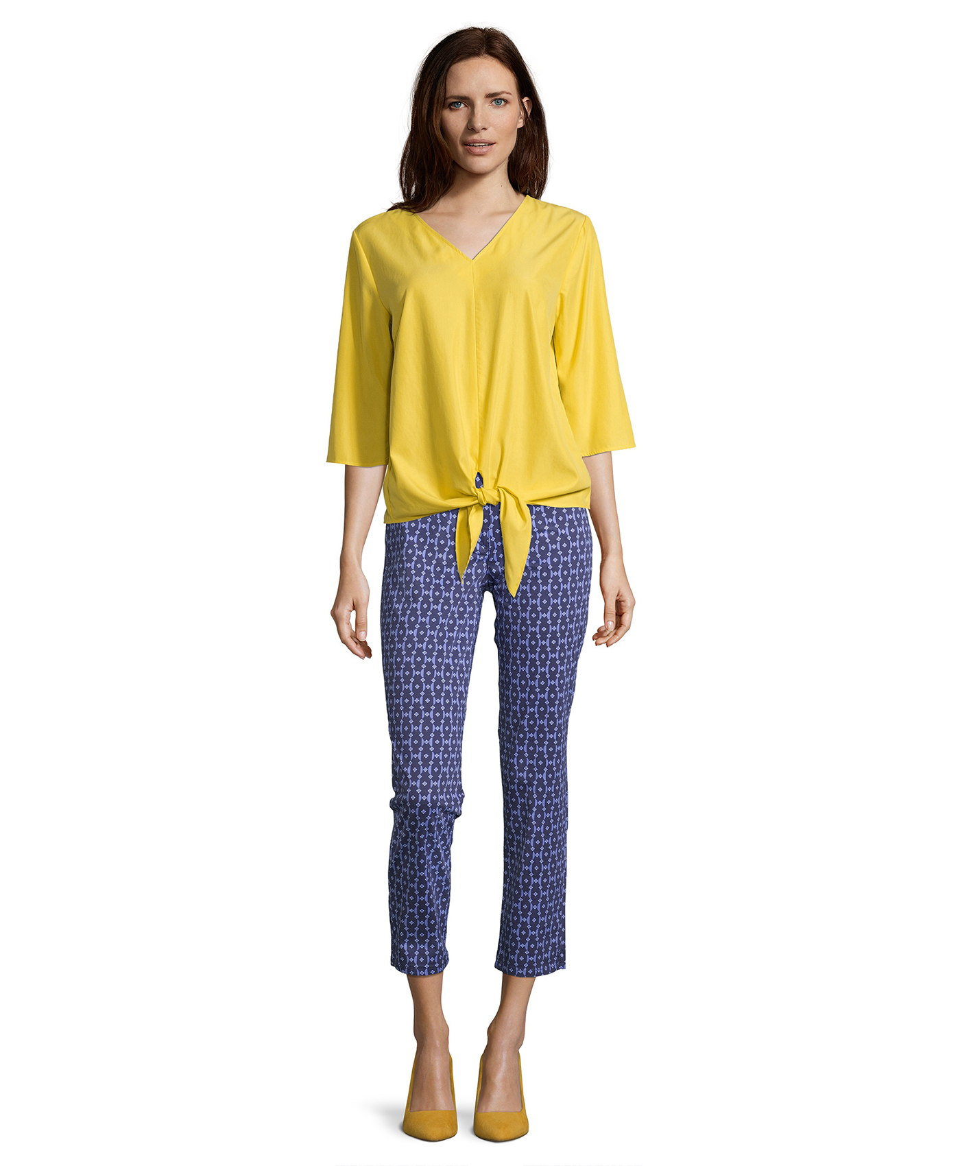 Стильная блуза прямого покроя. V-образный вырез горловины, рукава 3/4. Элегантная деталь дизайна - узелок на нижней части переда изделия. Приятный к телу материал из смеси тенсела и полиэстера. Однотонная блуза является универсальной моделью, с которой можно составить множество модных образов!