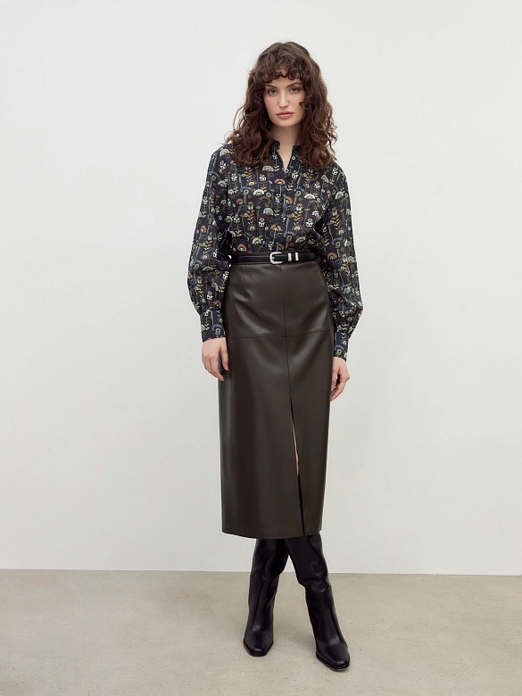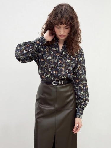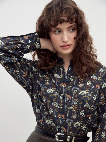 Романтичная свободная классическая блуза из легкой хлопковой ткани с цветочным принтом. Блуза с отложным воротником и пуговицами. Плечевой шов передвинут на полочку. На спинке кокетка со сборкой. Рукав на манжете со сборкой.