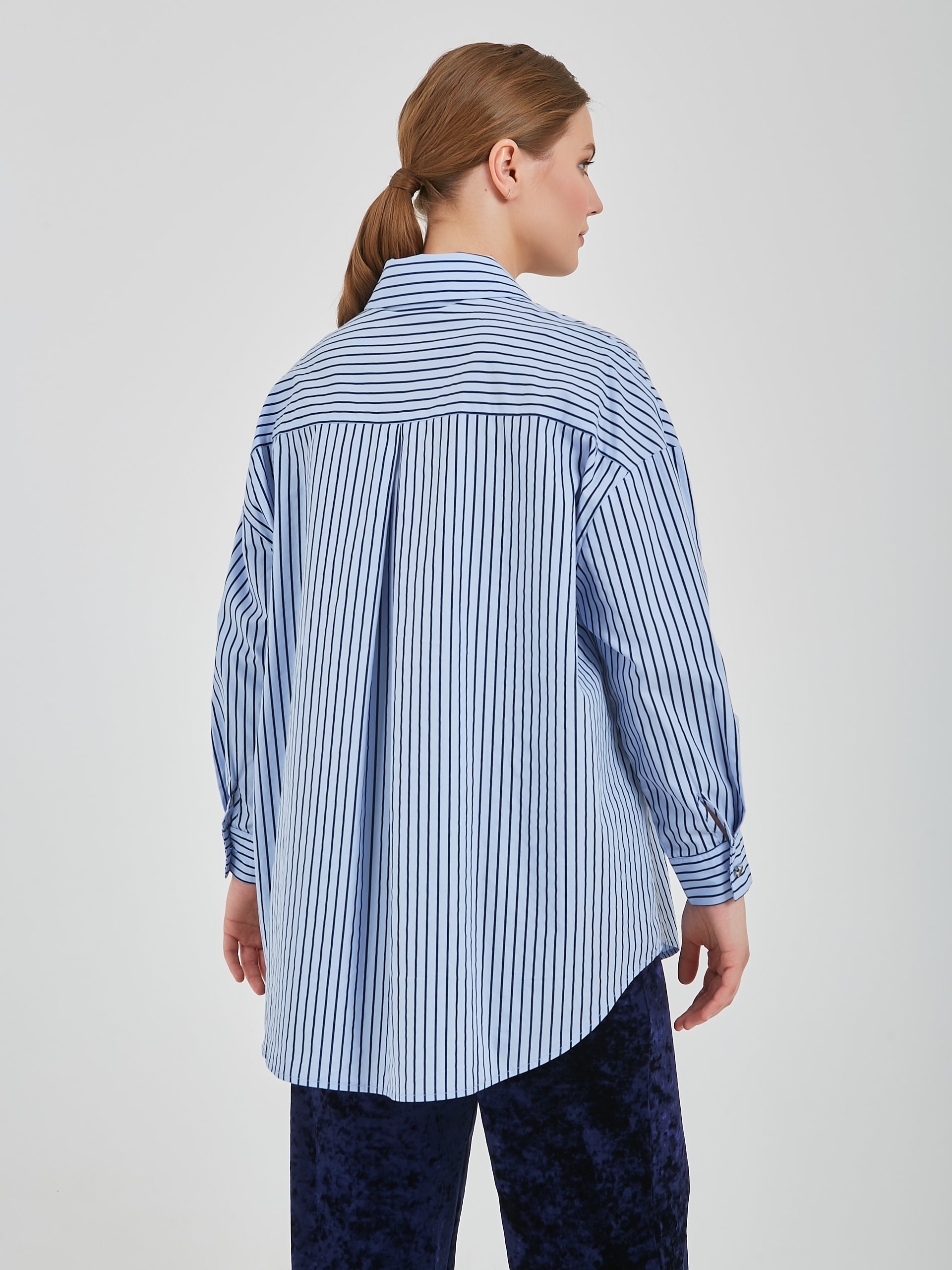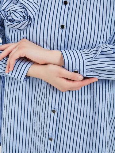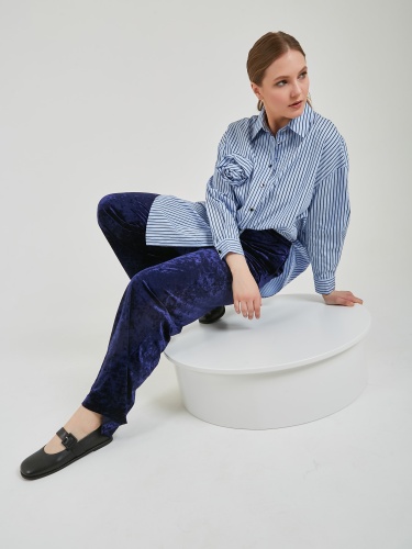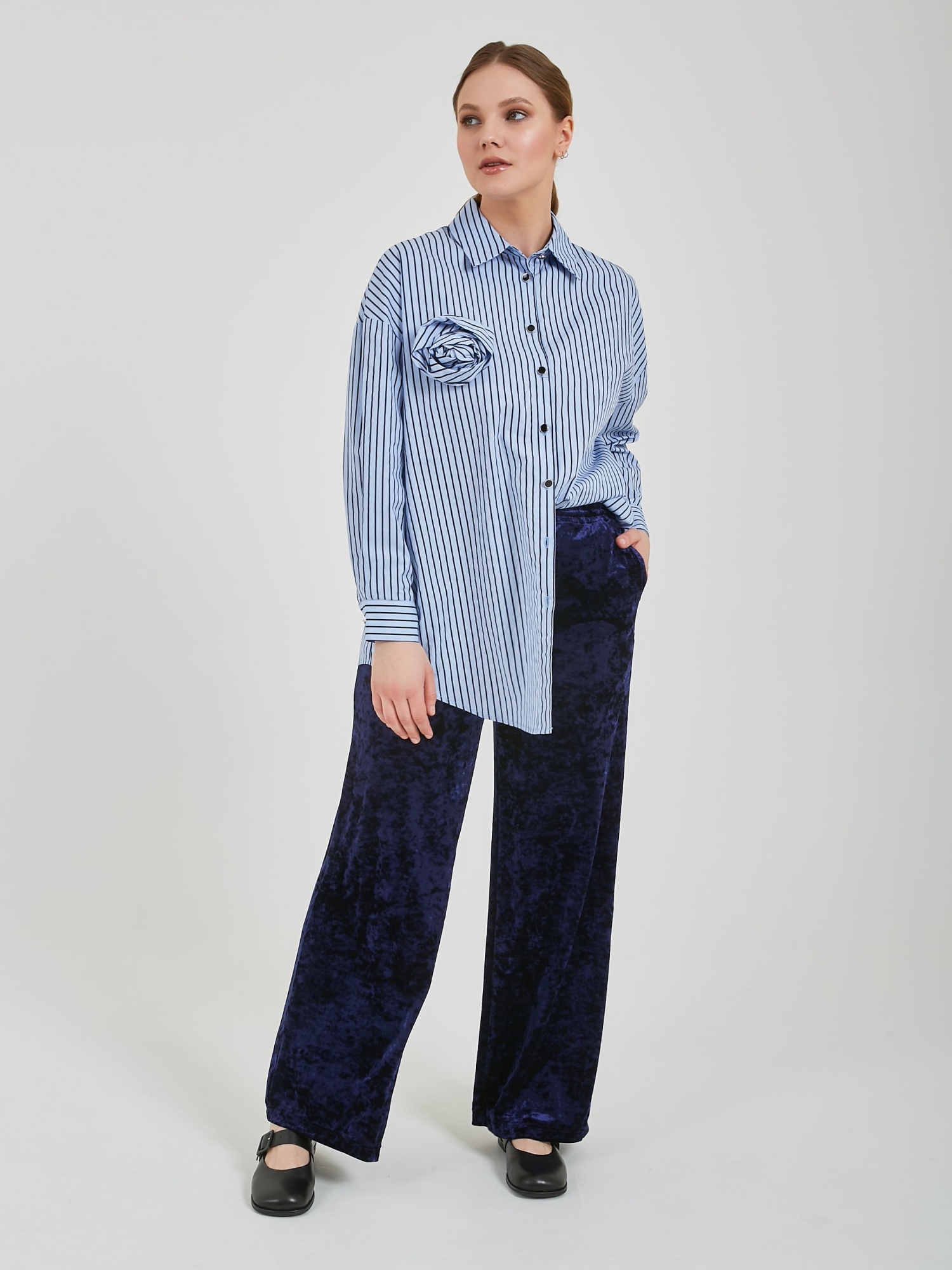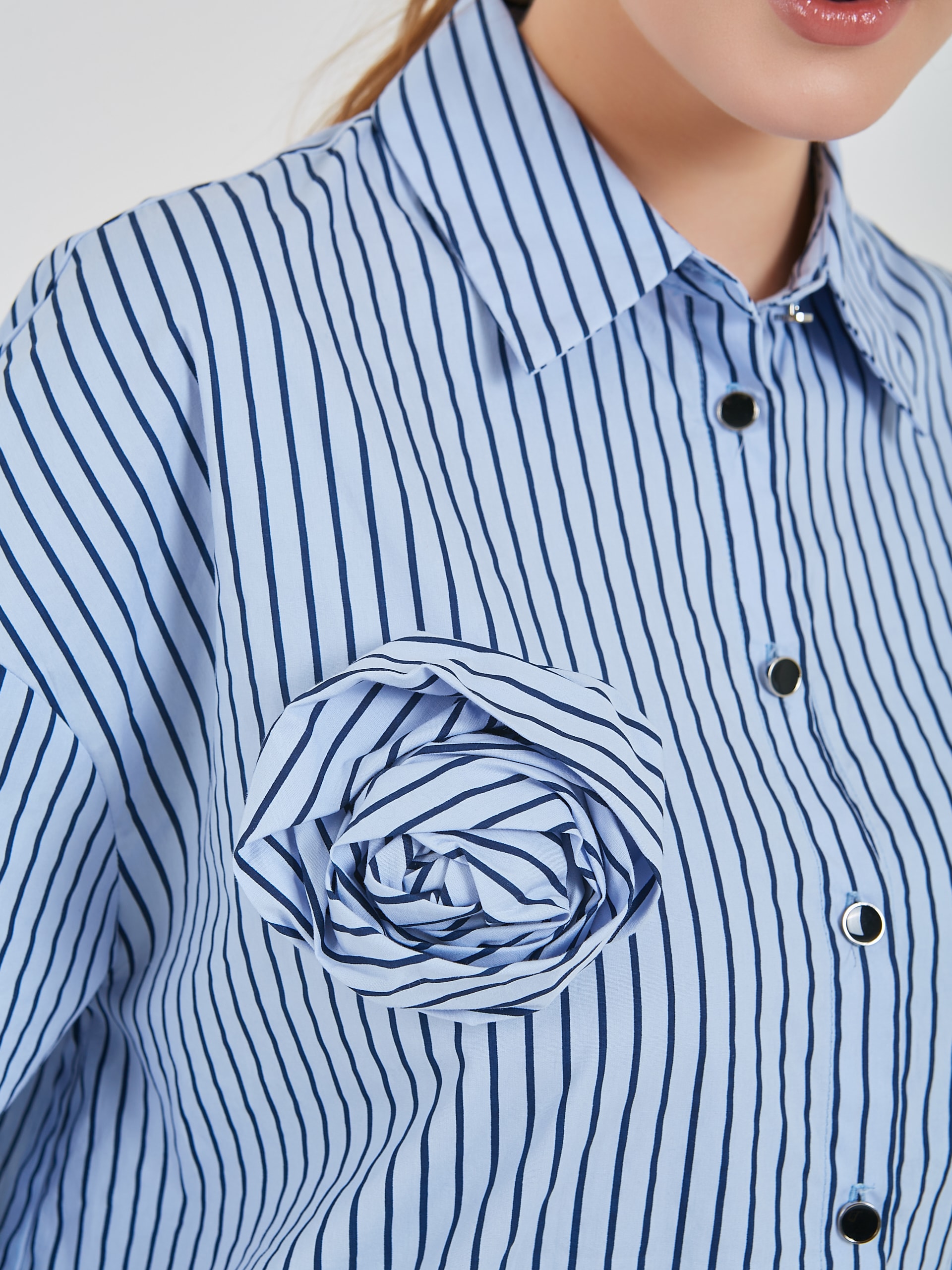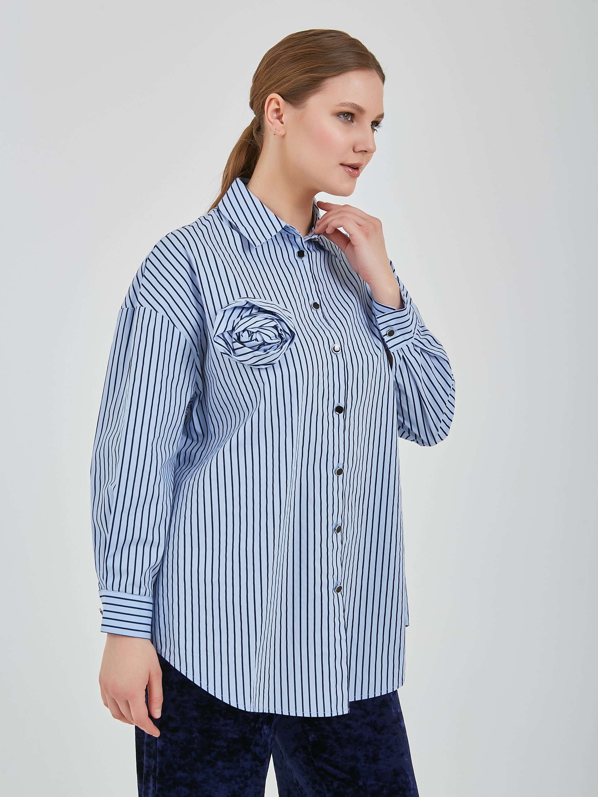 Стильная прямая рубашка в синюю полоску из натурального хлопка. Украшена на груди крупным цветком из основной ткани. Осень-Зима'25/26. Капсула "Лиловый шар"