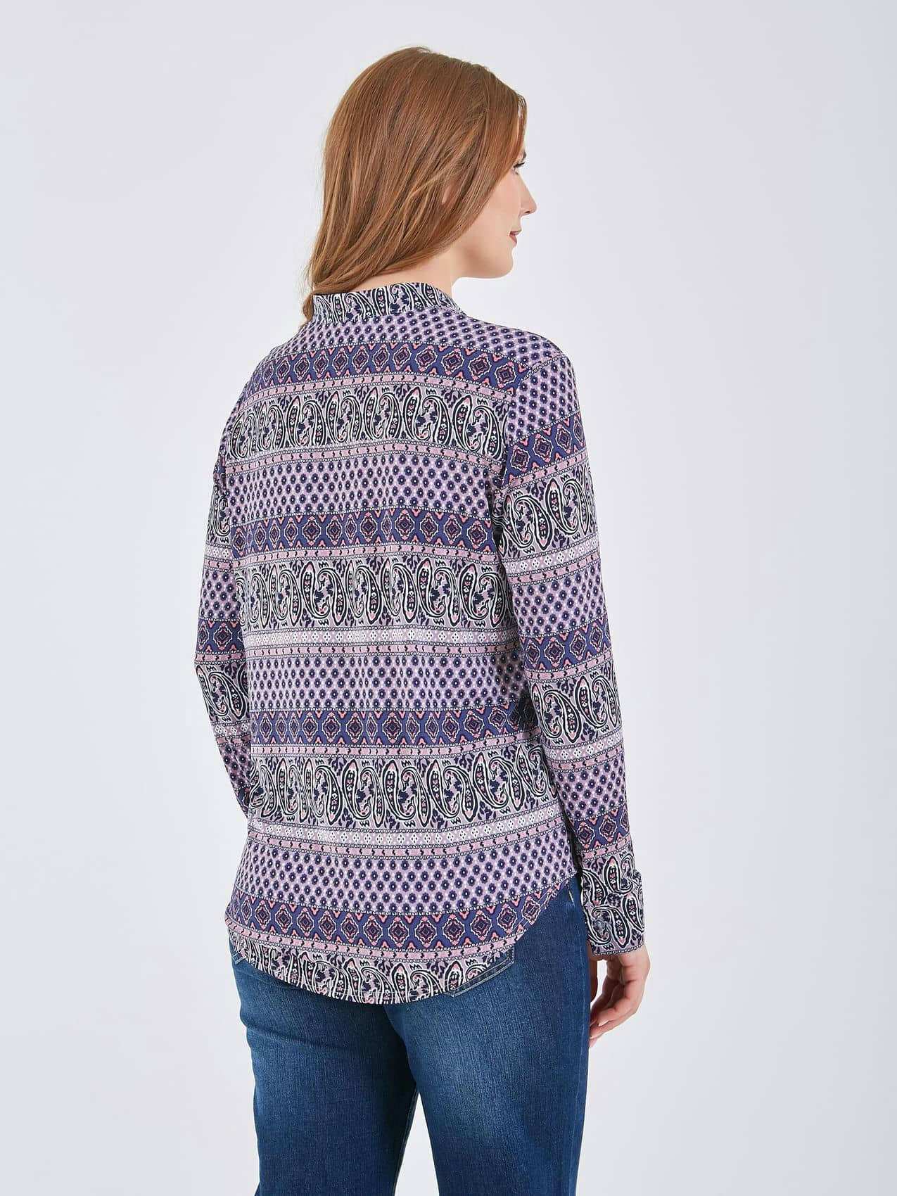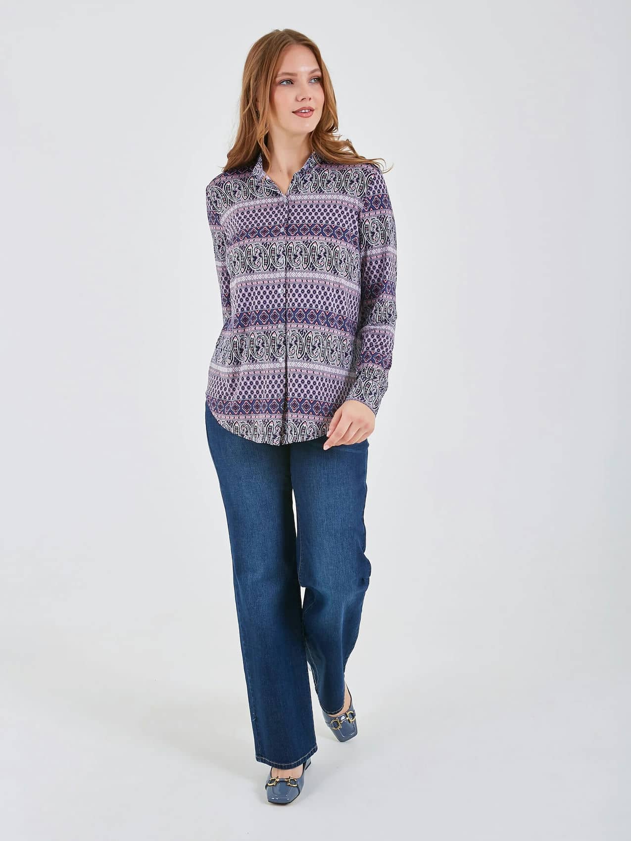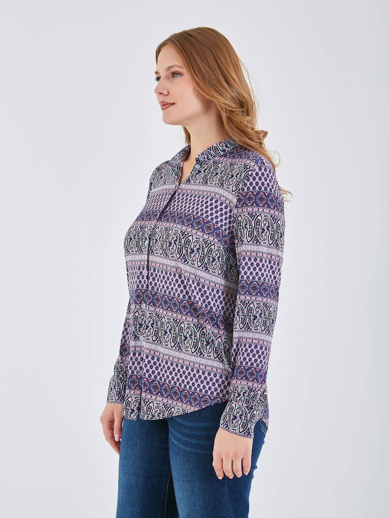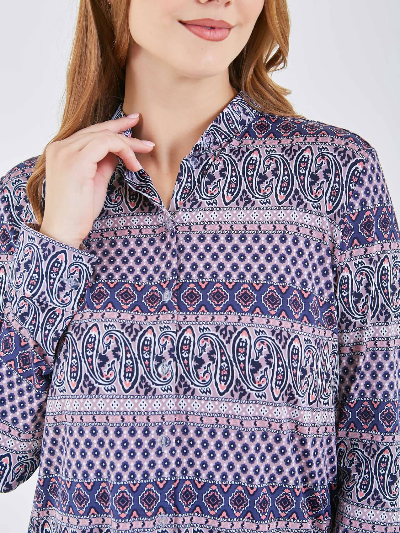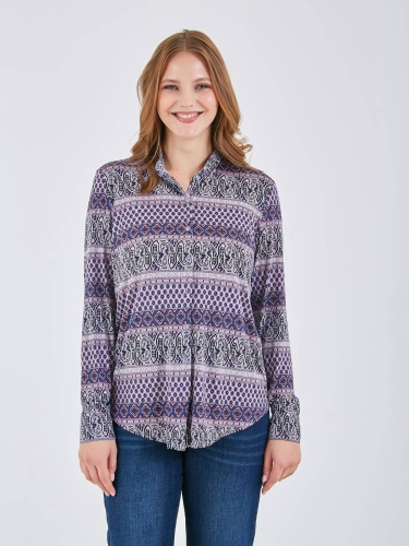 Рубашка выполнена в сине-фиолетовых тонах с дизайном, который идеально подходит для повседневной носки. Она имеет легкий и свободный крой, обеспечивающий комфорт и свободу движений.. Коллекция Весна-Лето 2025. Капсула "Самарканд". Параметры модели: 95-64-101, рост 175, размер 44-46