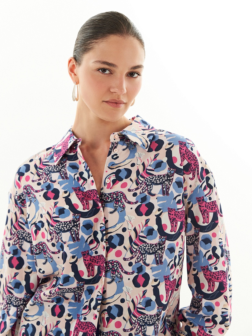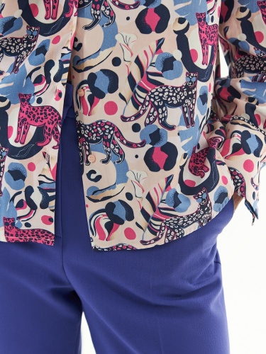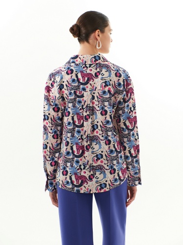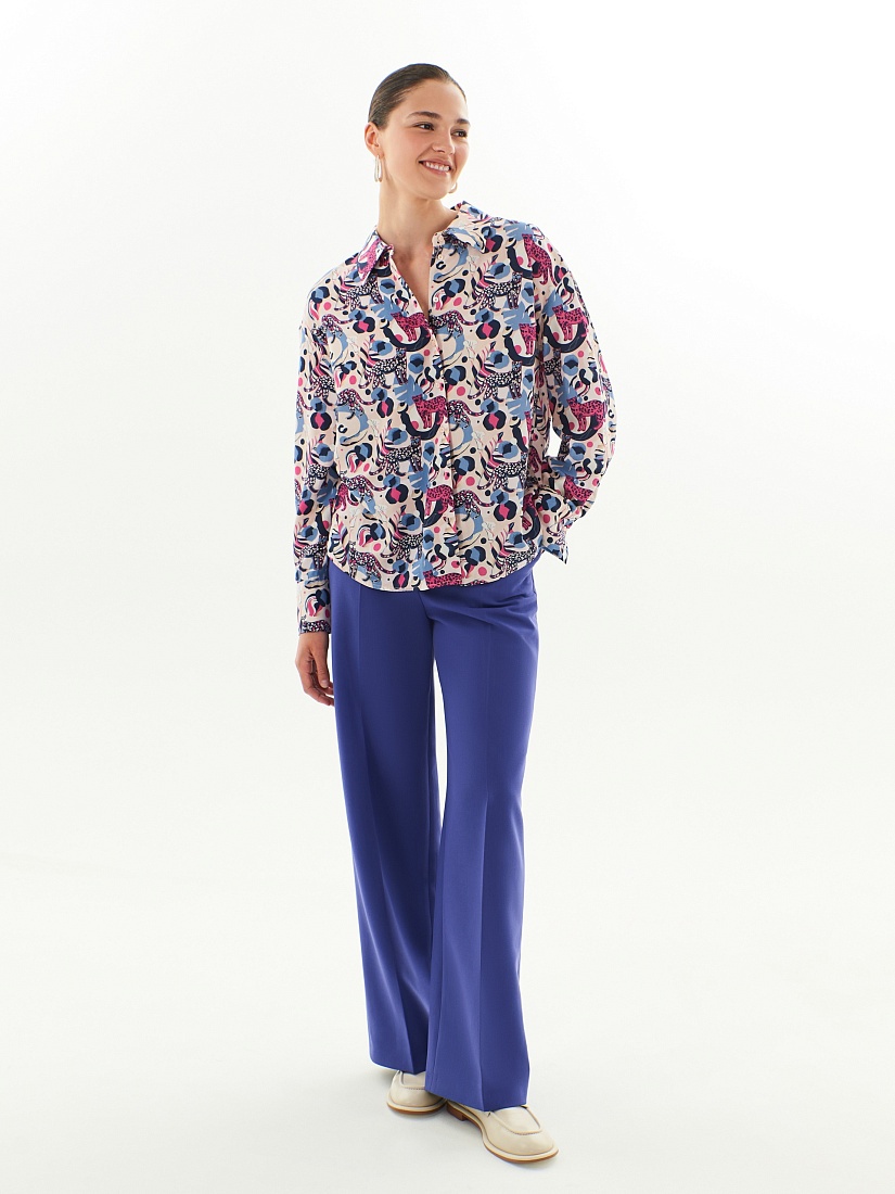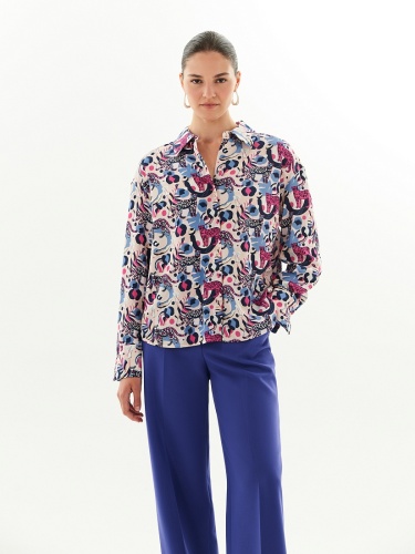 Свободная блуза из натуральной ткани в якром принте, прямого силуэта с классическим отложным воротником и втачным рукавом полной длины на манжете. Застёжка спереди на пуговицы. Яркая блуза добавит в ваш гардероб яркий и свежий акцент.