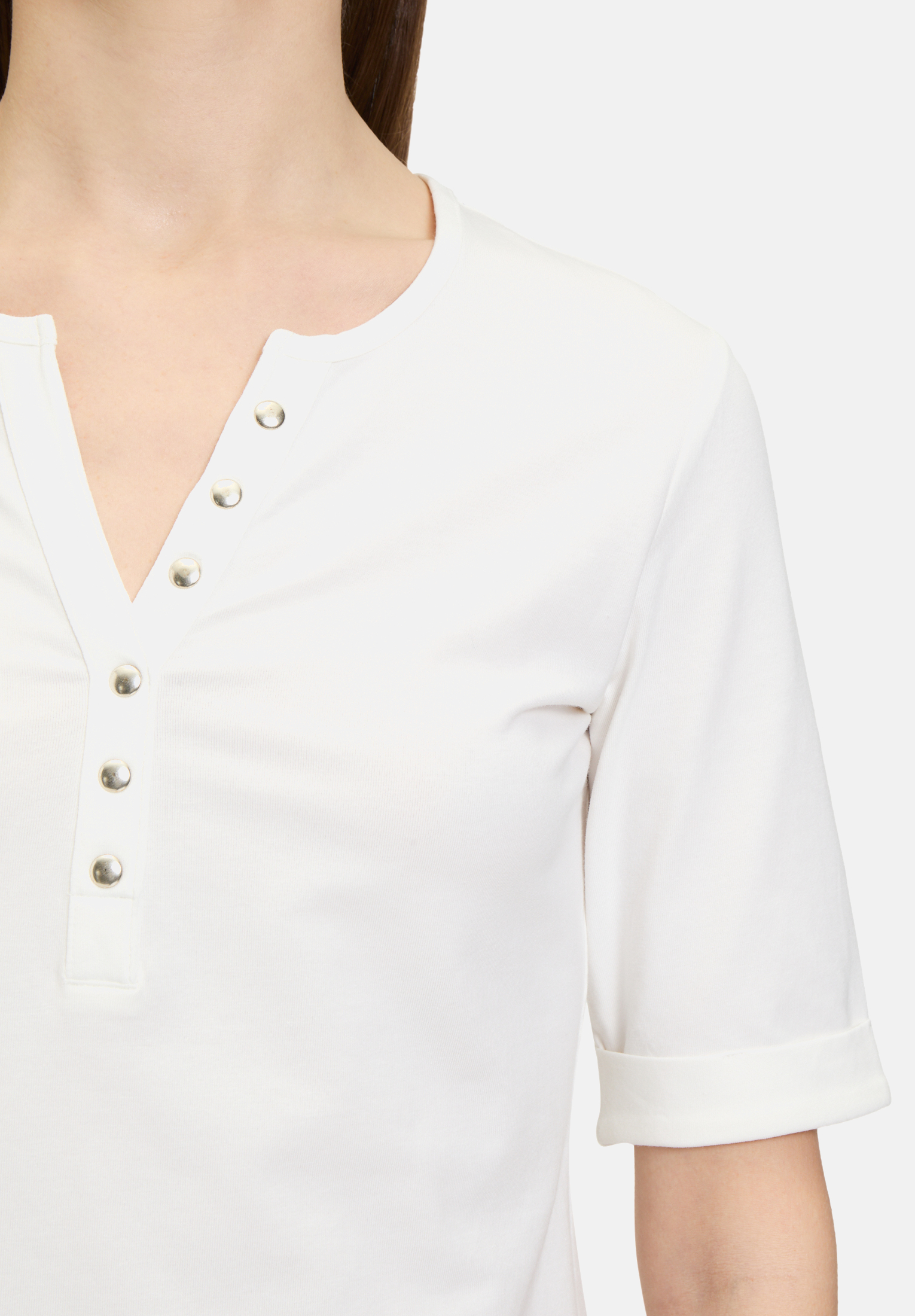 Слегка приталенная базовая рубашка с короткими рукавами и круглым вырезом впечатляет своим простым однотонным дизайном. Планка с пуговицами добавляет дополнительный акцент и придаёт рубашке современный вид. Облегающий крой выгодно подчеркивает фигуру и делает её идеальным повседневным предметом гардероба, который можно комбинировать с различными образами.