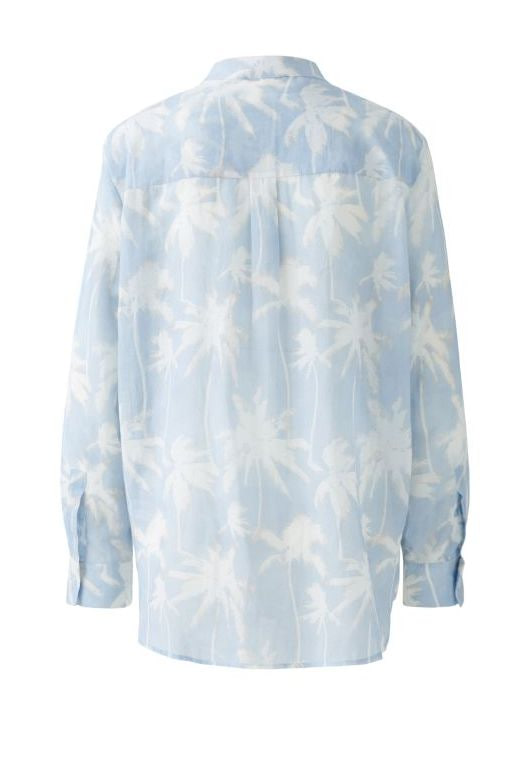 Рубашка с длинными рукавами, выполненная в нежном голубом оттенке. Ткань полупрозрачная, на нее нанесен изысканный принт в виде белых пальмовых листьев. Рубашка имеет классический воротник и застежку на пуговицах, длинные рукава можно закатать, чтобы придать образу более расслабленный и непринужденный вид.