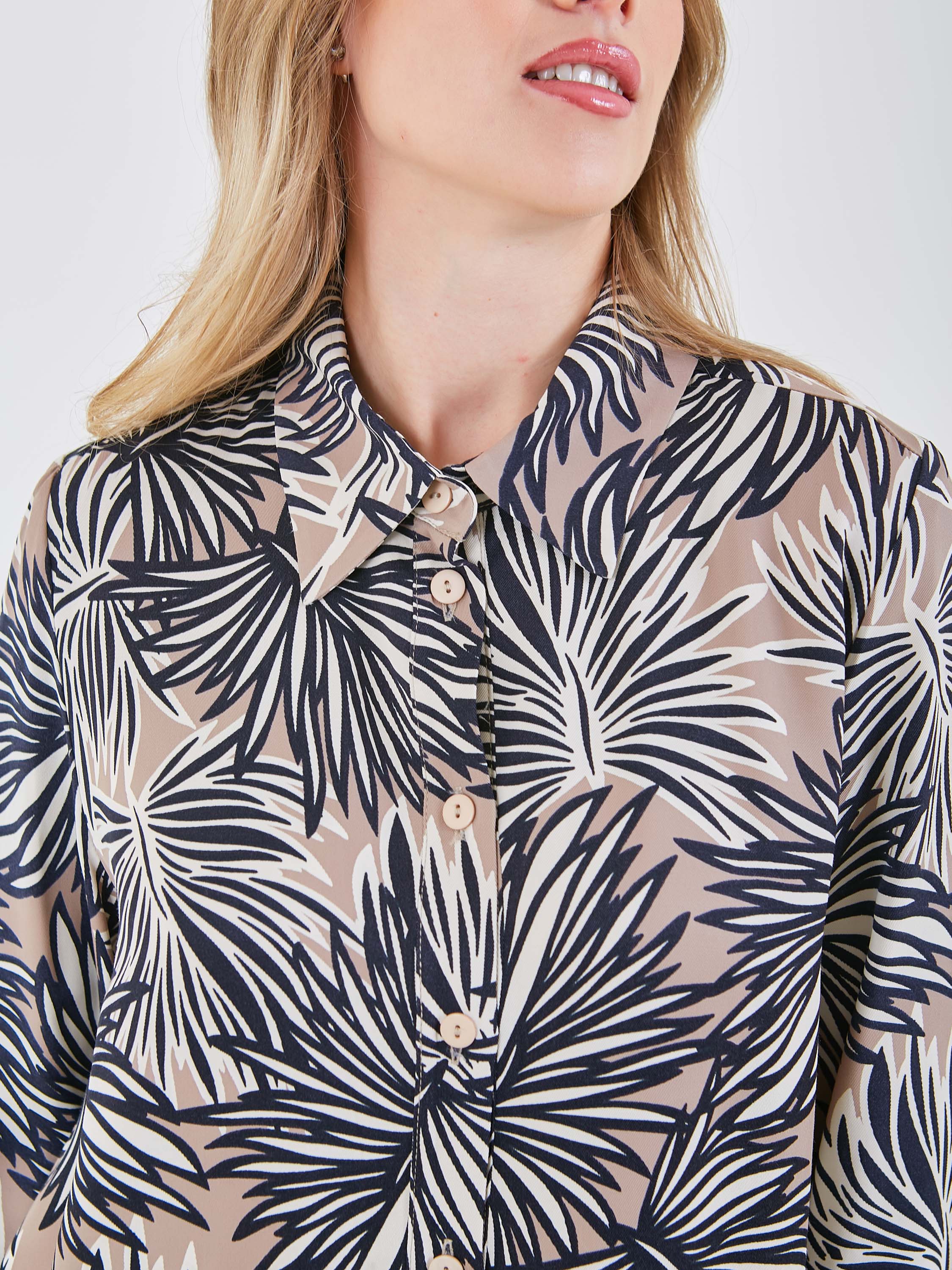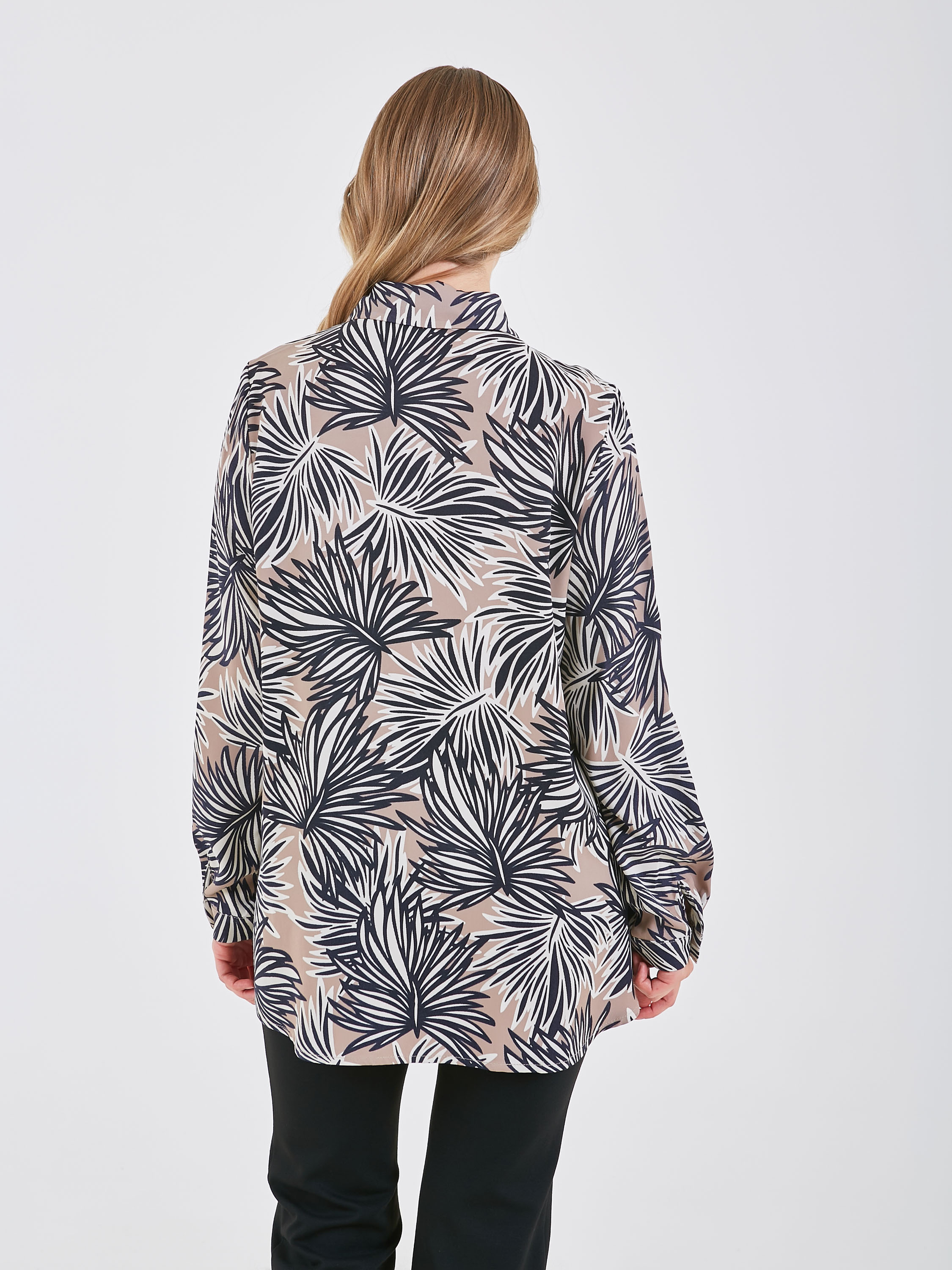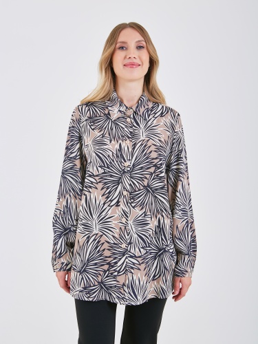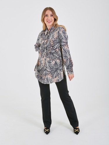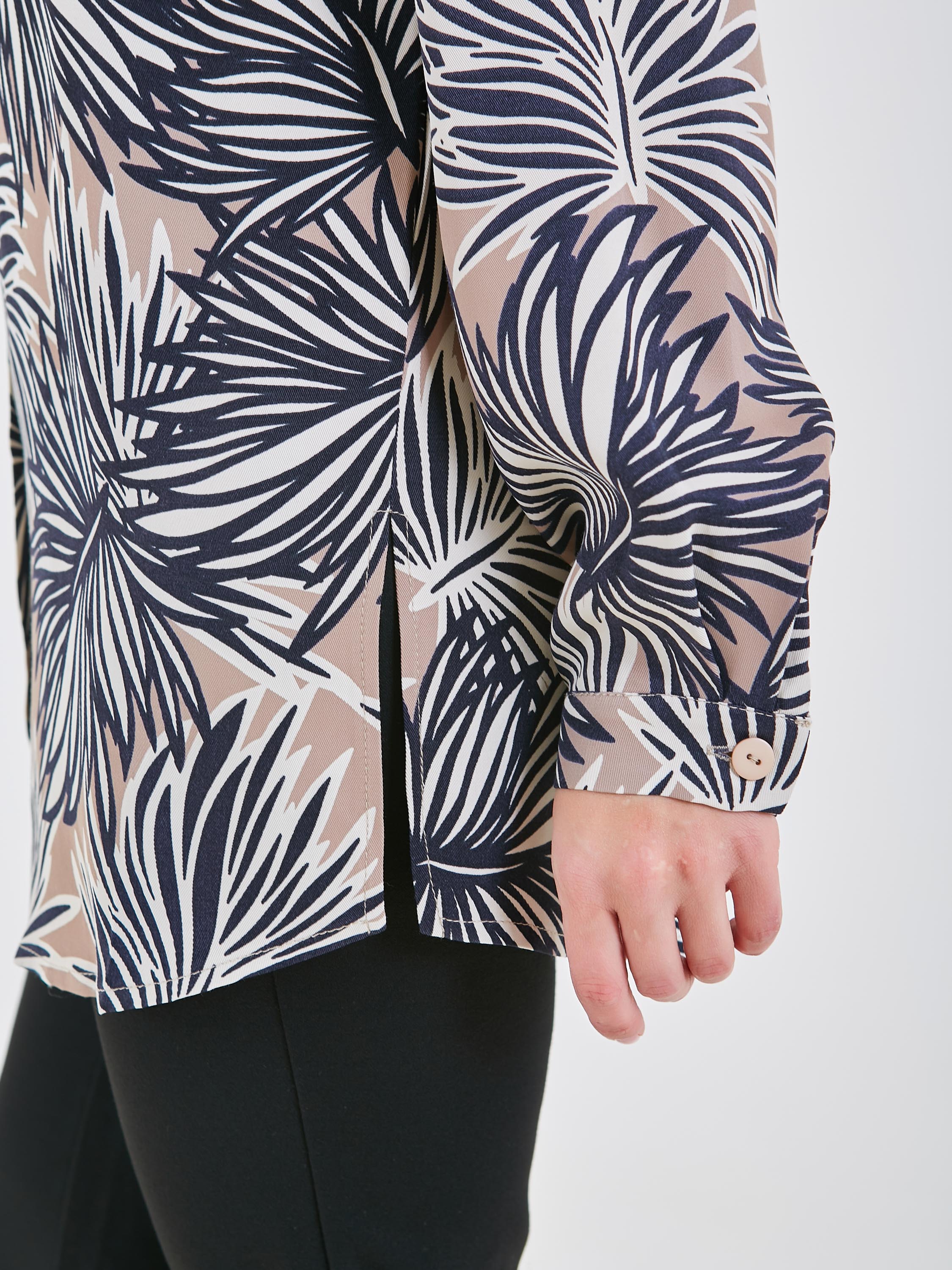 Удлиненная блузка с контрастным рисунком и боковыми разрезами. Рукава с манжетами на пуговицах. Осень-Зима'25/26. Капсула "Малахитовая шкатулка"