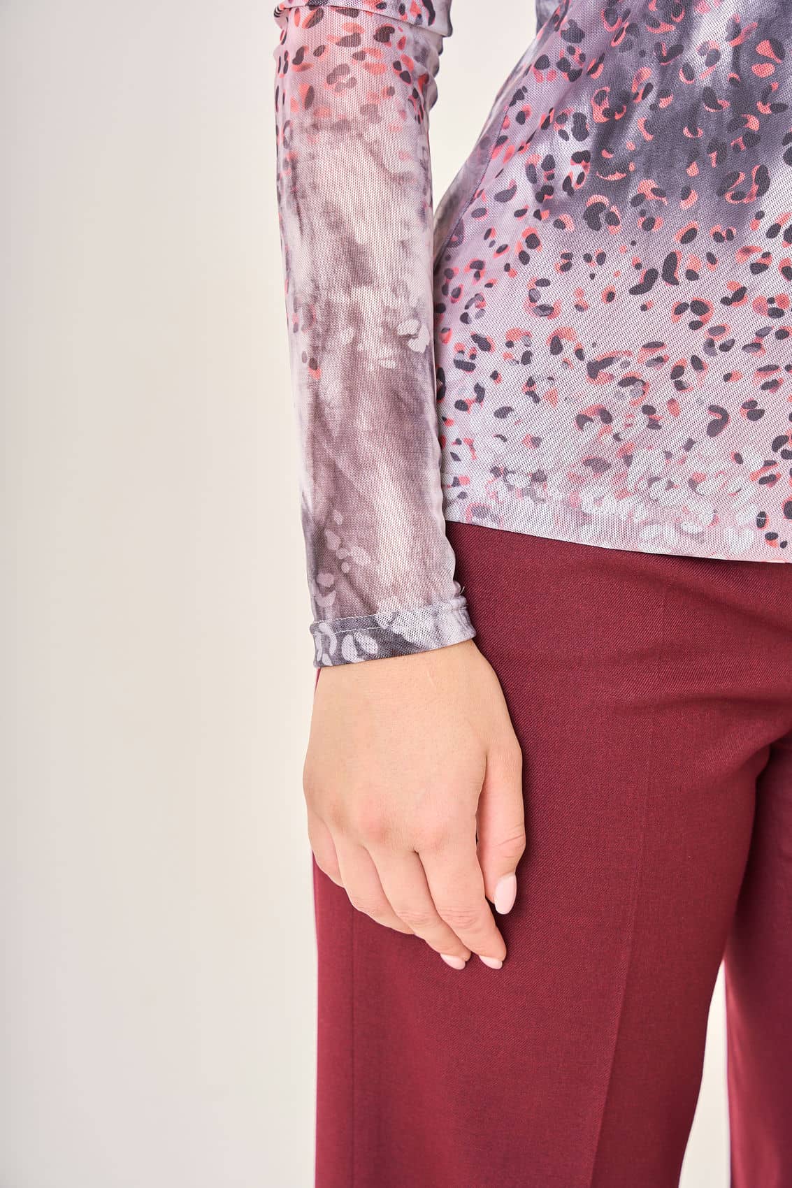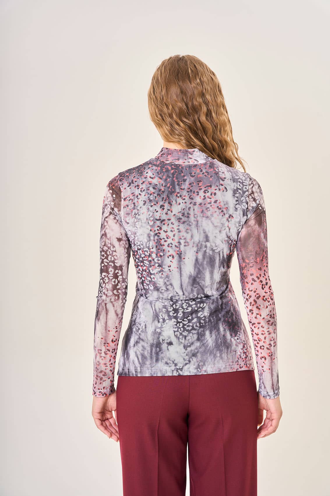 Женская облегающая блузка с длинными рукавами и воротником-стойкой. Сложная цветовая гамма с размытыми пятнами серого, белого и розового оттенков создает глубину и выразительность. Мелкий принт в виде леопардовых пятен, выполненный в различных оттенках розового и серого, добавляет изделию уникальности и стиля. Натуральная ткань приятно прилегает к коже, подчеркивая красоту фигуры.Осень-Зима'25/26. Капсула "Вишневый сад"