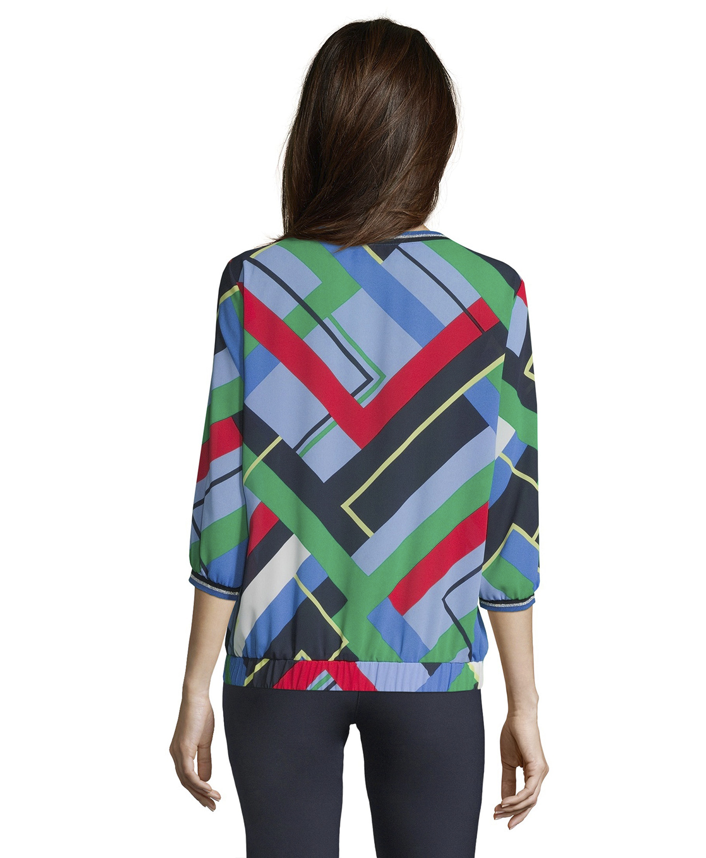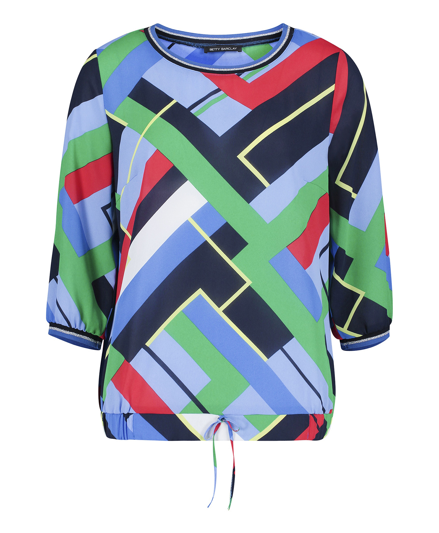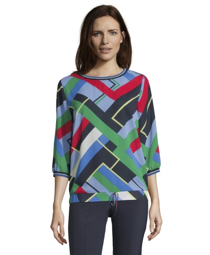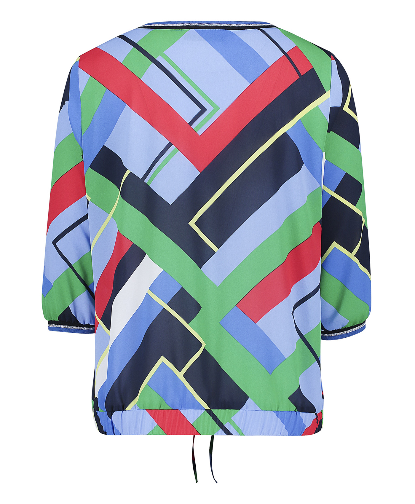 Новая вариация трендового принта колор-блок. Блуза свободного кроя собрана на бедрах эластичной лентой. Круглый вырез горловины, рукава 3/4. Блестящая нить люрекса в отделке горловины и манжет придает образу нотку гламура. Блуза отлично смотрится с любым однотонным вариантом низа и любой обувью.