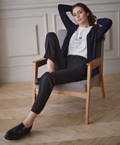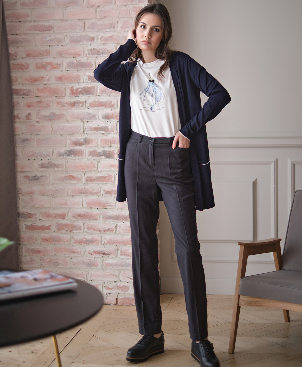 Классические брюки прямого кроя - базовая модель, предполагающая множество различных сочетаний. Удобная средняя посадка, застежка-молния спереди, карманы спереди. Стрелки визуально увеличивают рост. Интересный принт разбавляет классический образ.