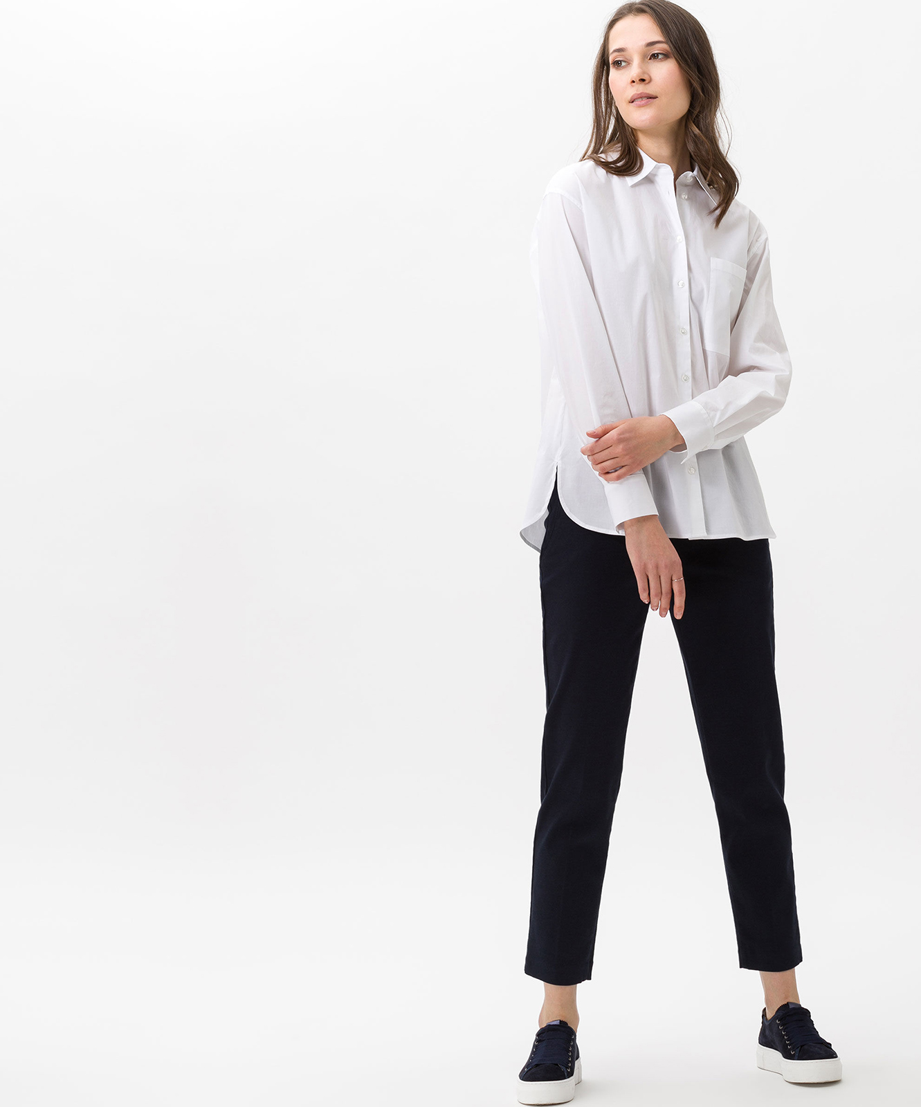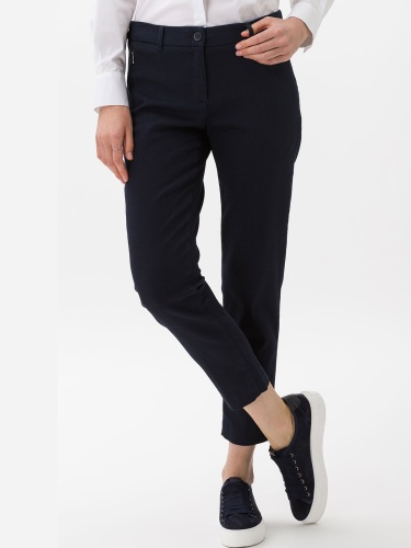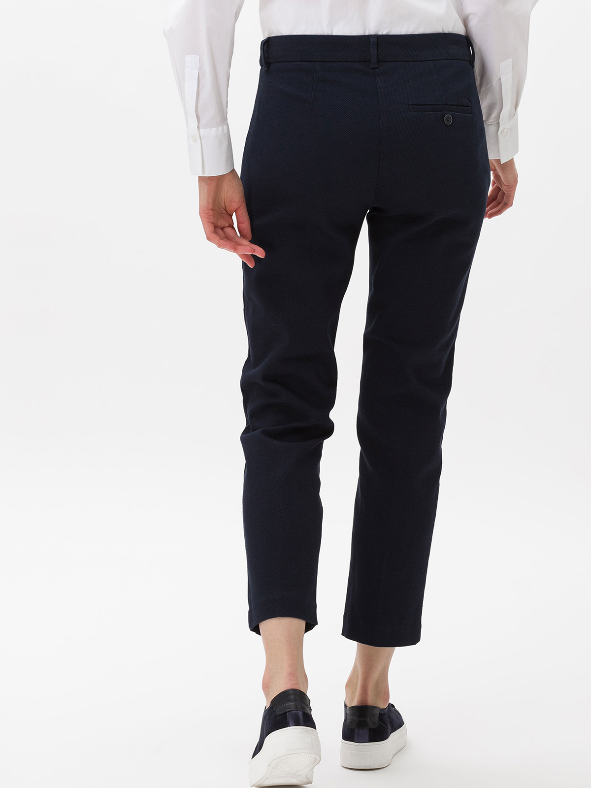 Укороченные брюки в темно-синем оттенке. Комфортная средняя посадка, притачной пояс со шлевками, застежка на скрытую молнию и пуговицу. Брюки можно удачно сочетать с рубашкой, джемпером или жакетом.